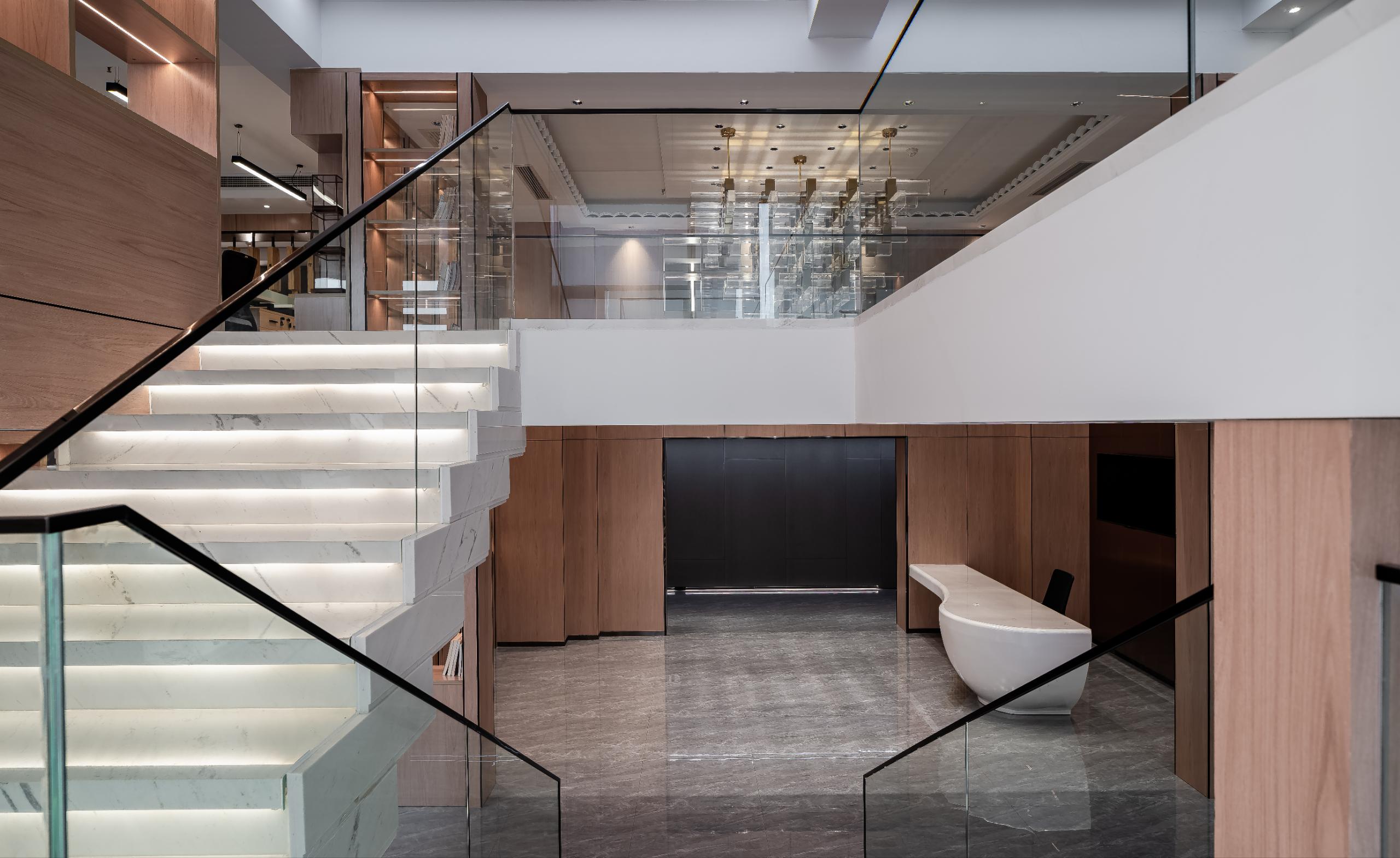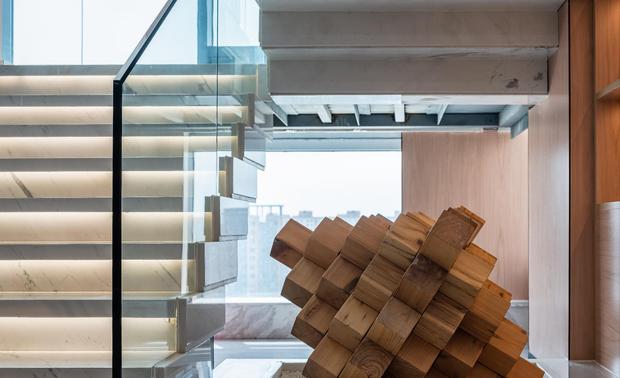 白色石材的楼梯踏步空明澄澈,袅袅浮空,写意建筑诗歌。以鲁班锁为图腾增加空间趣味感。