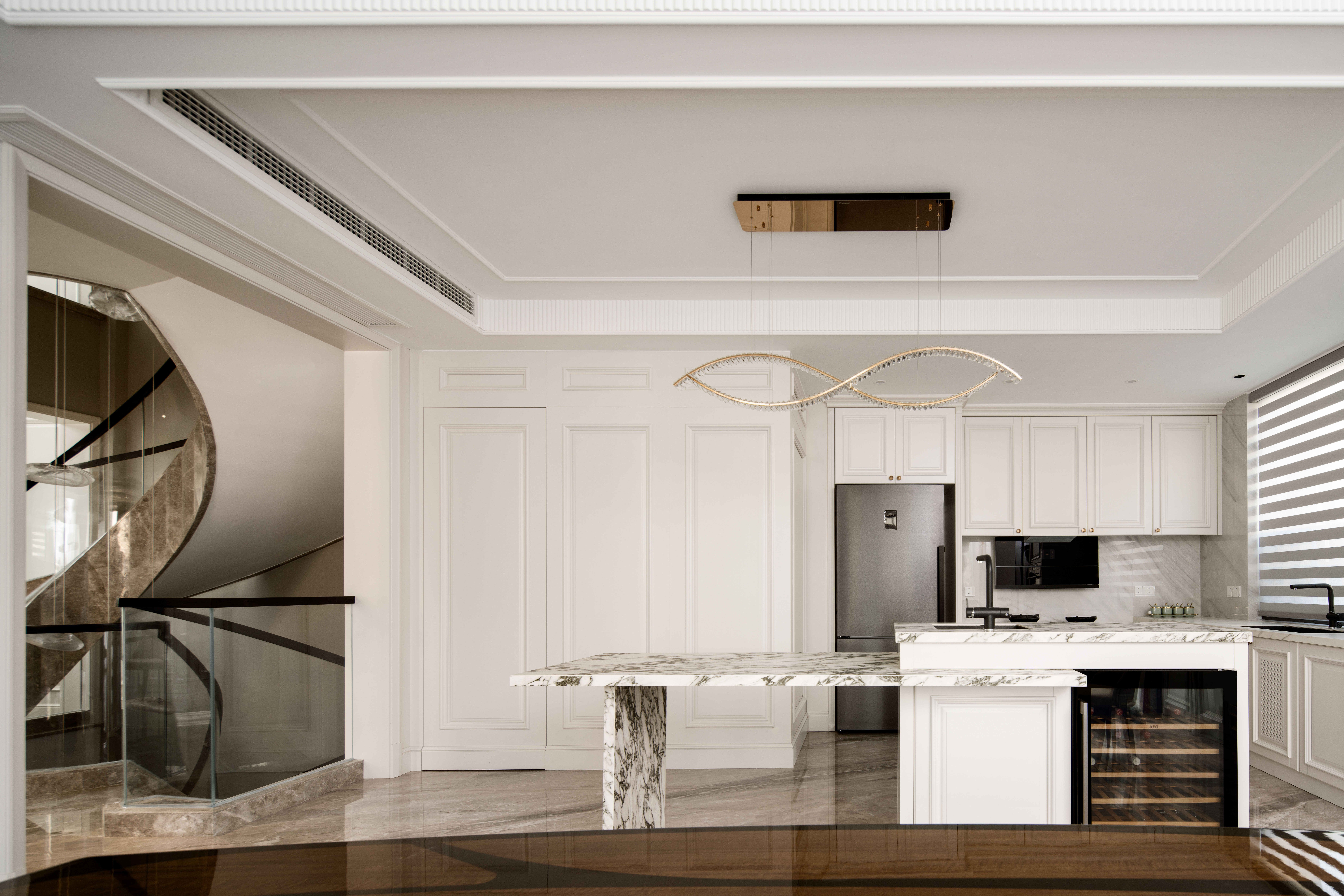 设计选材:美式的经典墙板与大理石纹砖的搭配