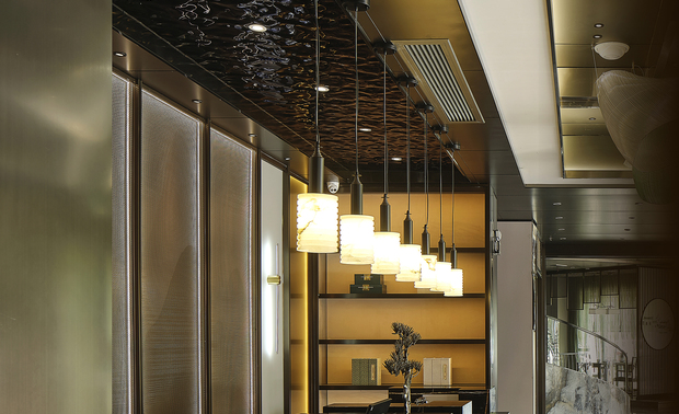 设计选材:流水石、假山、发光夹丝玻璃、金属吊挂、木饰面、石材,现代与仿古,刚劲与柔和碰撞,流水的灯光使静态的材料活了起来,充满生机展示着人与自然的平衡之美,表达出文明生生不息的孕育,形成人与自然和谐共生的理念。
