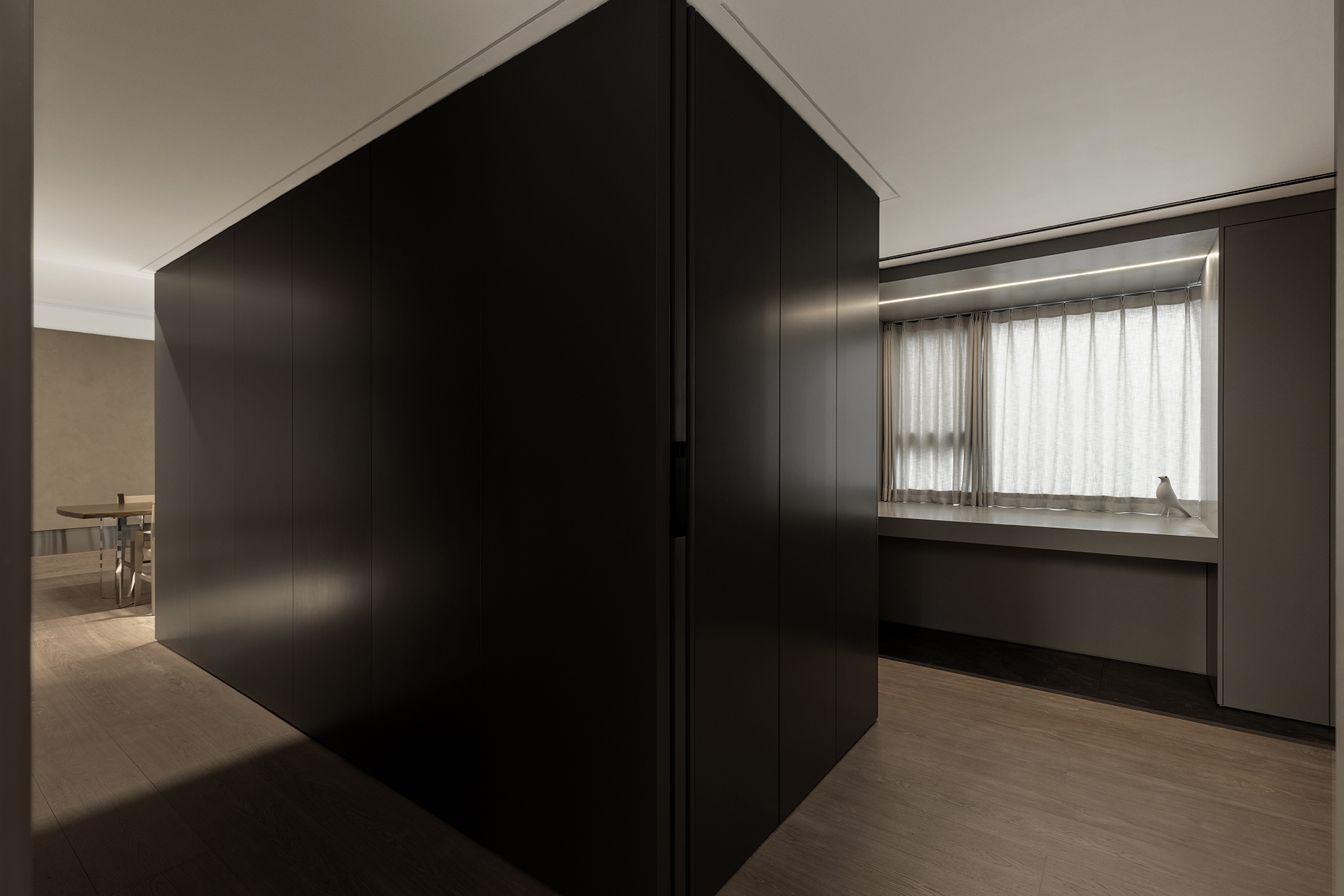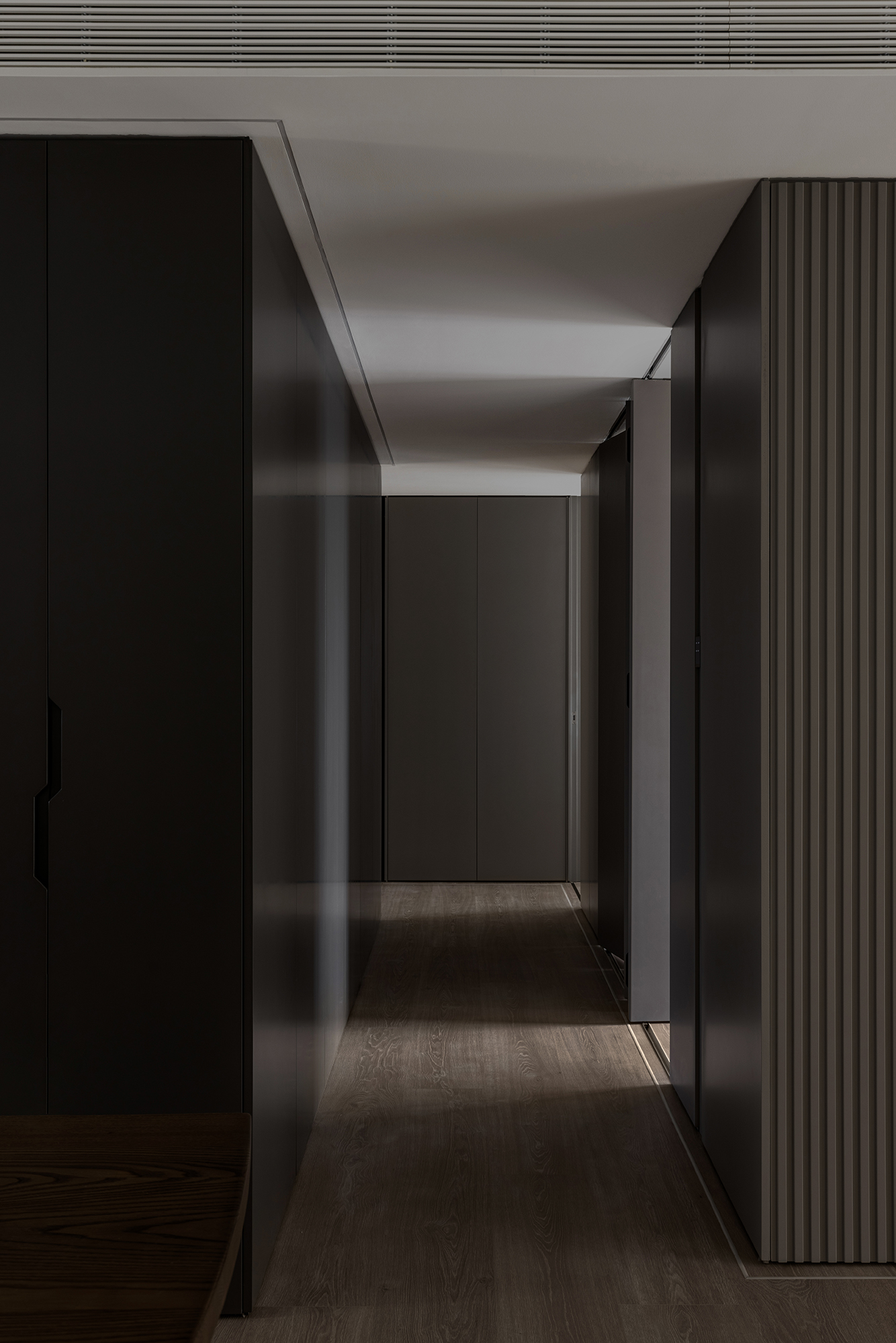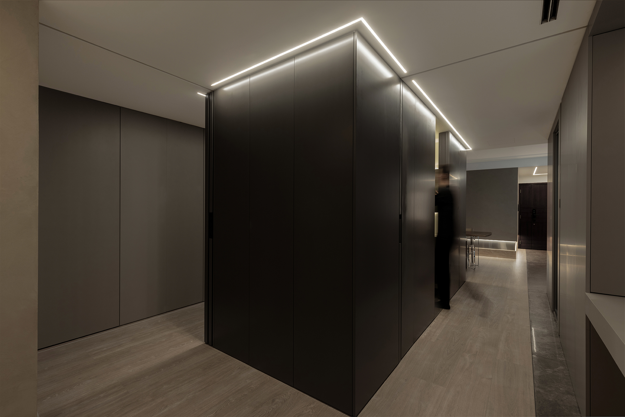 空间意境:本案将深色与暗调贯穿整屋,小范围重构空间格局,在满足屋主对于生活动线和储物空间的基本需求之外,借助打通隔墙形成的长过道,增加视觉的延伸性和空间层次感。
