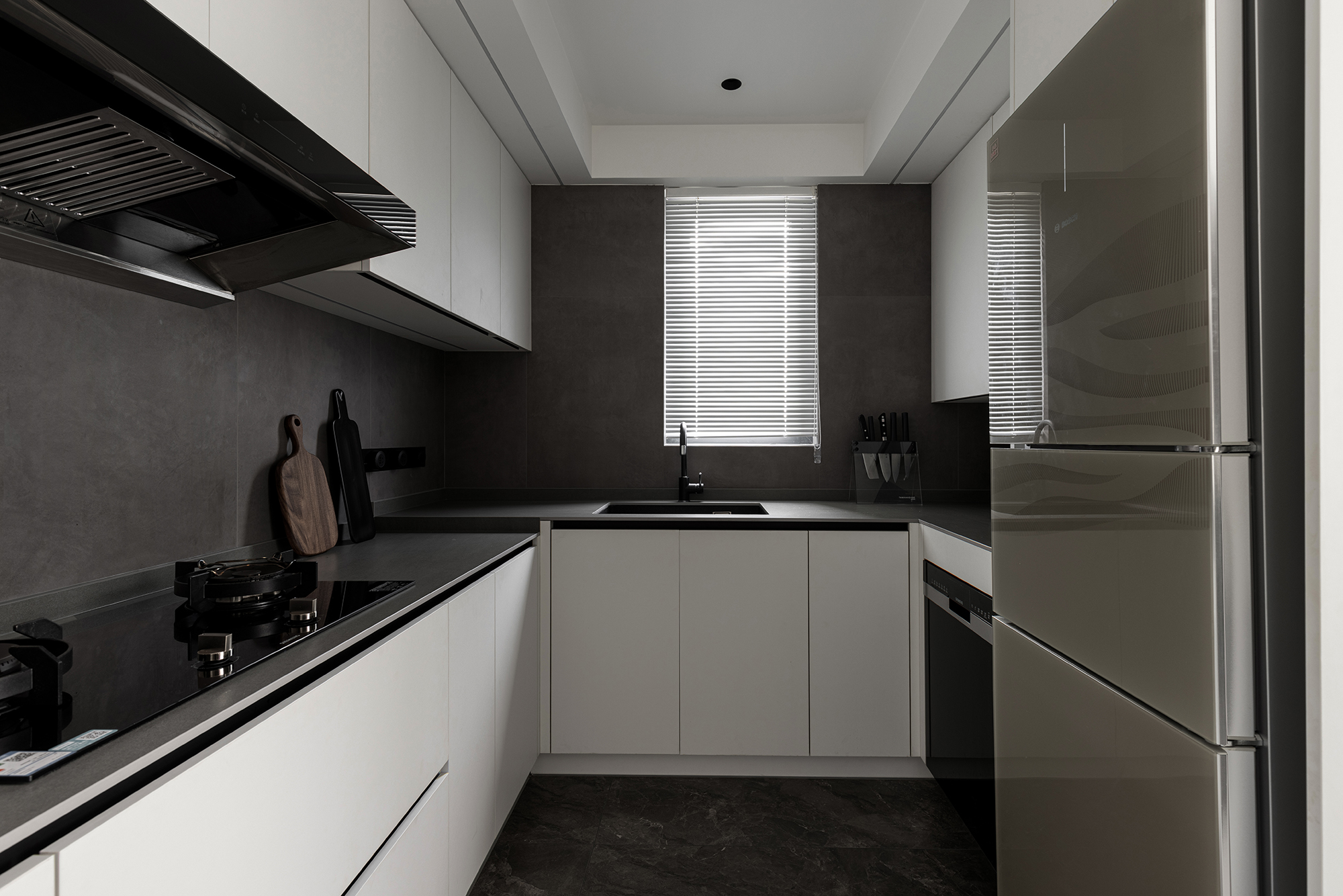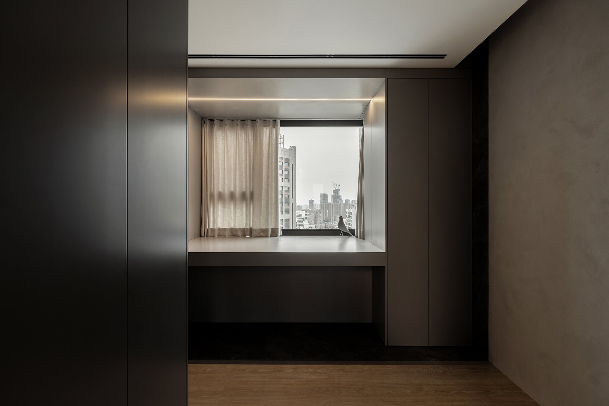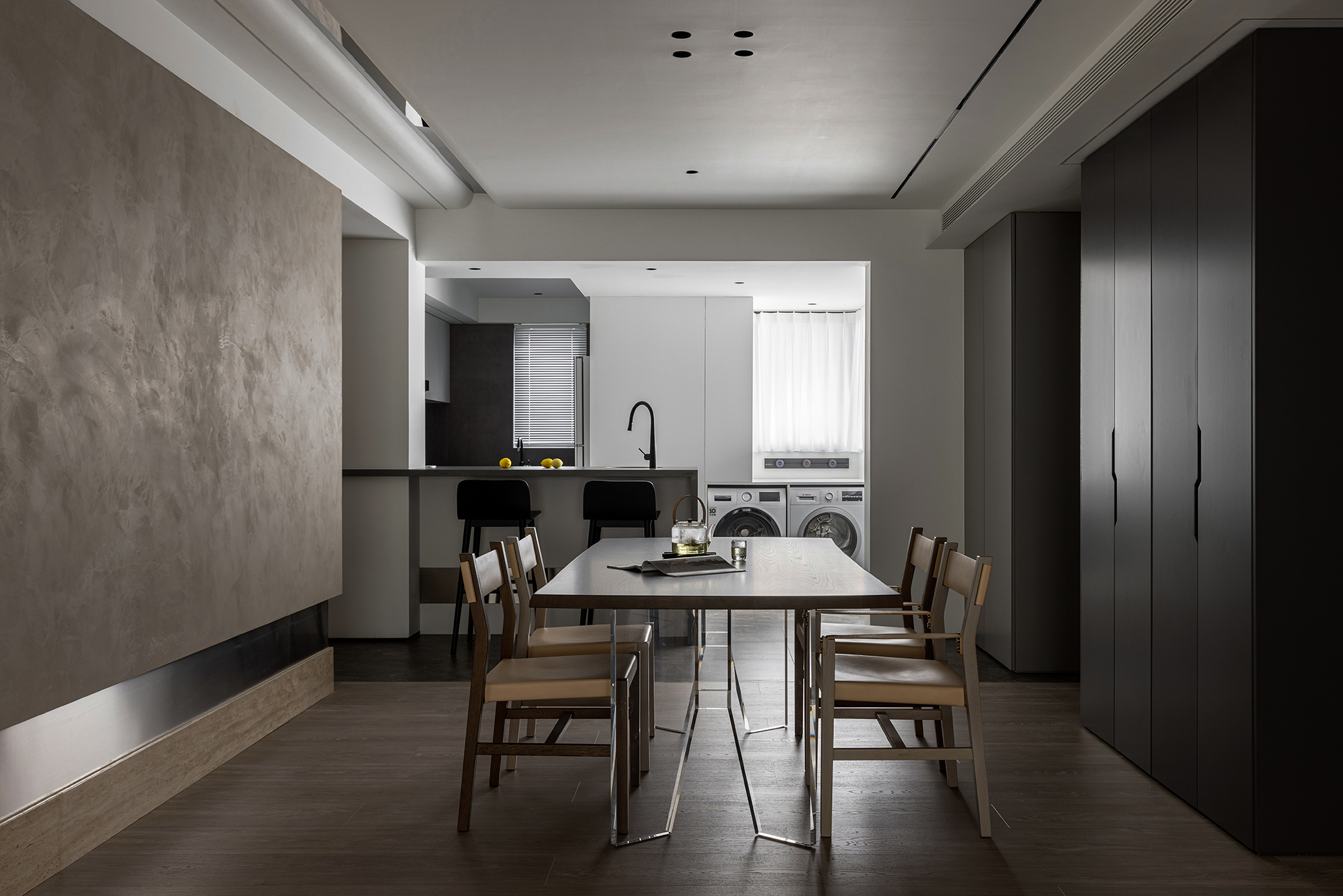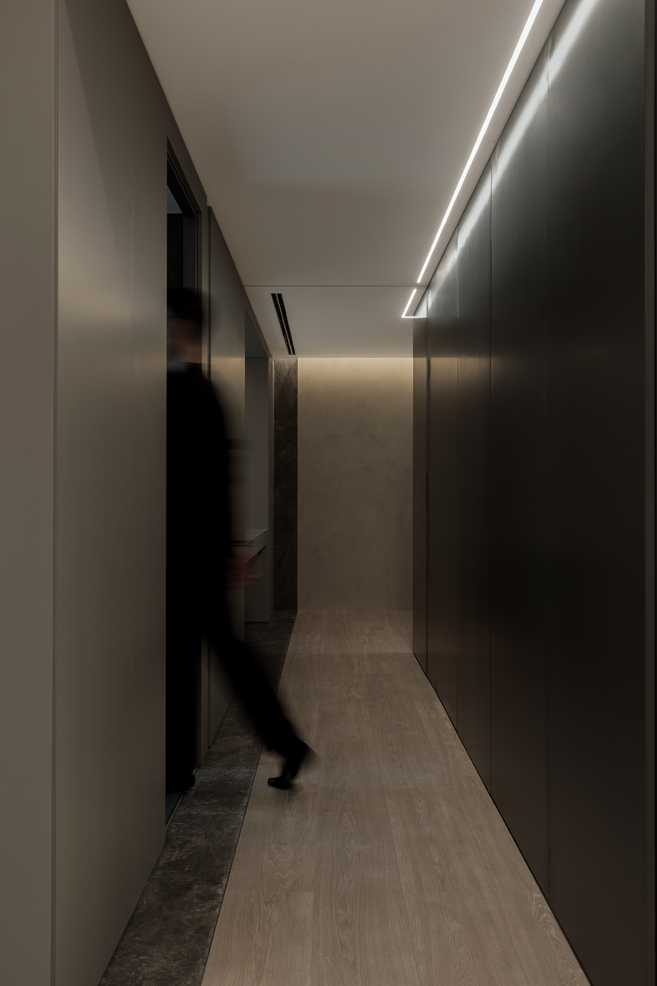 空间意境:本案将深色与暗调贯穿整屋,小范围重构空间格局,在满足屋主对于生活动线和储物空间的基本需求之外,借助打通隔墙形成的长过道,增加视觉的延伸性和空间层次感。