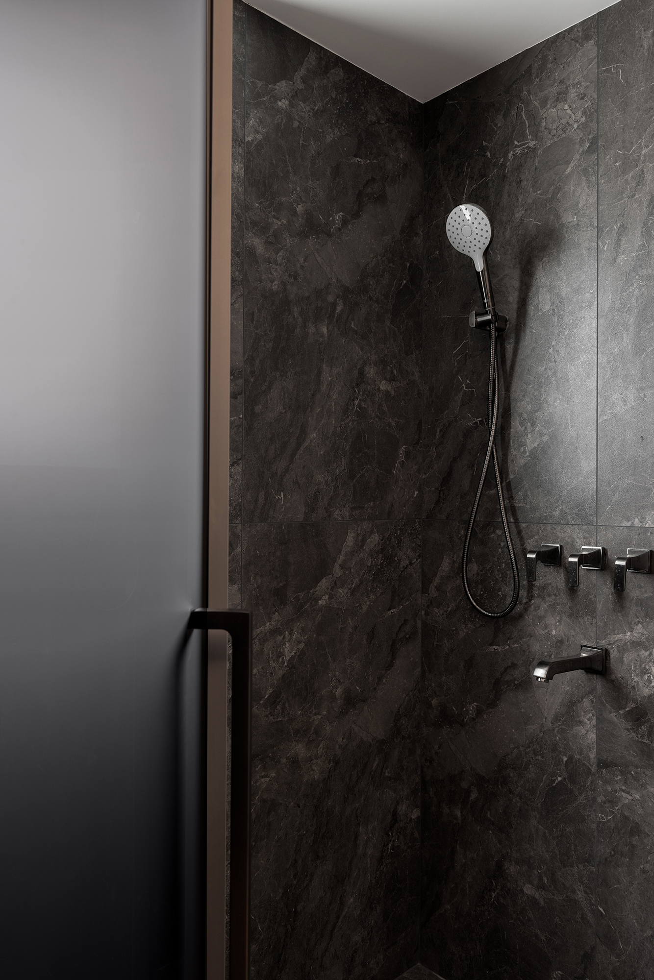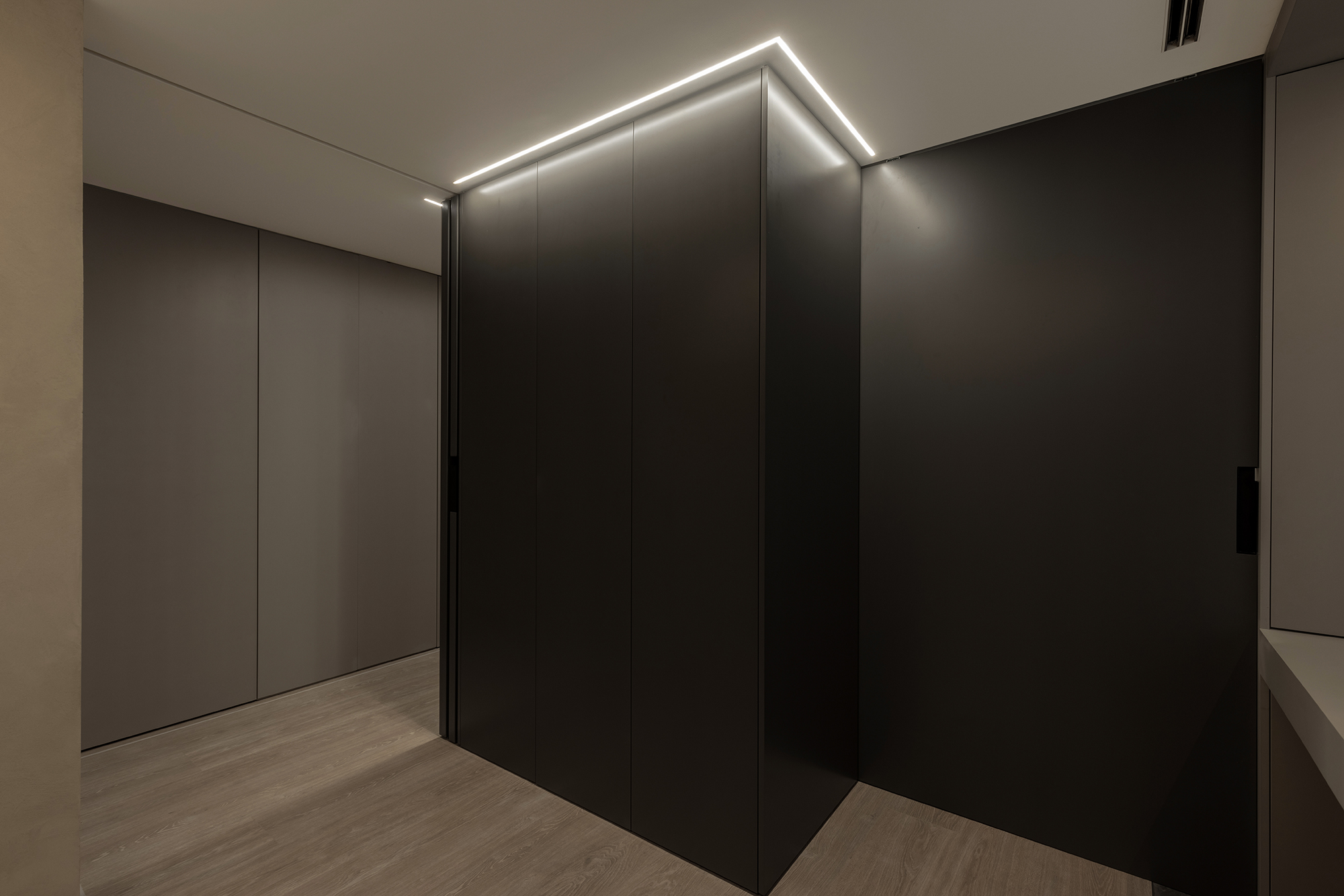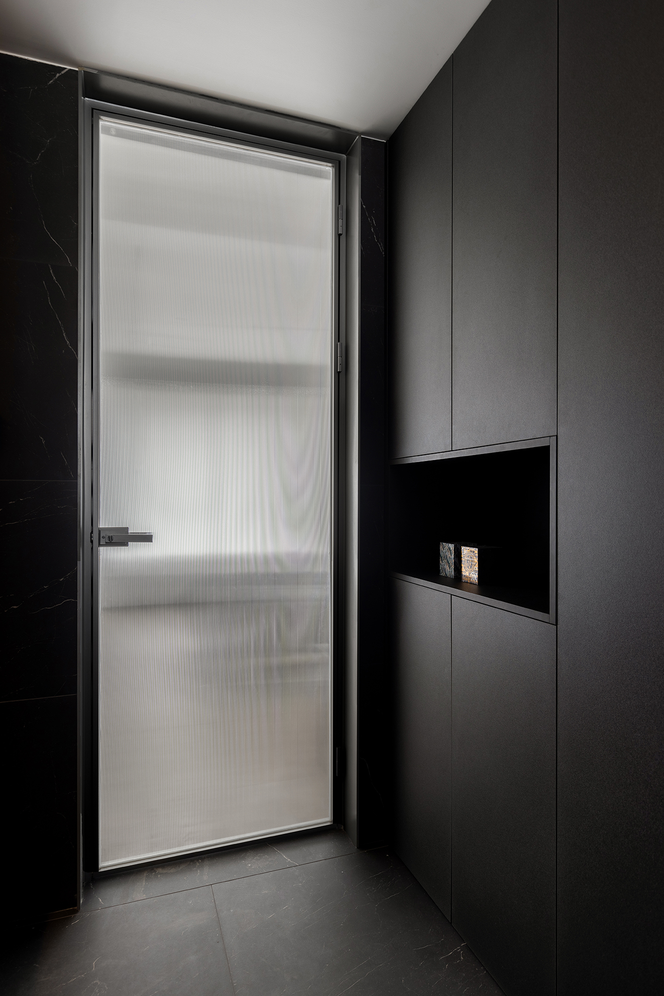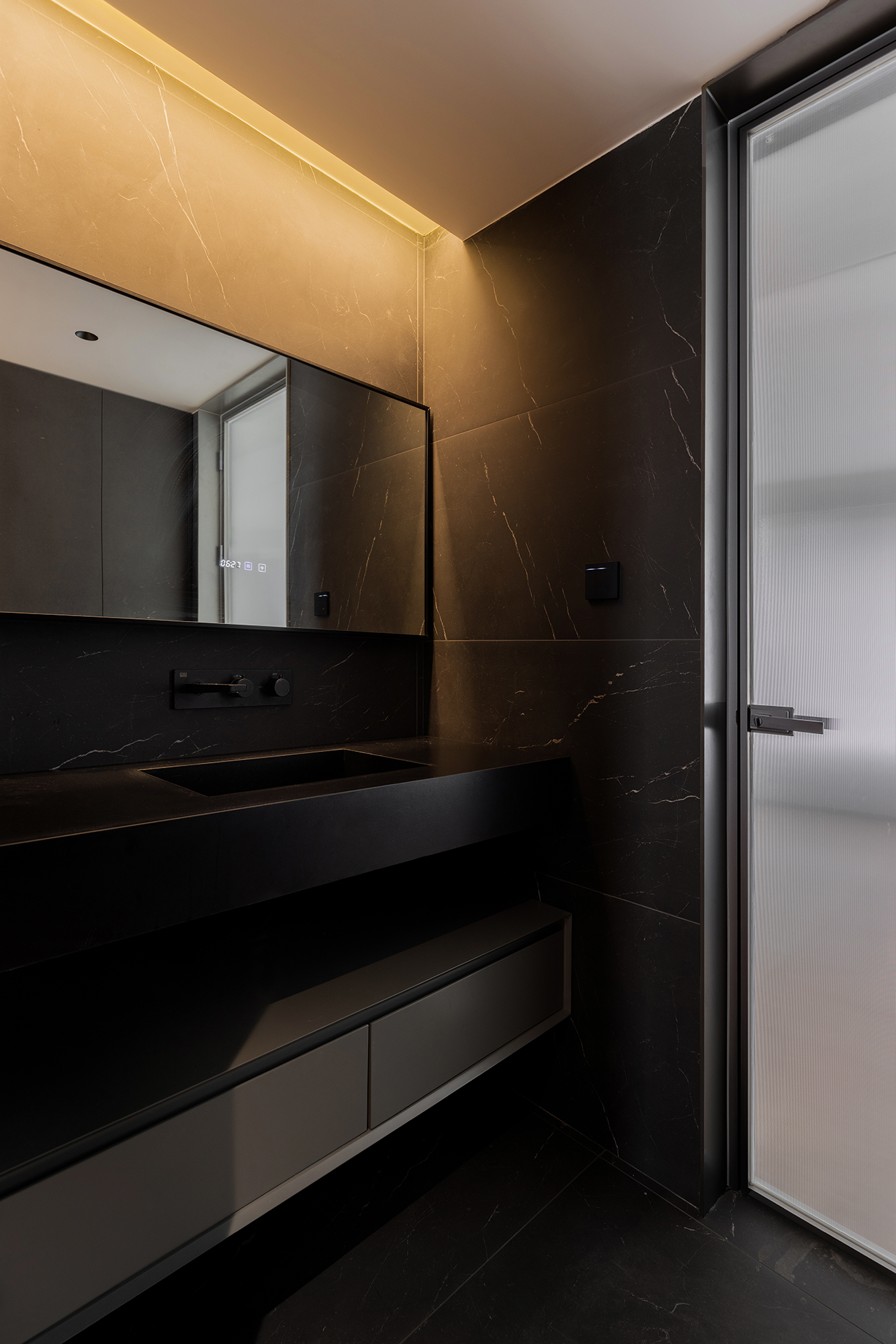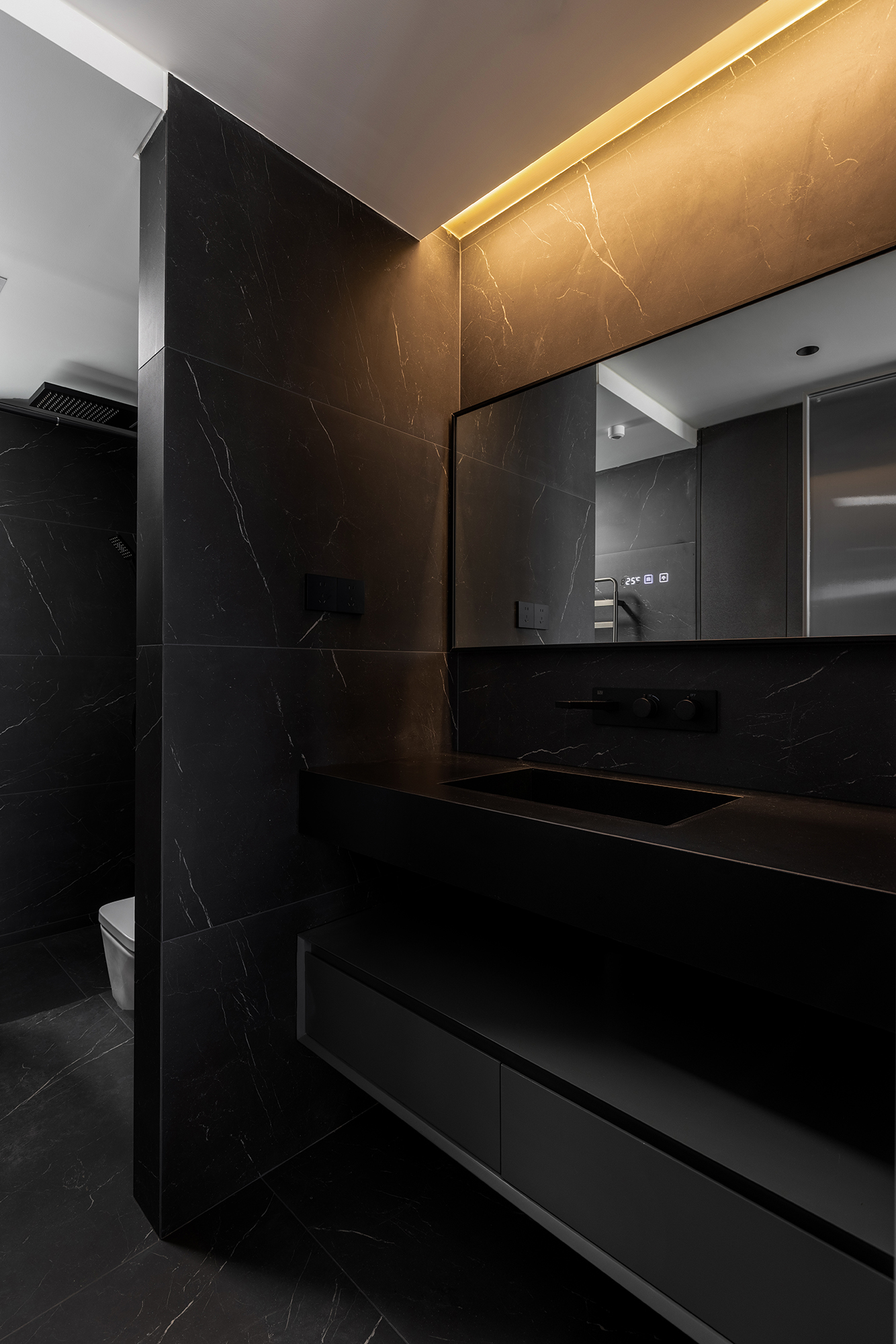 卫生间延续了整体空间的黑与白,用间接暖光中和黑色基调,用简洁硬朗的直线造型强化空间感。