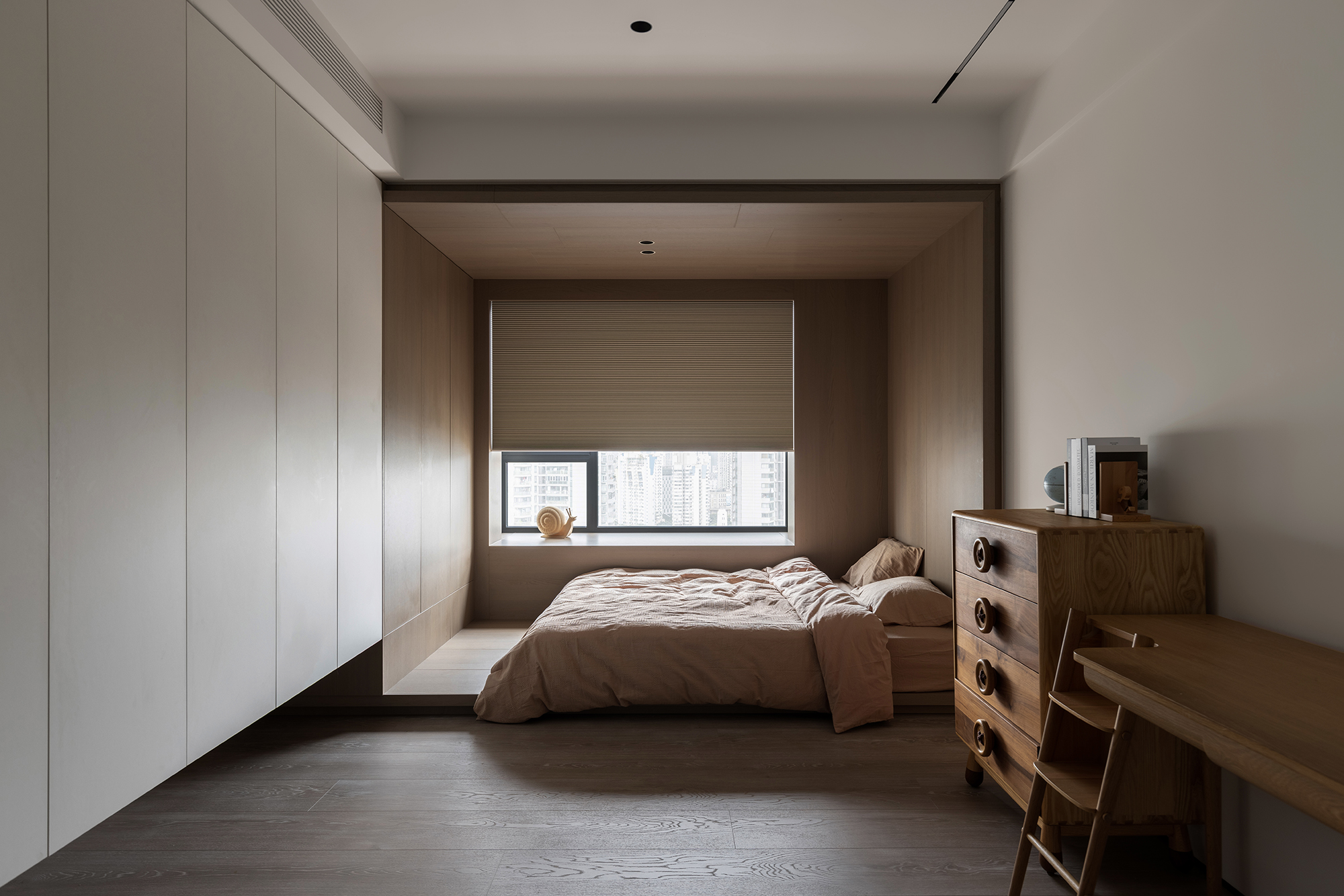 设计选材:过道尽头的区域是次卧,木质地台+墙面+吊顶,形成的「木盒子」半包围结构,给深色空间更多的木质温润感。