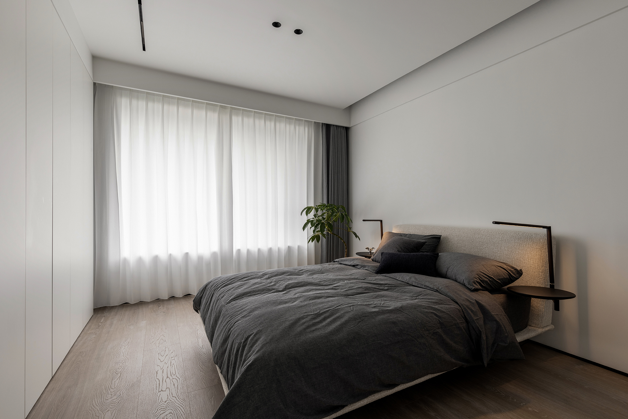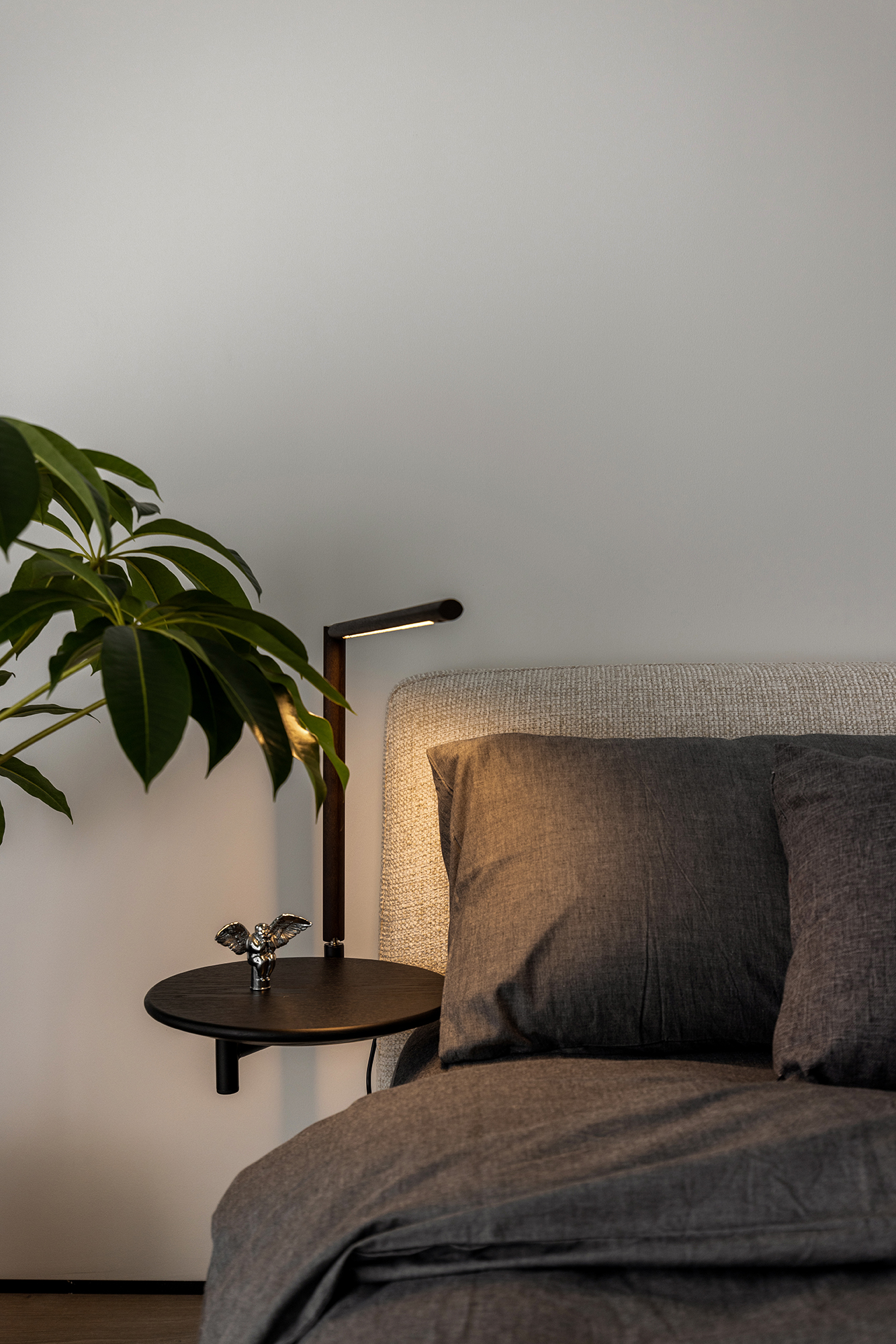 重新调整主卧主卫的结构,打造更为简单流畅的生活动线,缩减主卫面积,将多余面积打造成储物柜提高空间利用率。整体白色调让主卧跳脱出来,增加空间的清新氛围。悬浮床也是主卧轻盈感的重要因素。