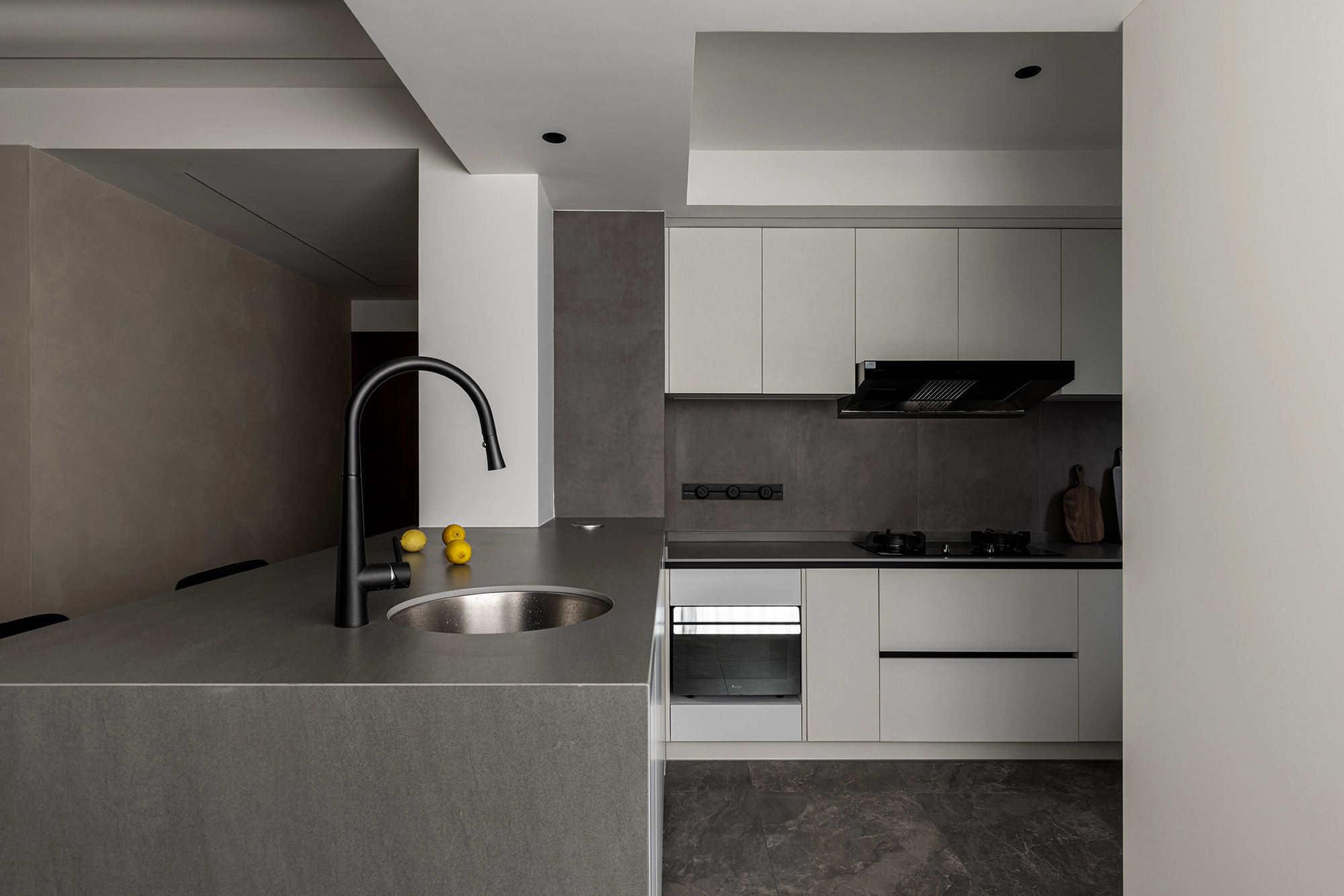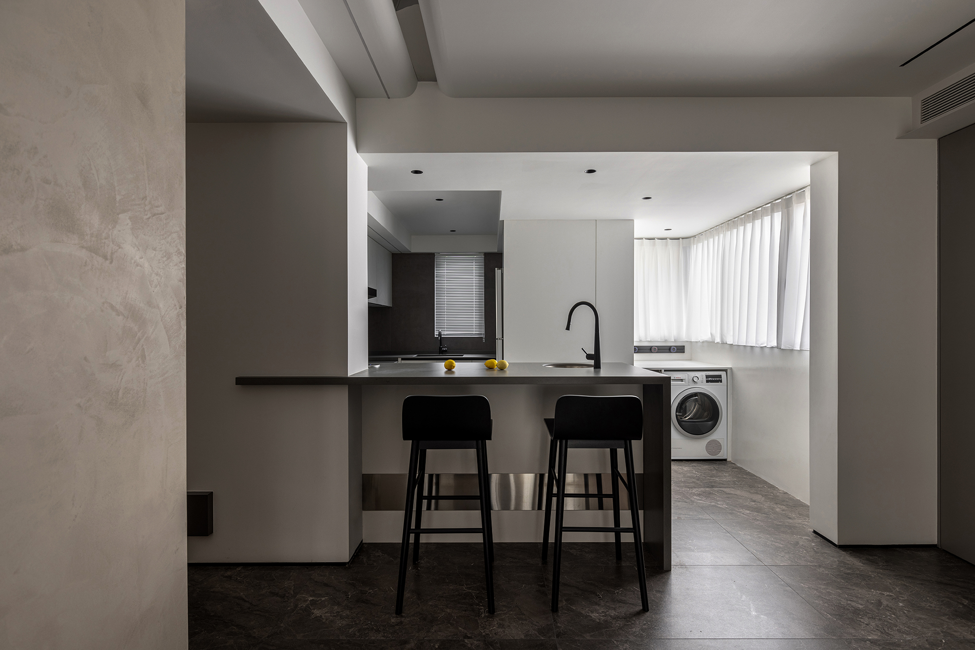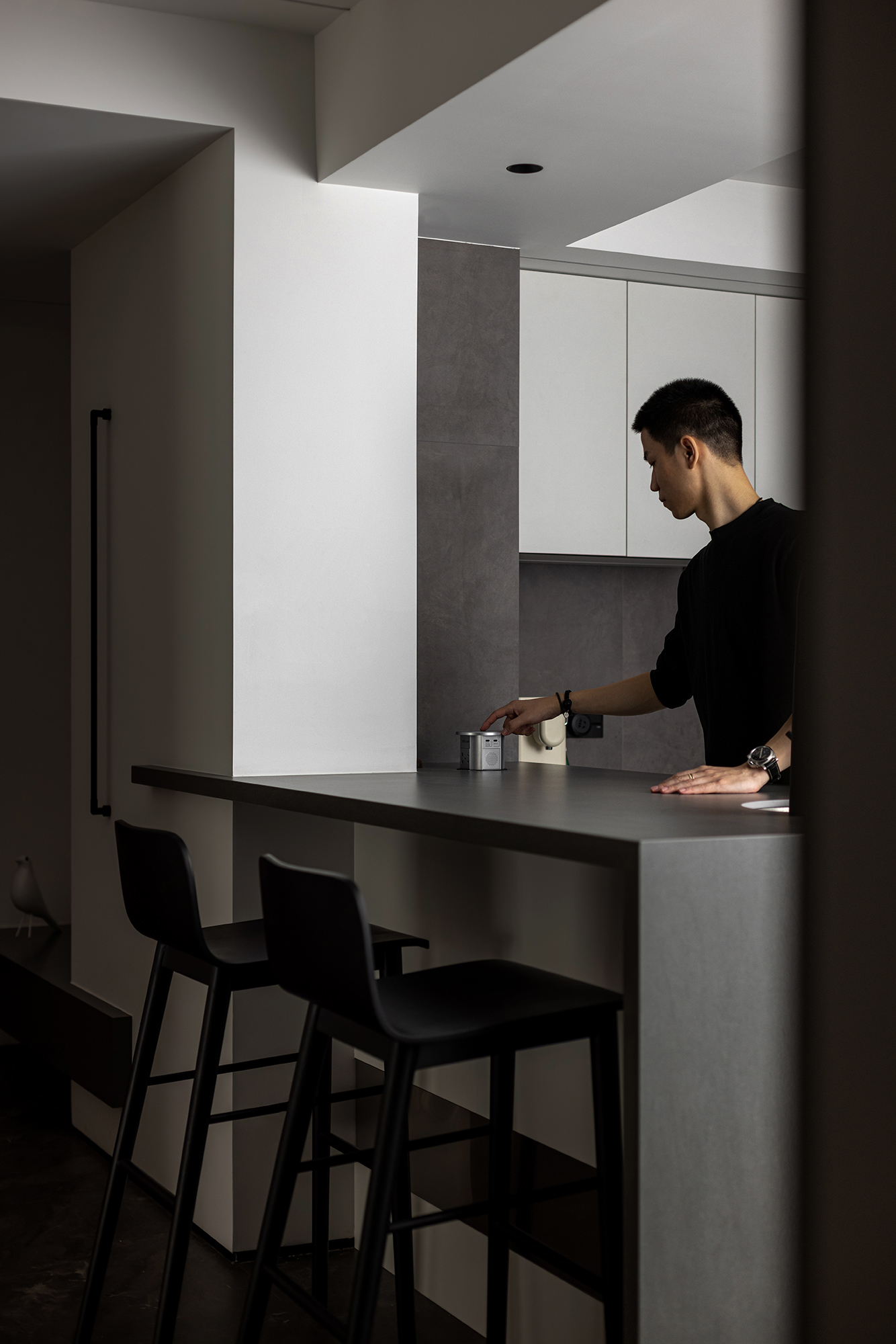 设计师去除厨房多余墙面,用吧台界定厨房区域,与餐厅形成具有一定互动感的开放式餐厨空间。