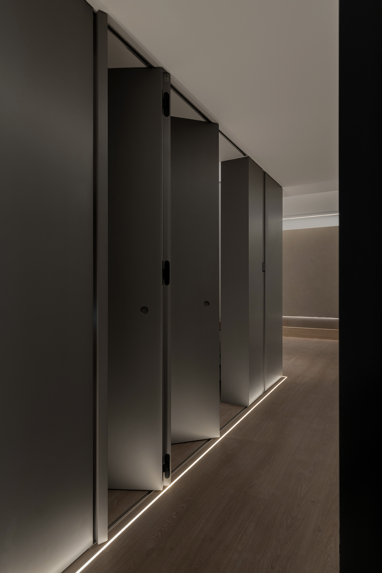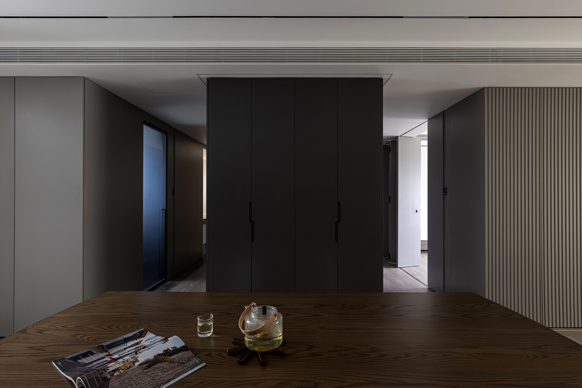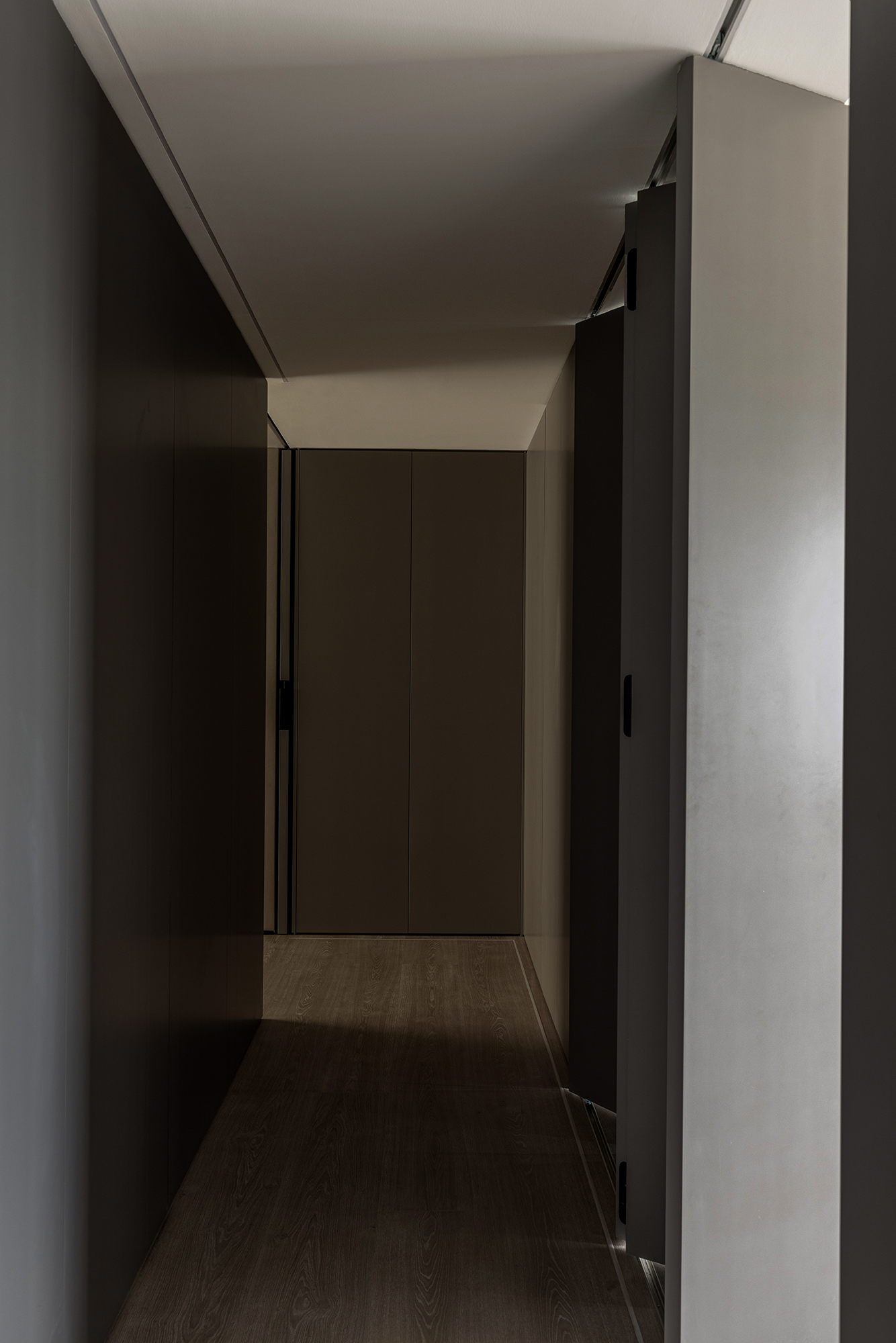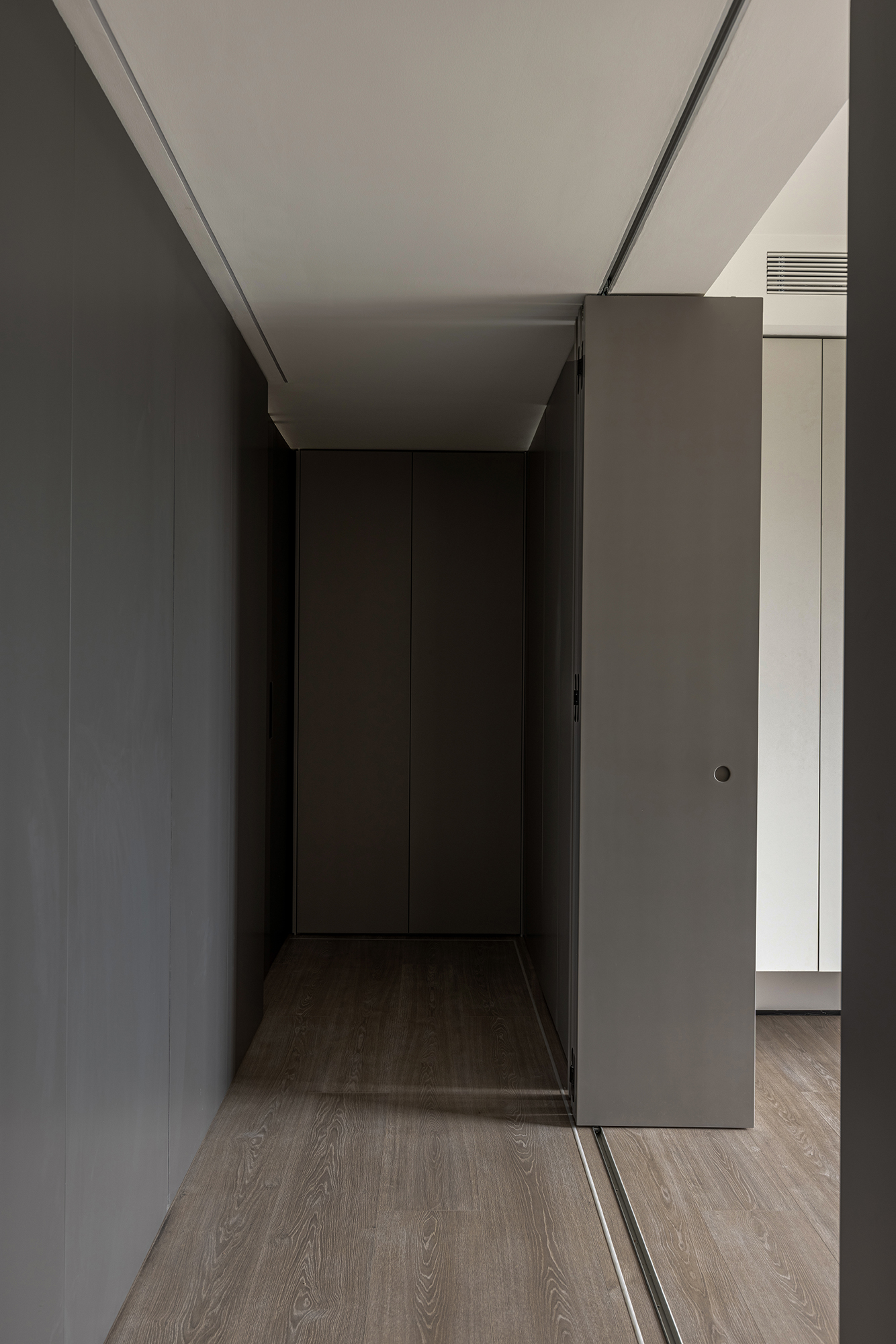 3.运用过道形成的视觉纵深,给空间更多延伸和层次感,将移门隐藏在橱柜中,可以在通透与私密间自由切换;