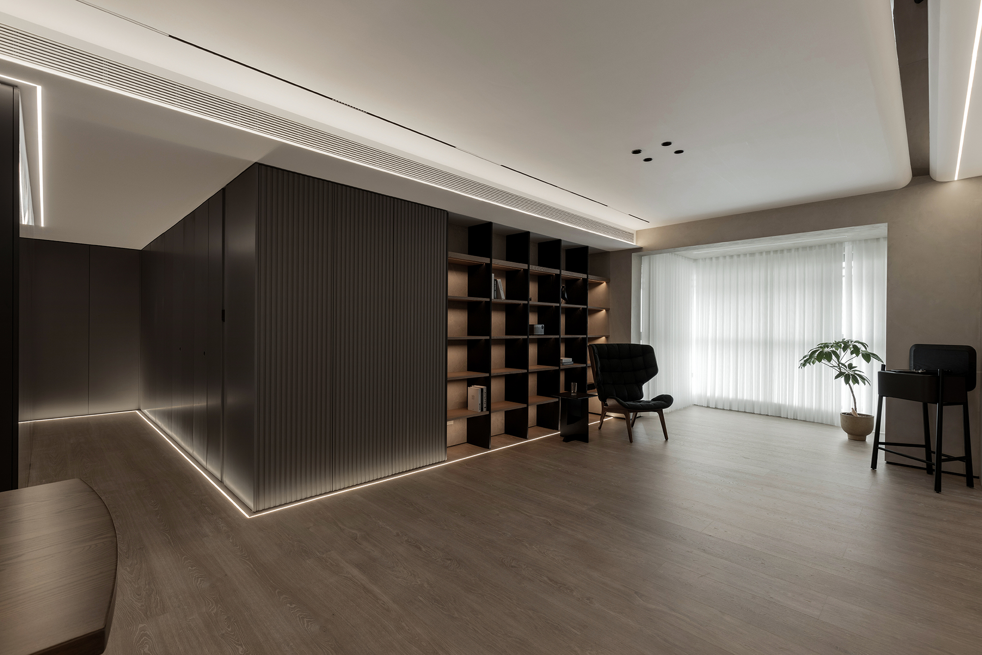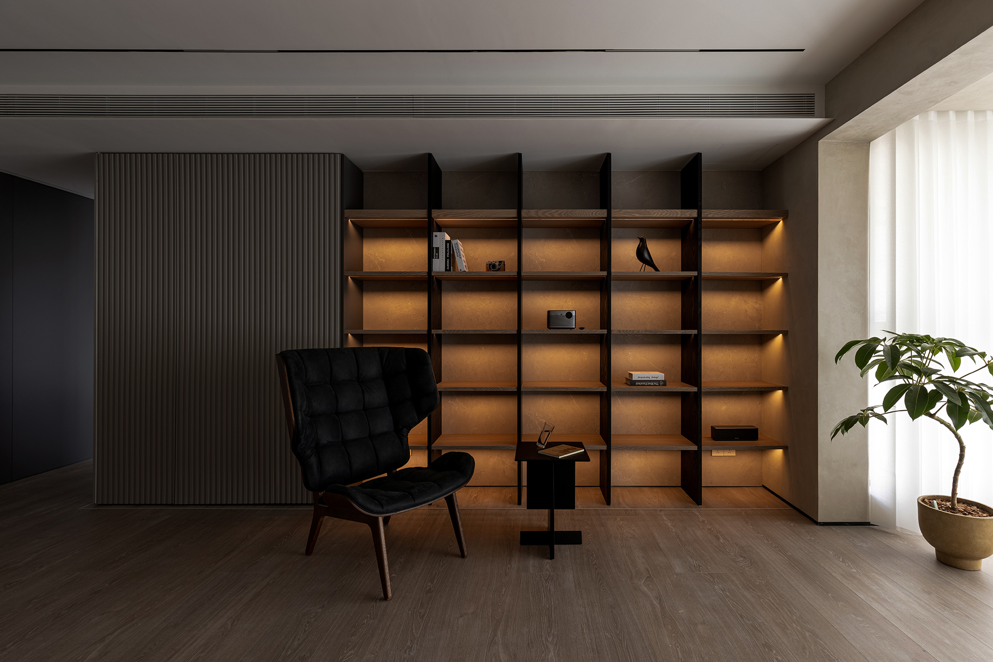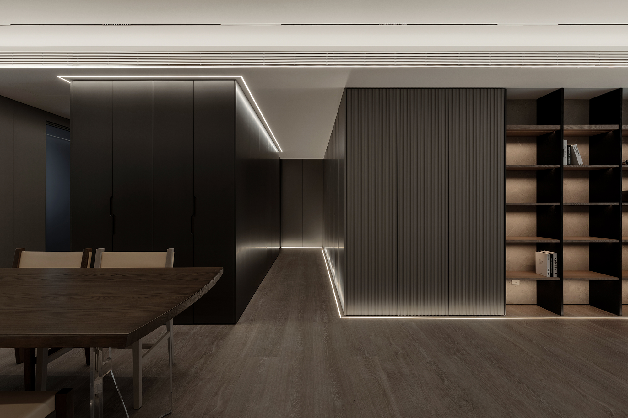 大胆摒弃传统客厅结构,用大面积开放格和整面背景墙,为整个客厅打下极致简约、深沉静谧的基调。藏在开放架中的黄色灯带,在深色背景下显得尤为温暖,中和整个空间的冷感。通过间接光源的渲染,整个客厅呈现出古朴幽玄的空间气息。