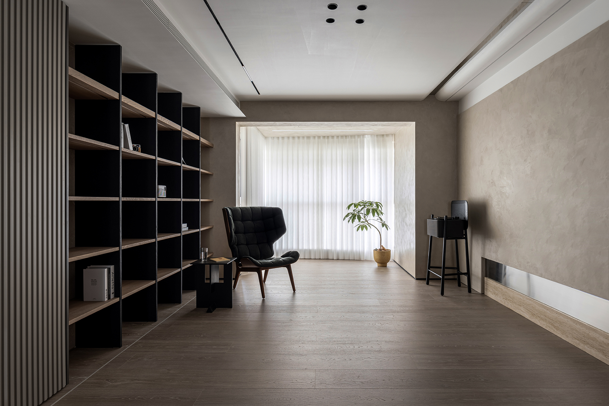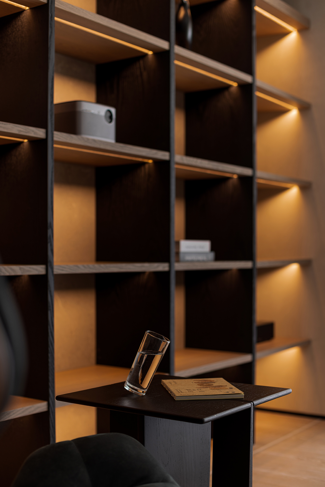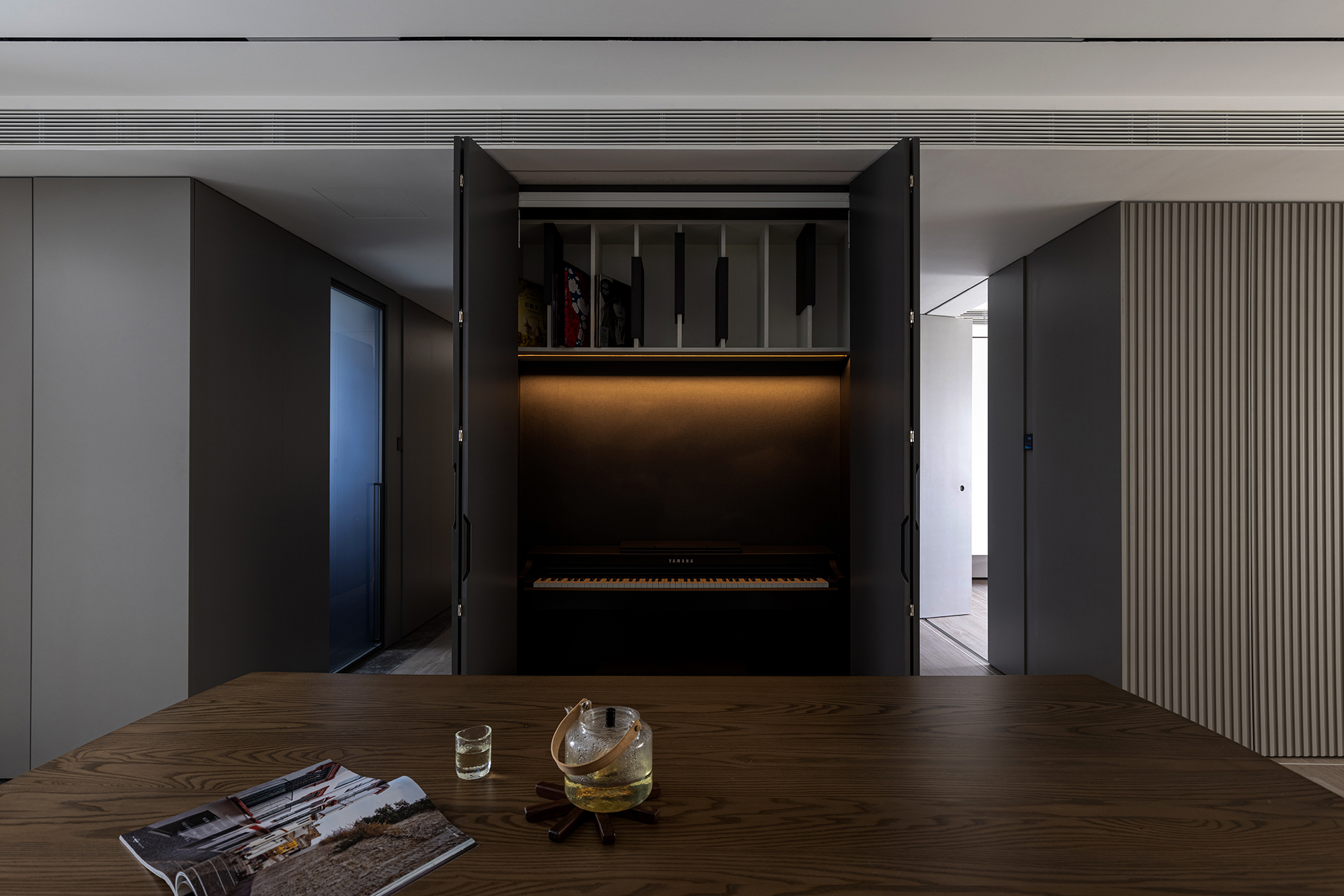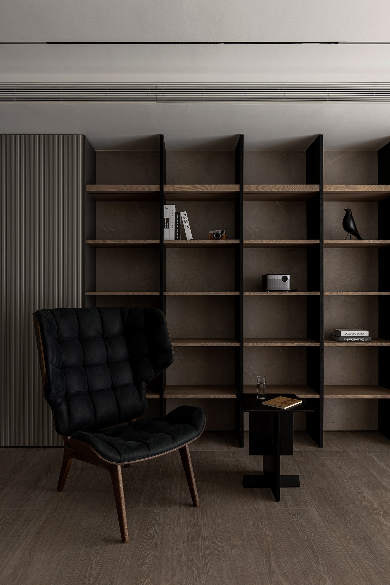 大胆摒弃传统客厅结构,用大面积开放格和整面背景墙,为整个客厅打下极致简约、深沉静谧的基调。藏在开放架中的黄色灯带,在深色背景下显得尤为温暖,中和整个空间的冷感。通过间接光源的渲染,整个客厅呈现出古朴幽玄的空间气息。