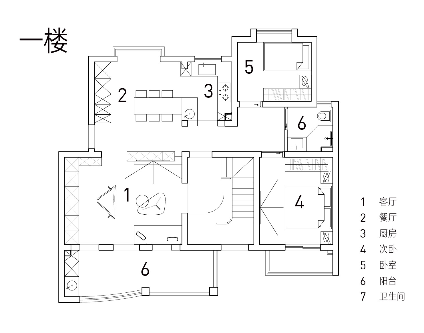 4.更改楼梯位置,把更多空间留给客厅区域,并且优化上下楼的使用感受。
