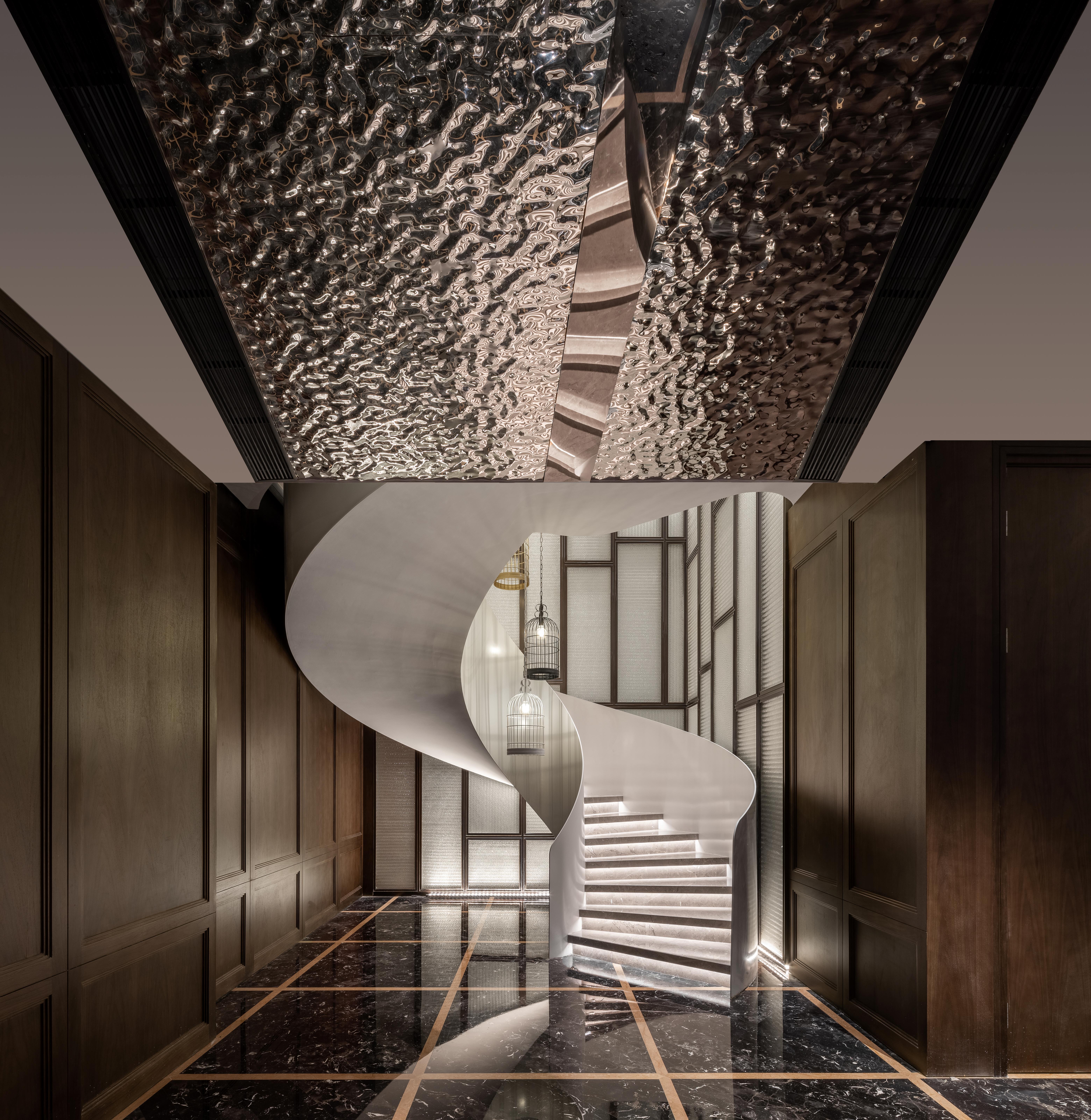 此处为业主自用中餐包房区域,此处的网红楼梯,能够直接上到二层的中餐包房,简单但富有艺术性;整个空间以黑白灰的色调为主,并融入东方肌理线条,呈现出东方的气度和精神。