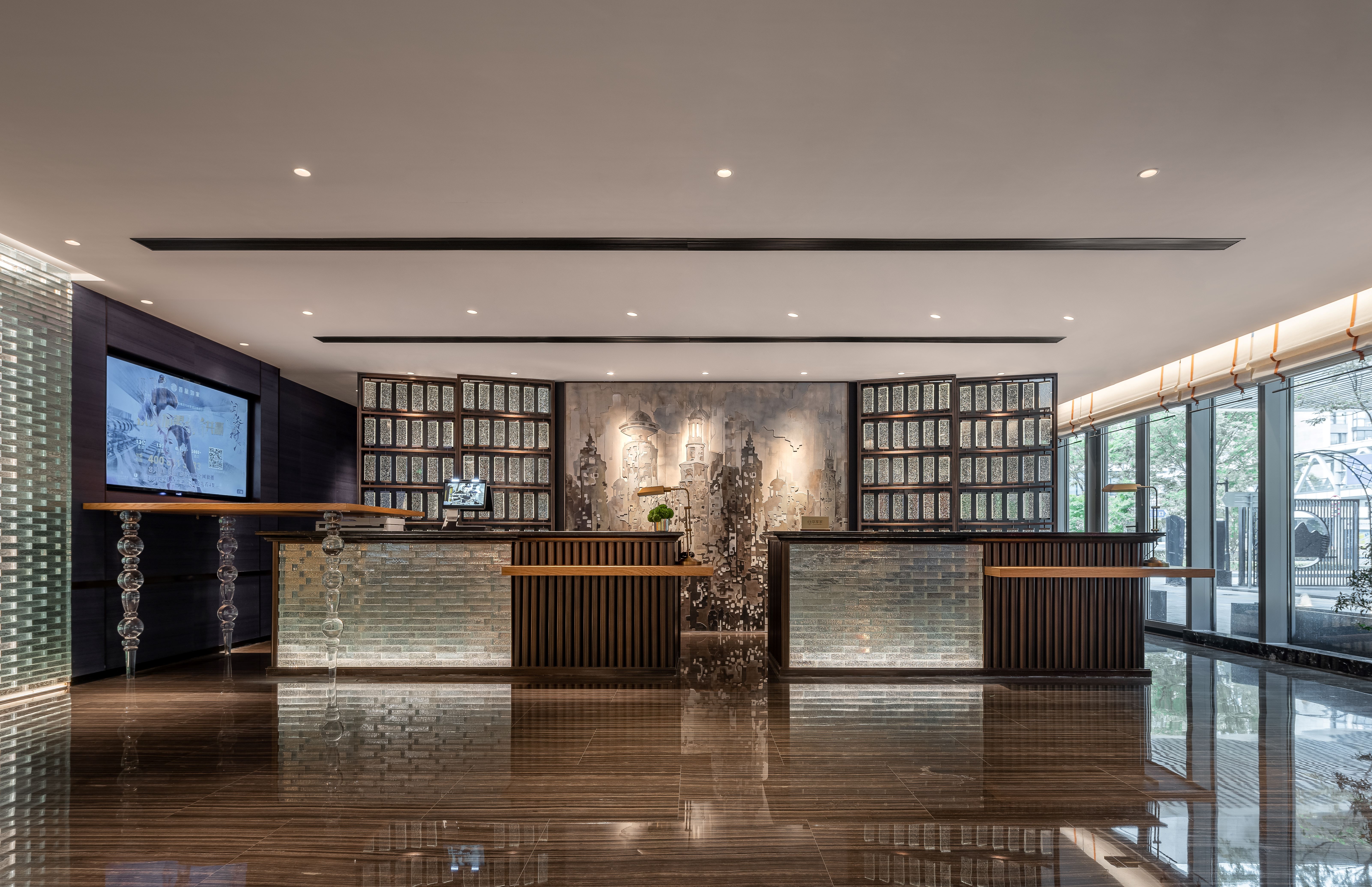 虹桥建国铂萃酒店位于上海市,是首旅如家最高端的品牌,以“萃依东方 领观世界”的设计理念和“古为今用”的设计手法,将东方文化与当代艺术生活方式巧妙结合,着重展现东方文化与现代艺术的糅合所给与客人的独特体验;大堂前台背景采用大幅艺术品与玻璃屏风相结合,主画面为“雨中的上海”剪影,两侧则是现代元素的玻璃屏风;而在前台的造型中,我们运用金属与玻璃砖的材质,整体低调奢华富有艺术感。