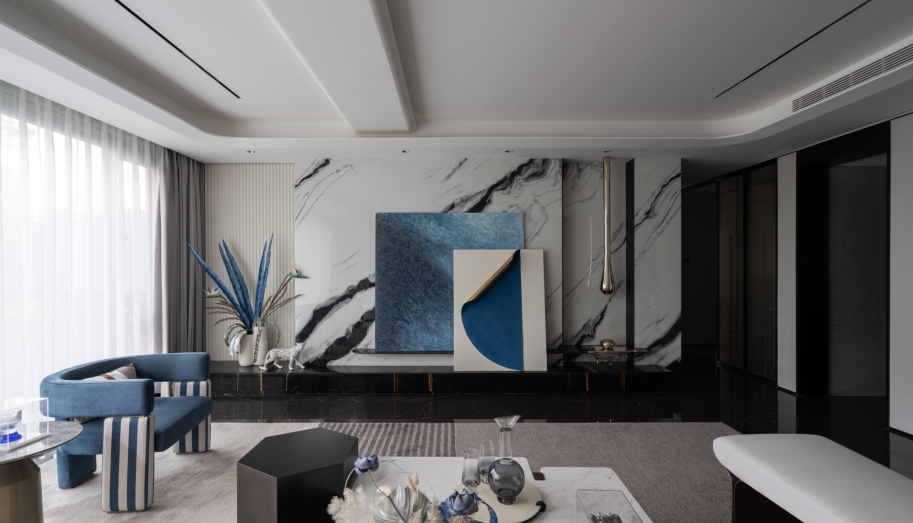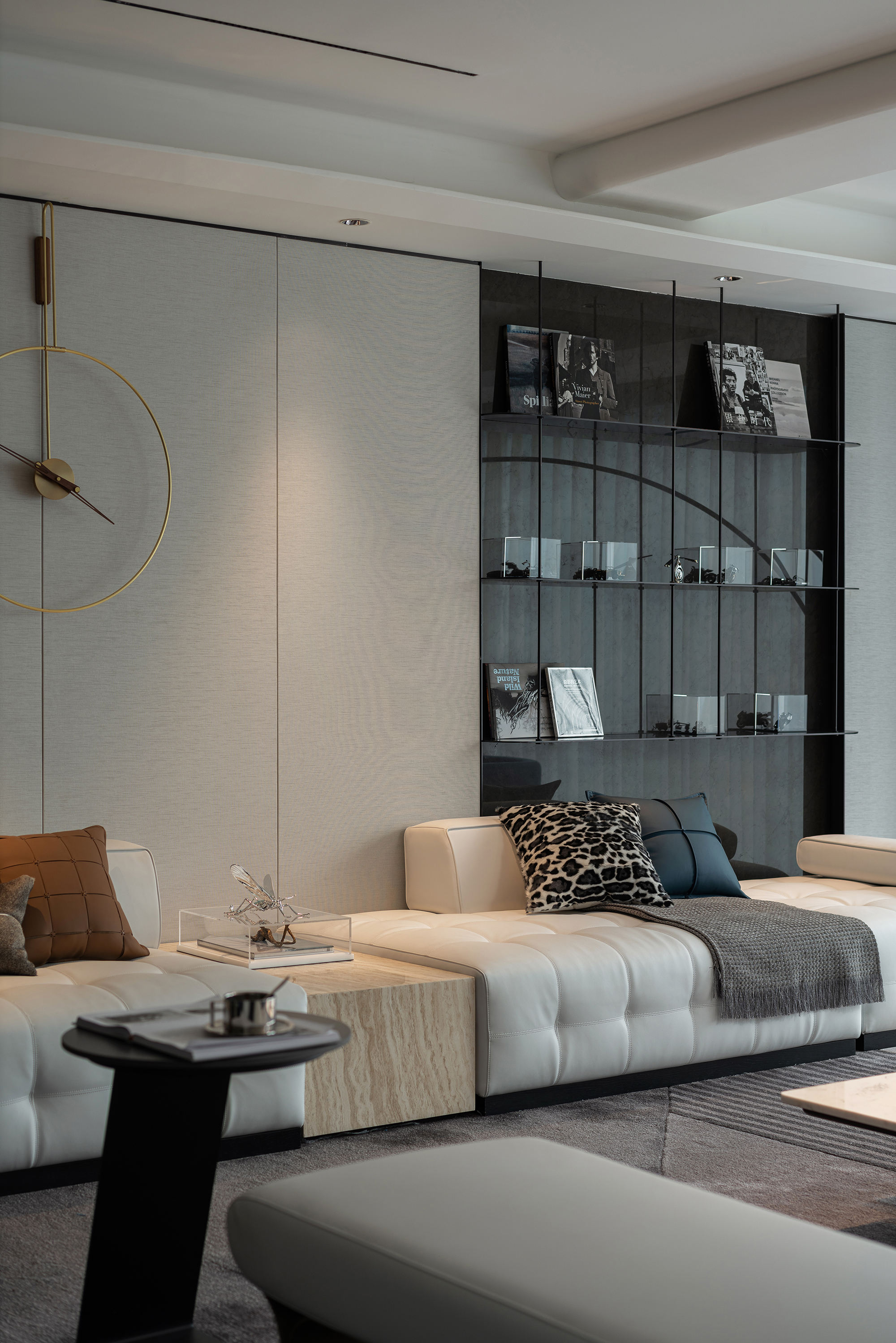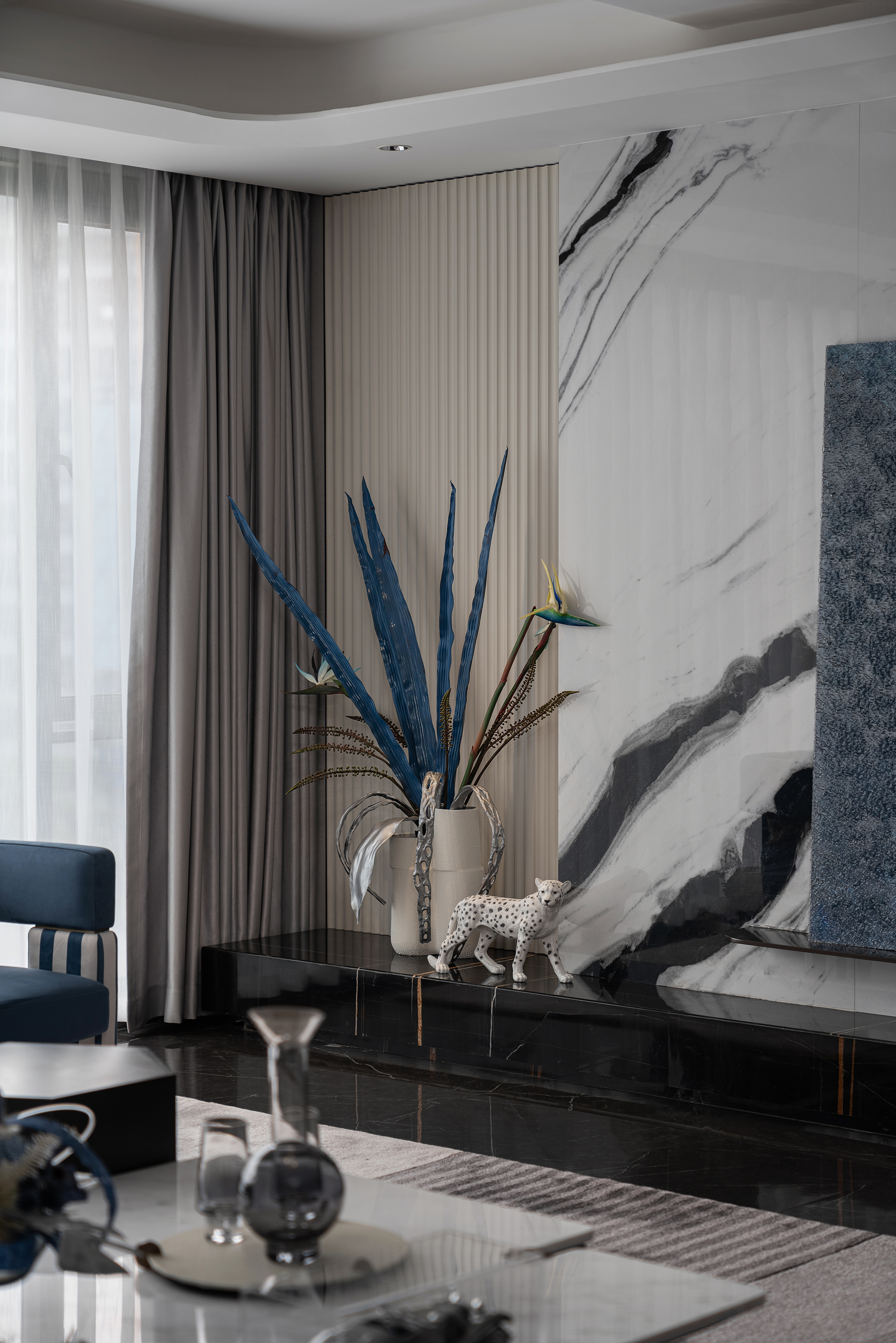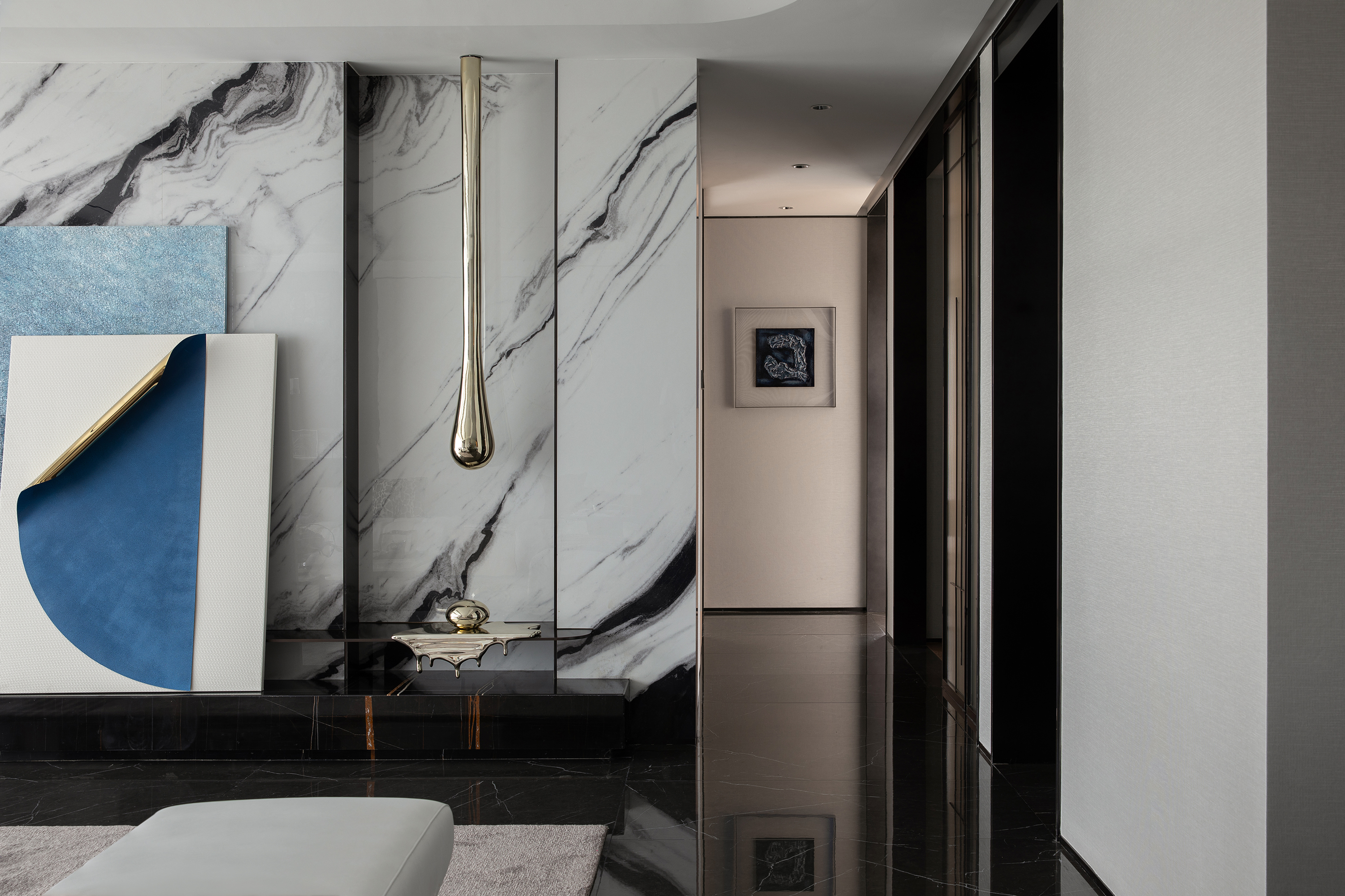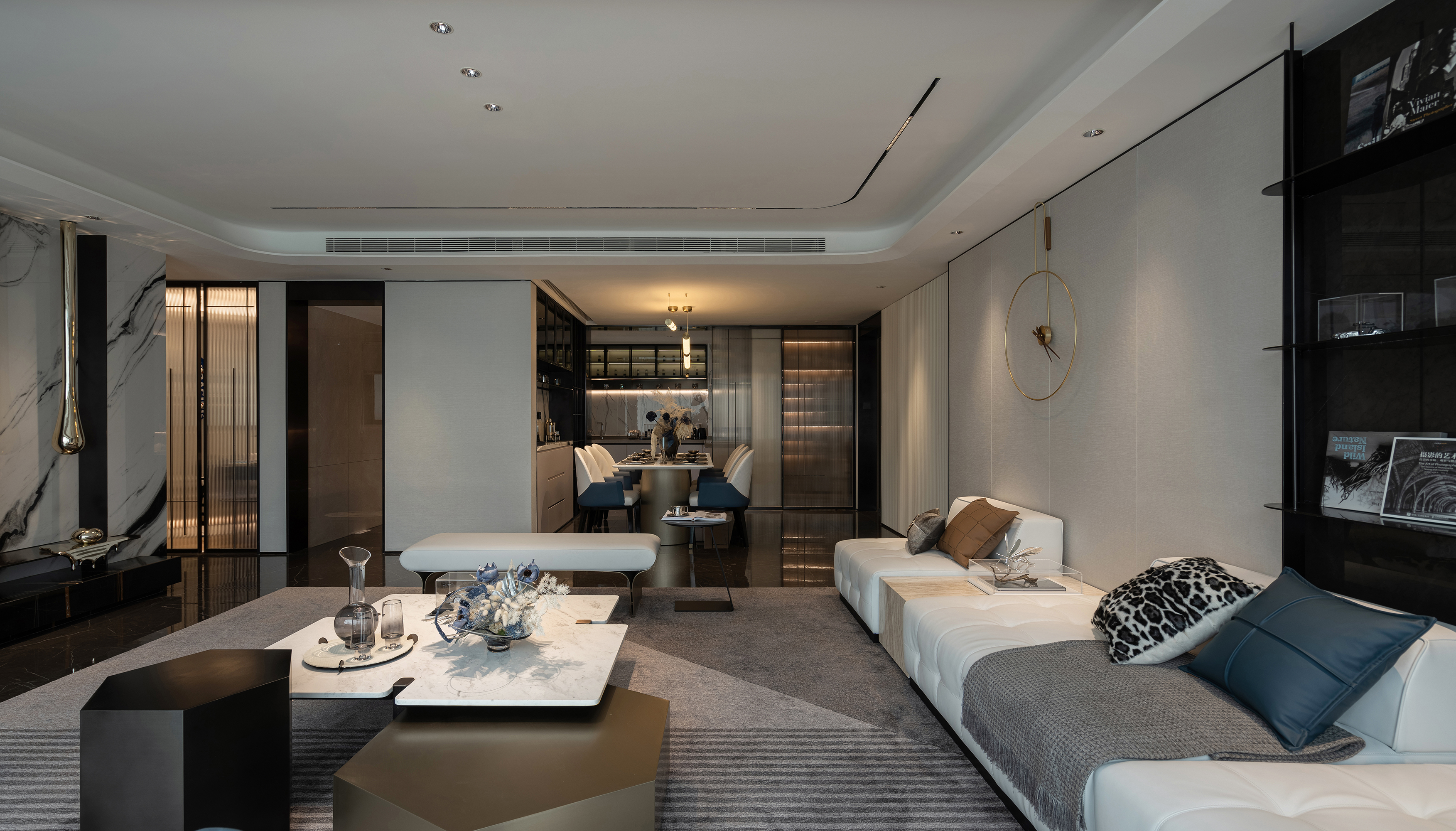 设计选材:保加利亚灰石材、熊猫白石材、不锈钢、艺术玻璃、皮革硬包、木饰面