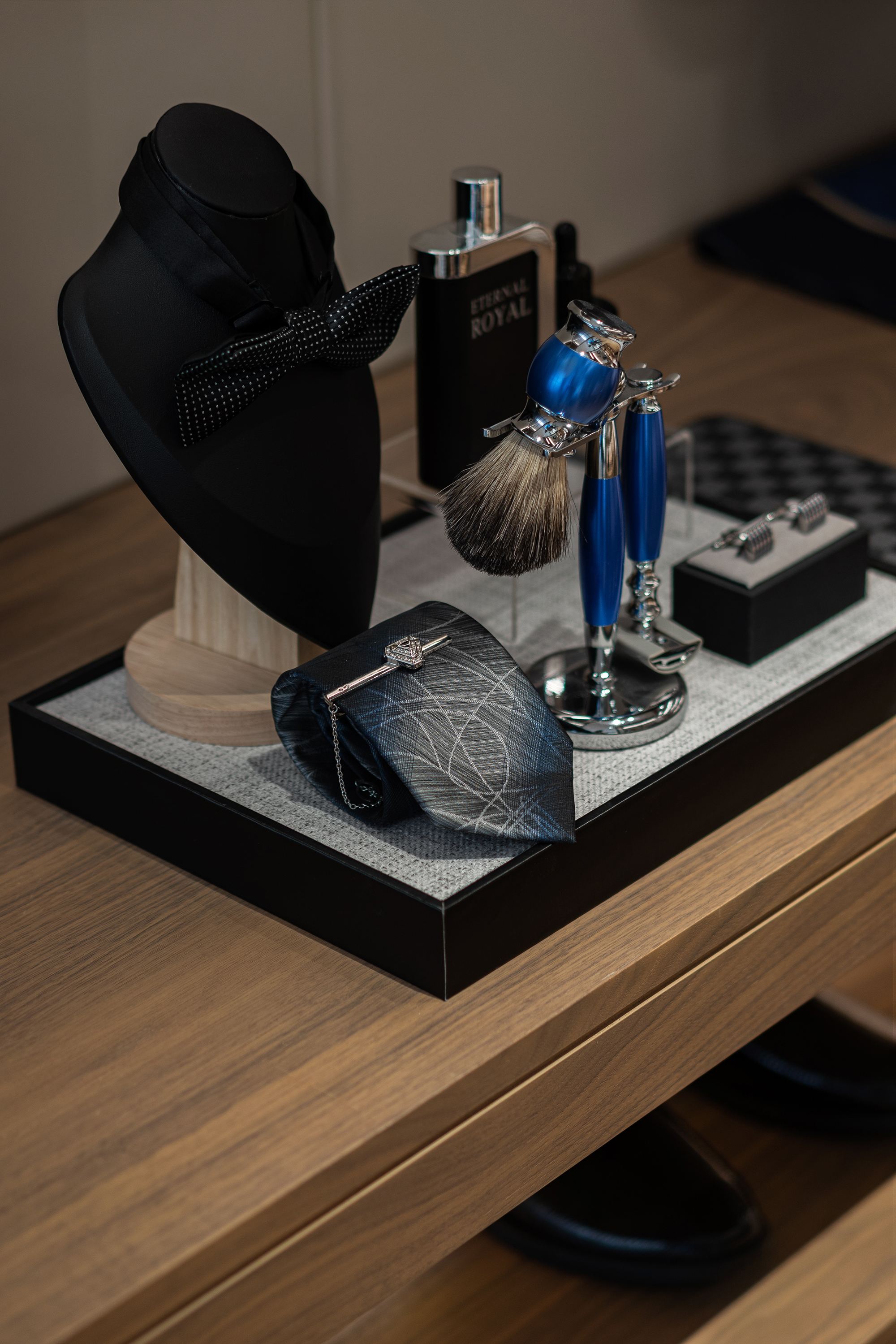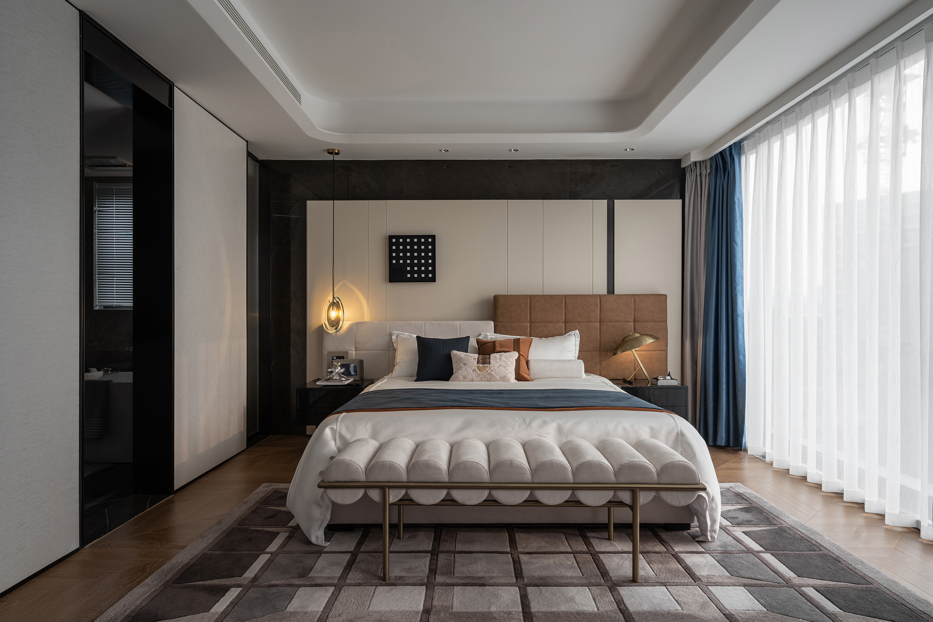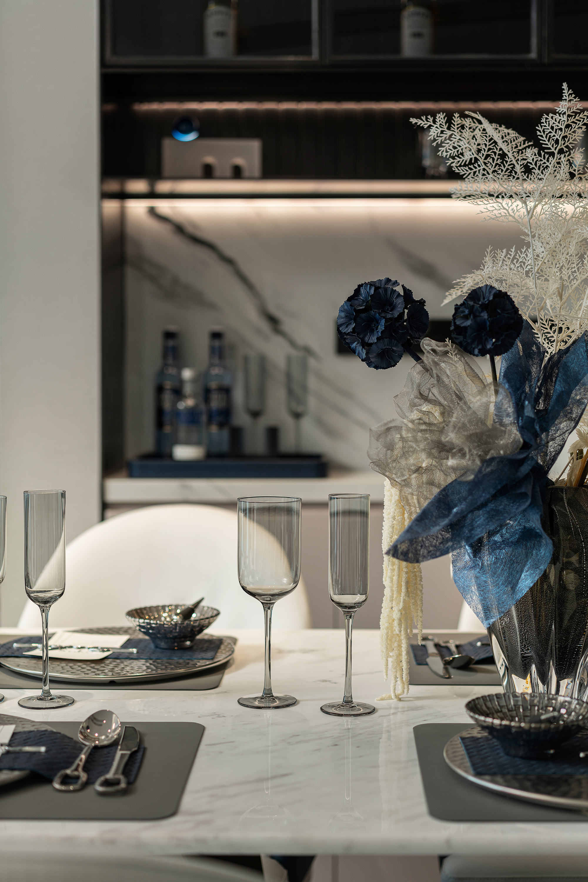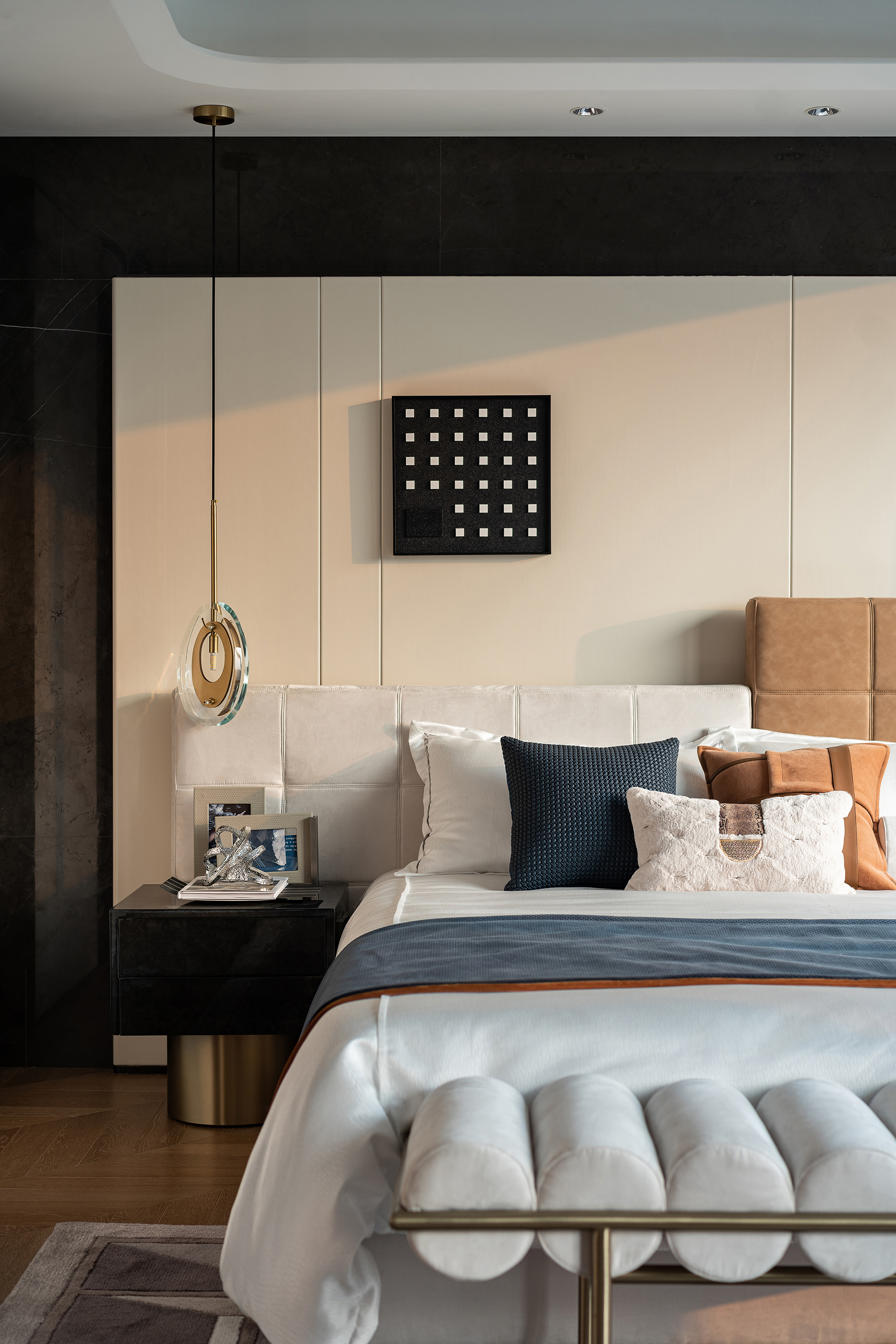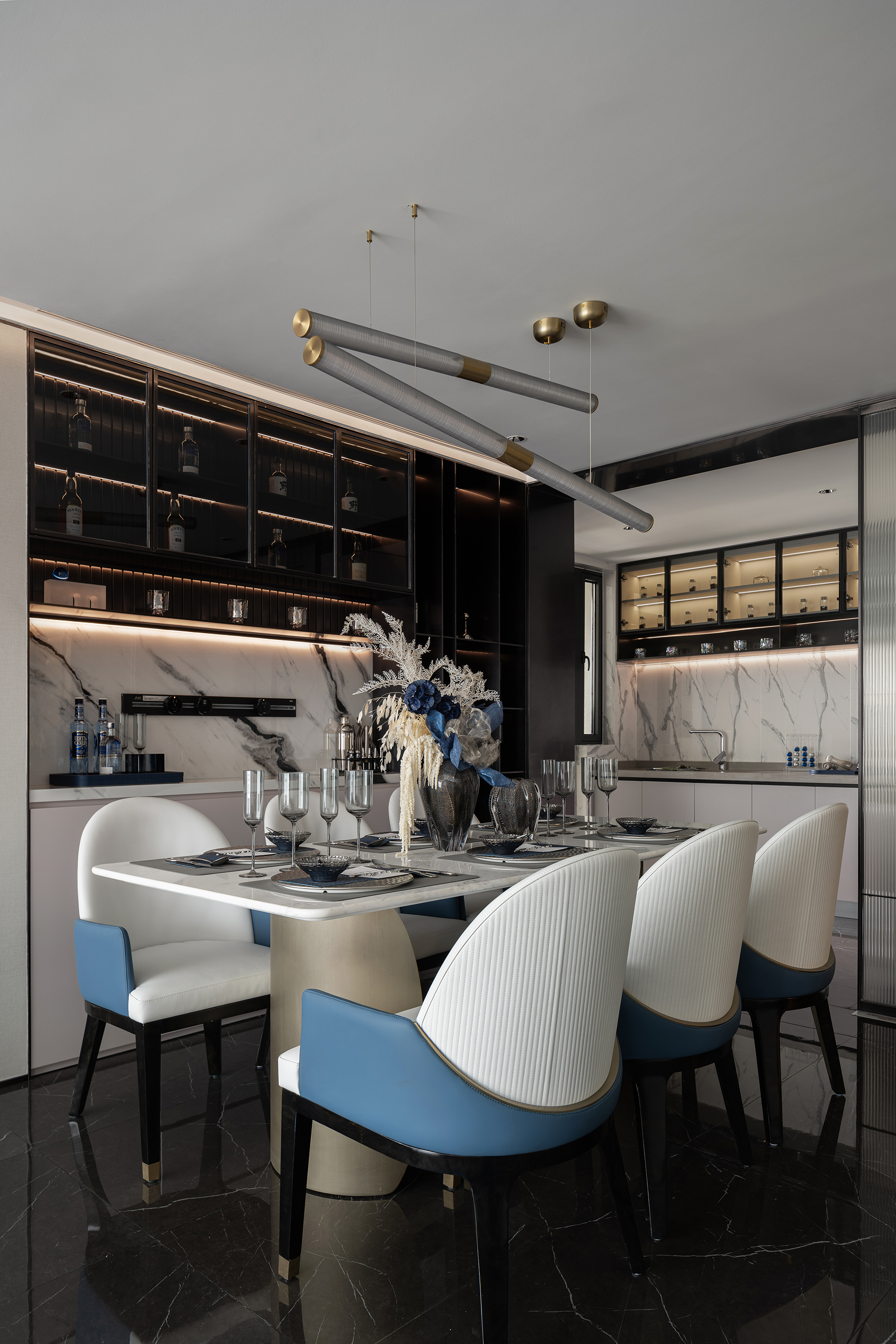 设计选材:保加利亚灰石材、熊猫白石材、不锈钢、艺术玻璃、皮革硬包、木饰面