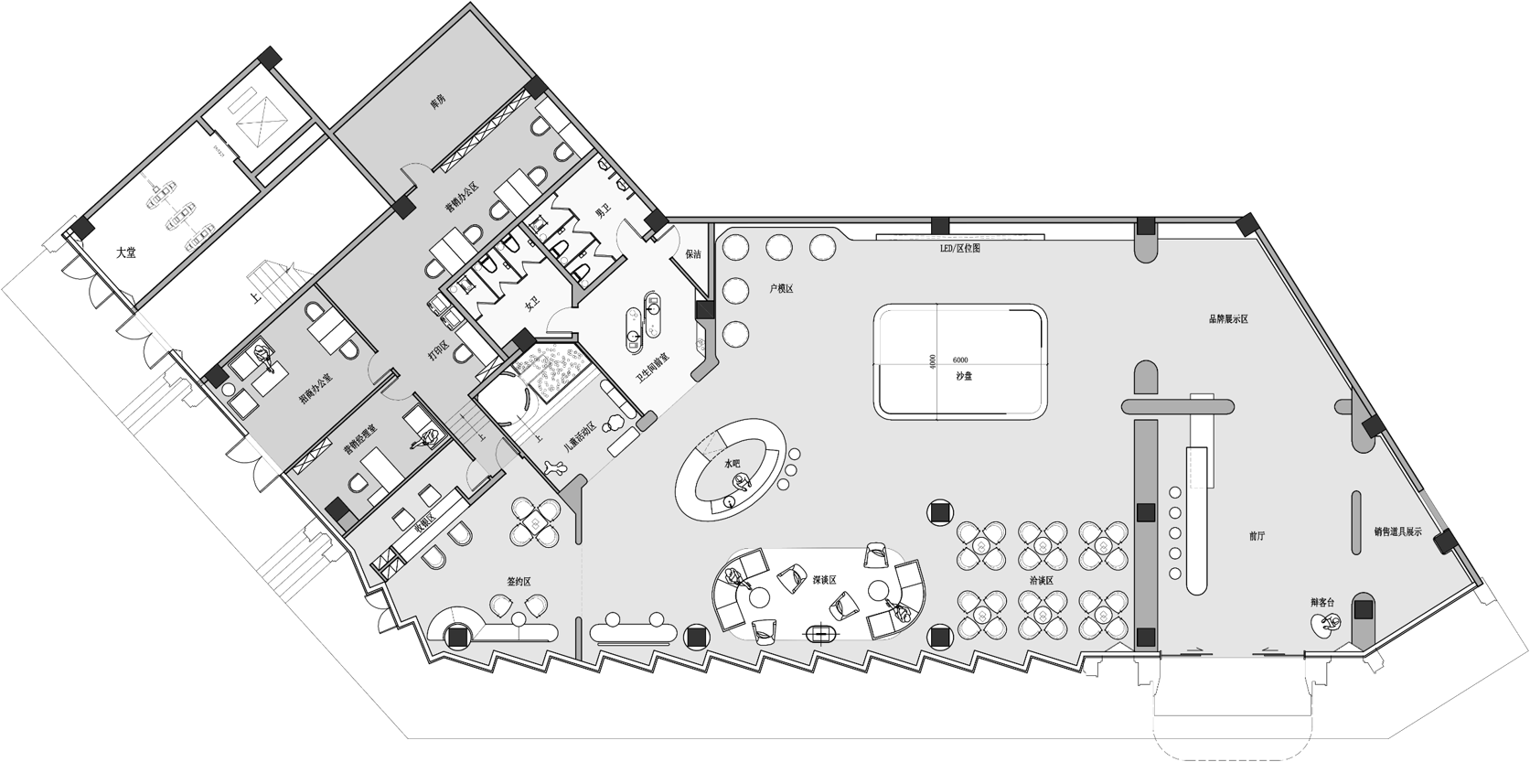 空间意境:我们通过对康定斯基的构成主义理念加以转换,点、线、面跃然于空间之内,赋予几何以三维空间的意义。各个几何元素的功能布局,参考风水理论的走势,致使流线与功能更加顺畅,让空间形成内在统一的秩序之感。