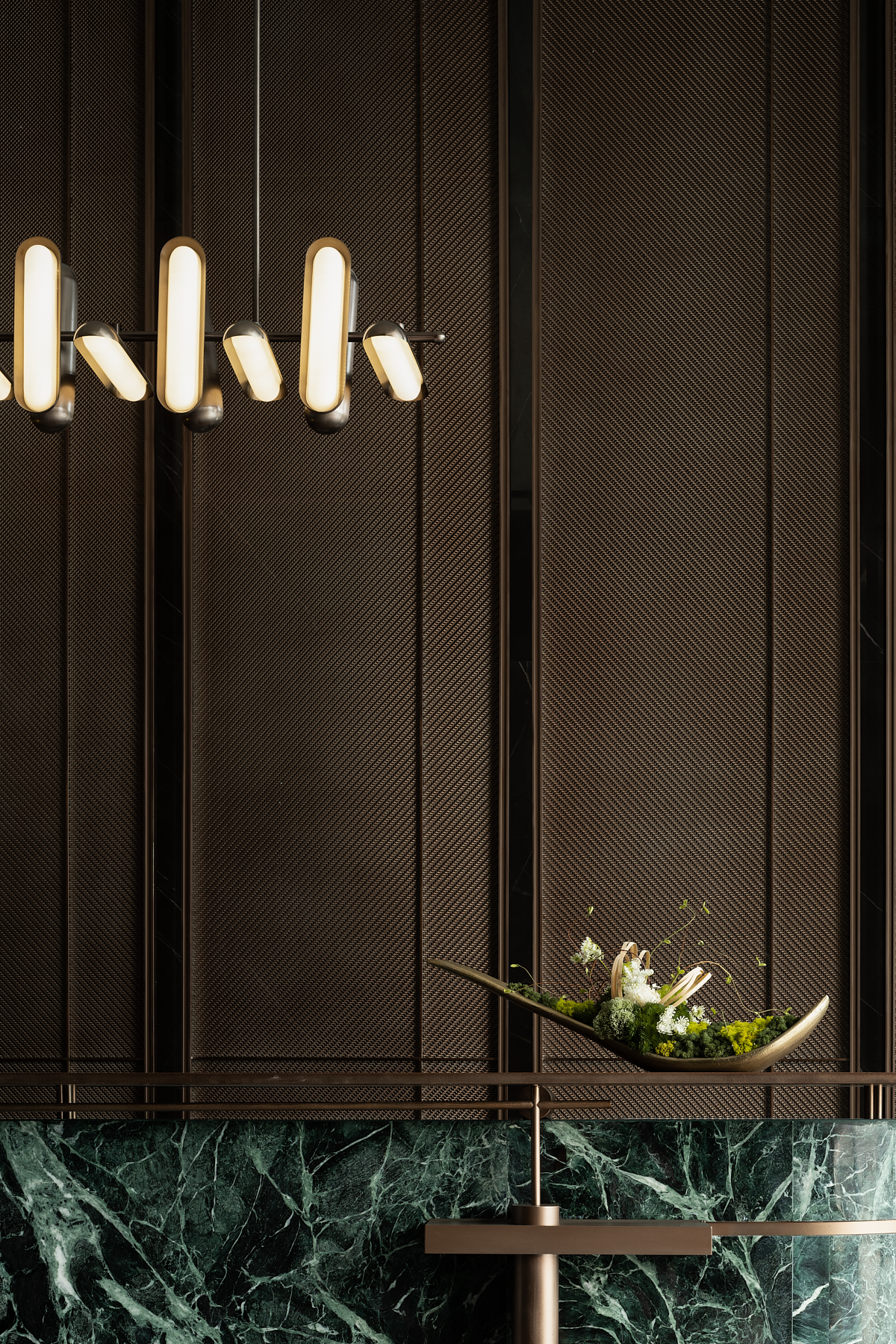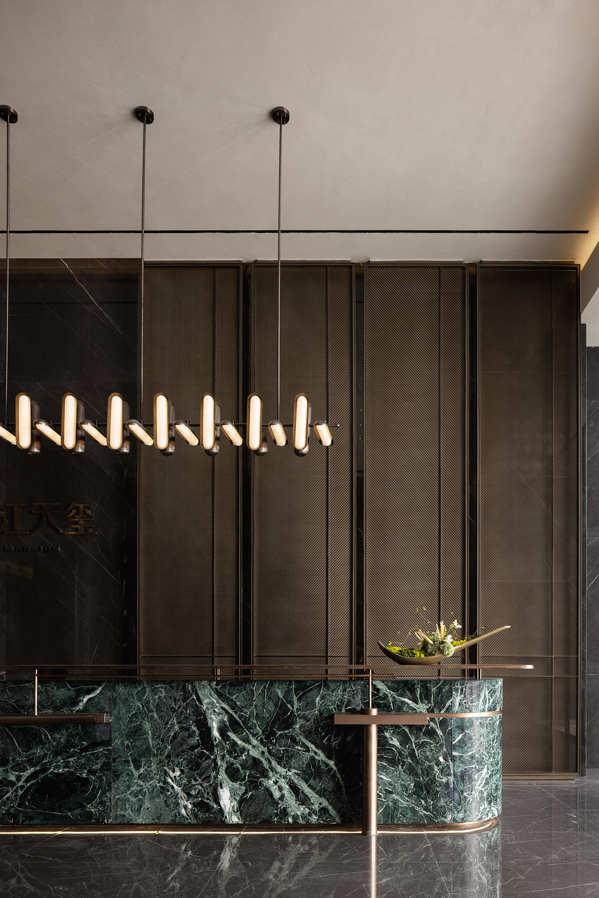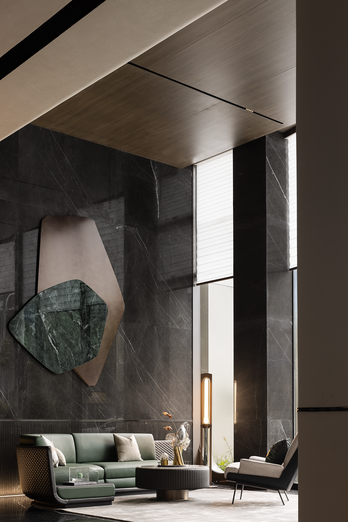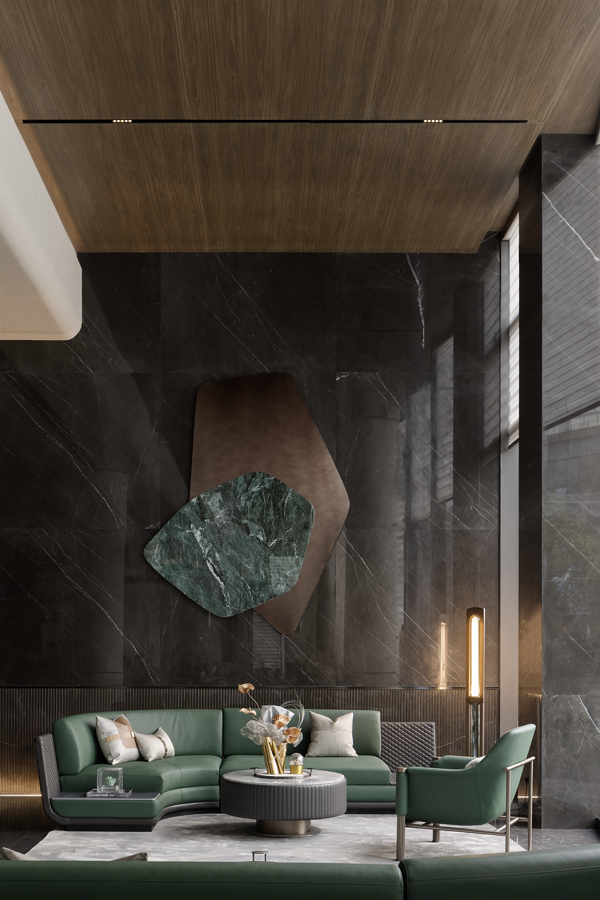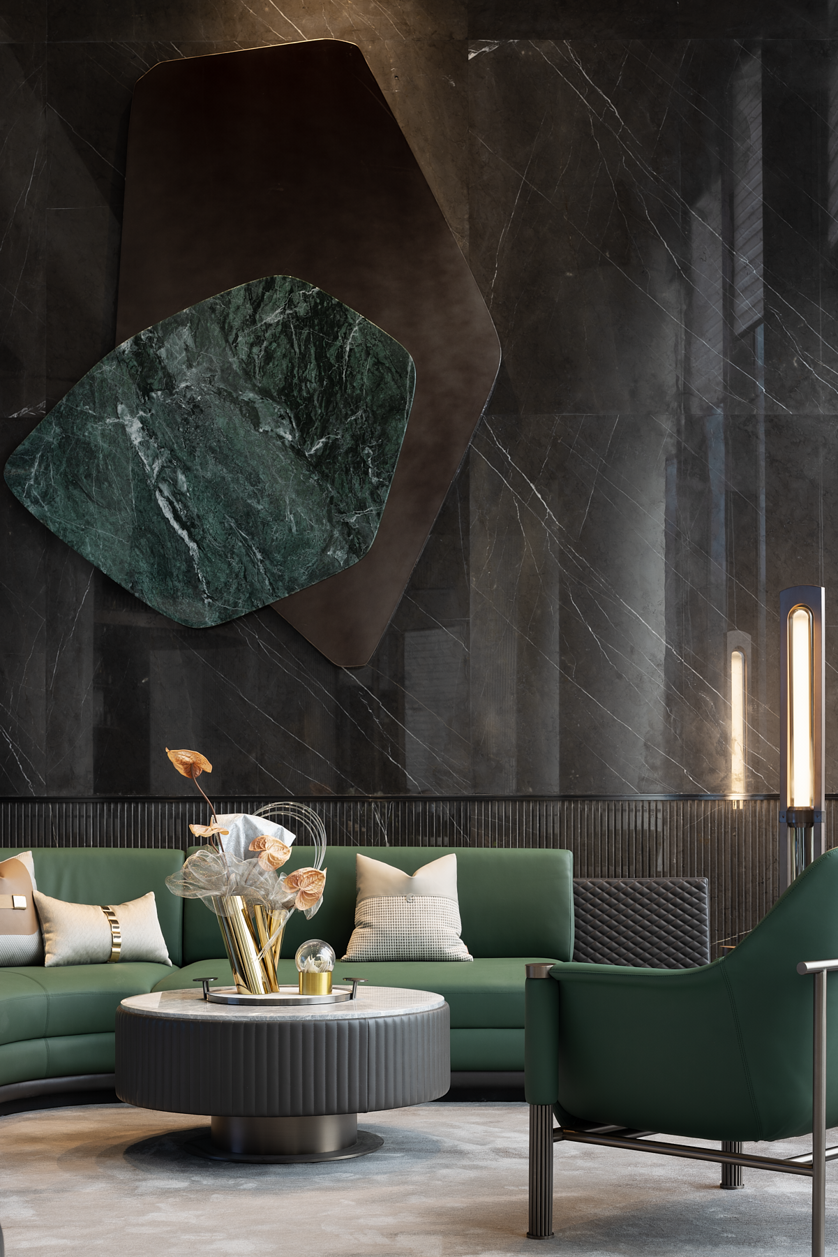 设计选材:普拉达绿石材、冷翡翠石材、保加利亚灰石材、艺术涂料、仿古铜不锈钢、木饰面等