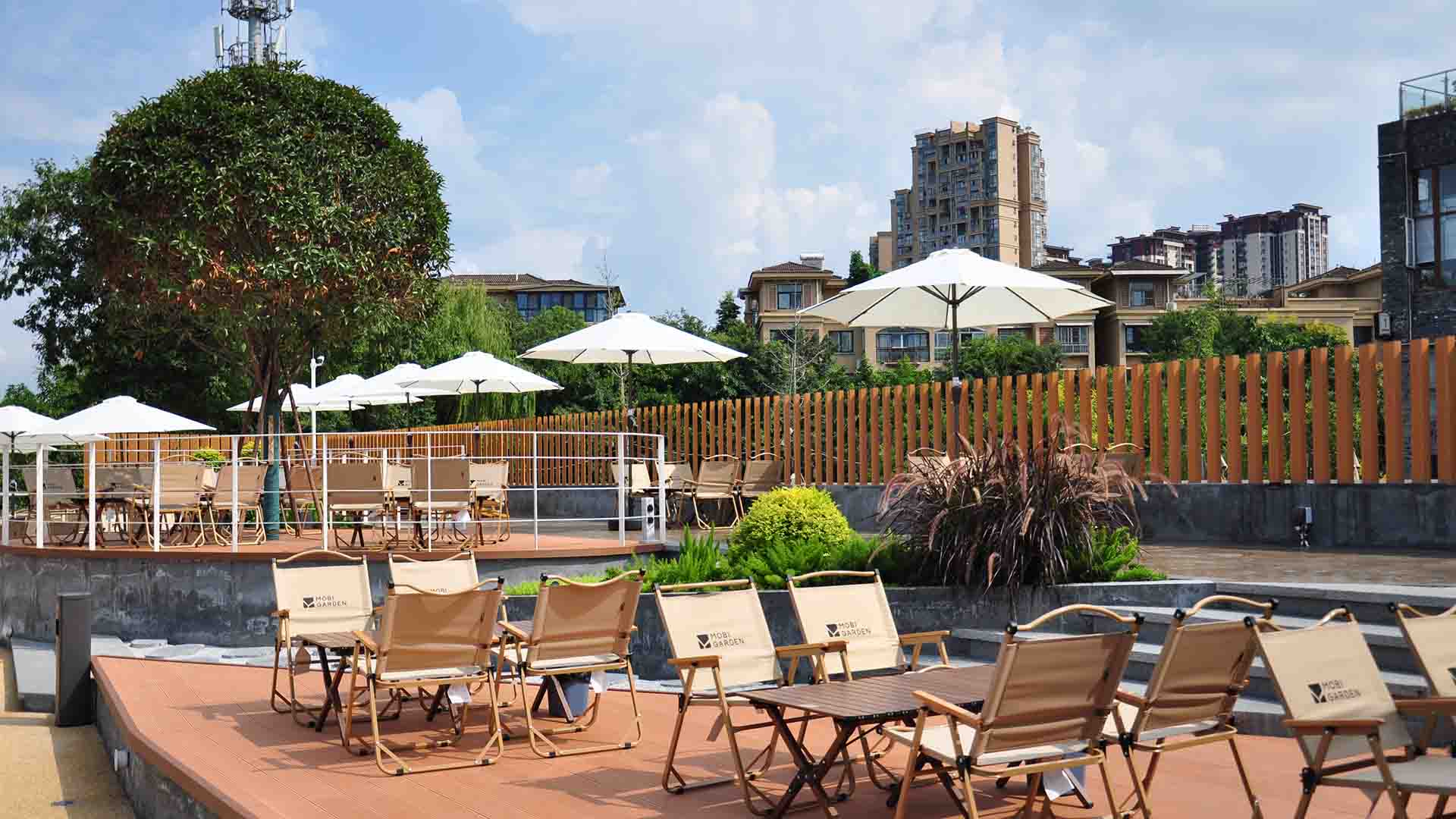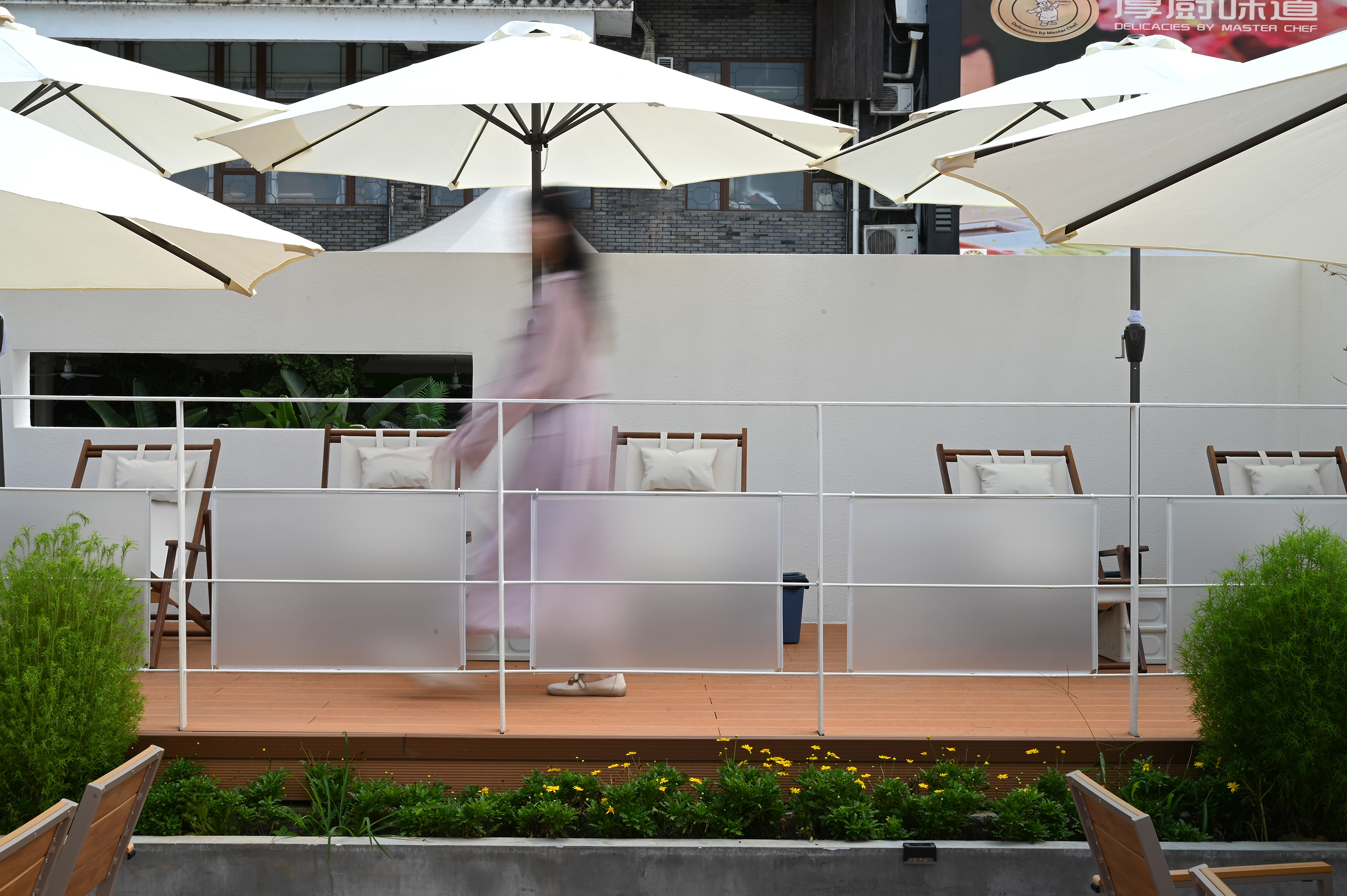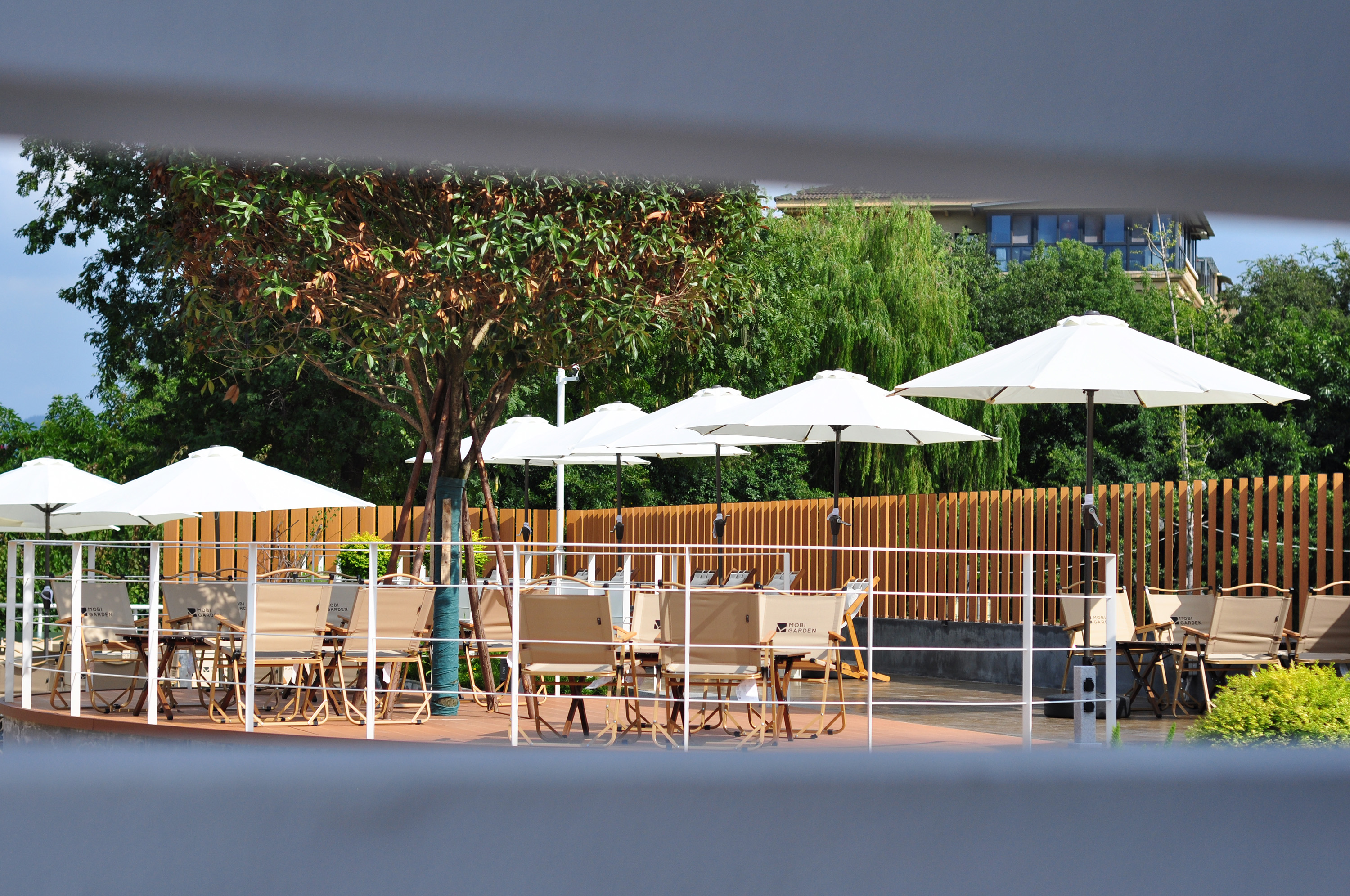 空间布局:项目一共有三个板块,室内大厅,户外A区,户外B区,通过中间搭建区将两户外始末串联,互通户外花园与室内。户外庭院错落有致分割不同的落座区,保证了 私密和空间的层次感。将休憩和交流两种状态整合与一体,从而达到了移步异景的视觉效果。