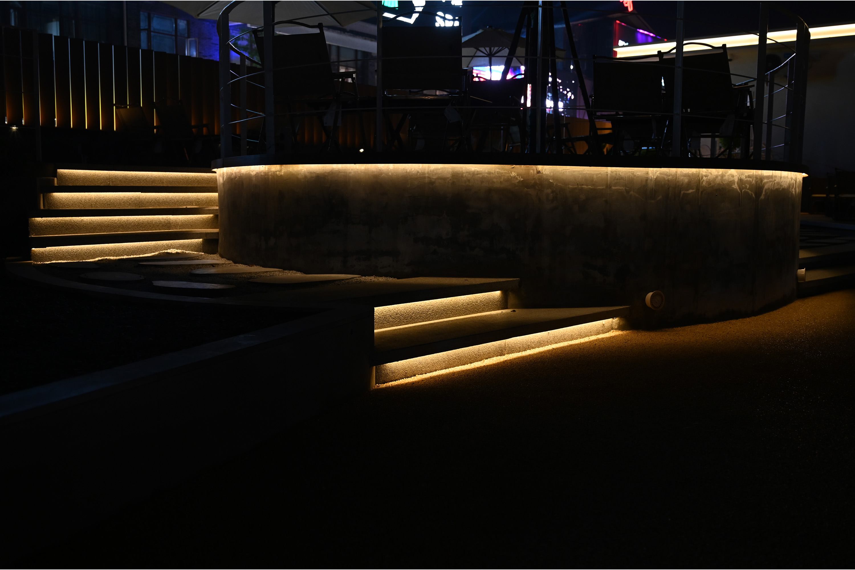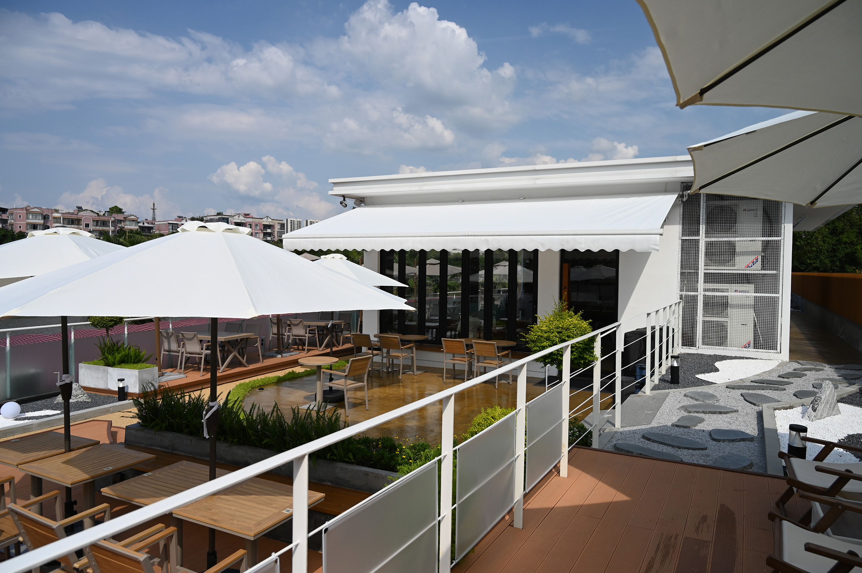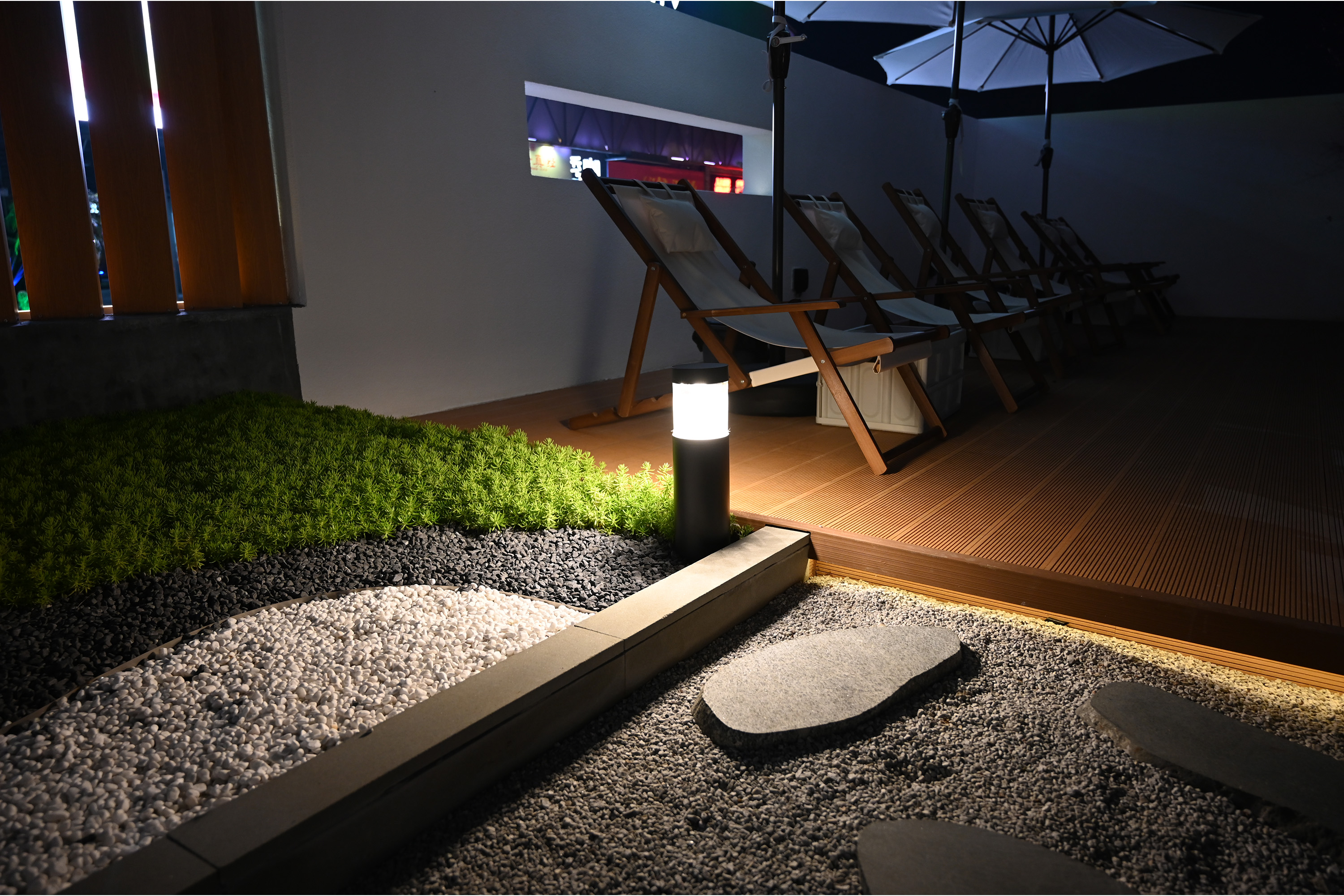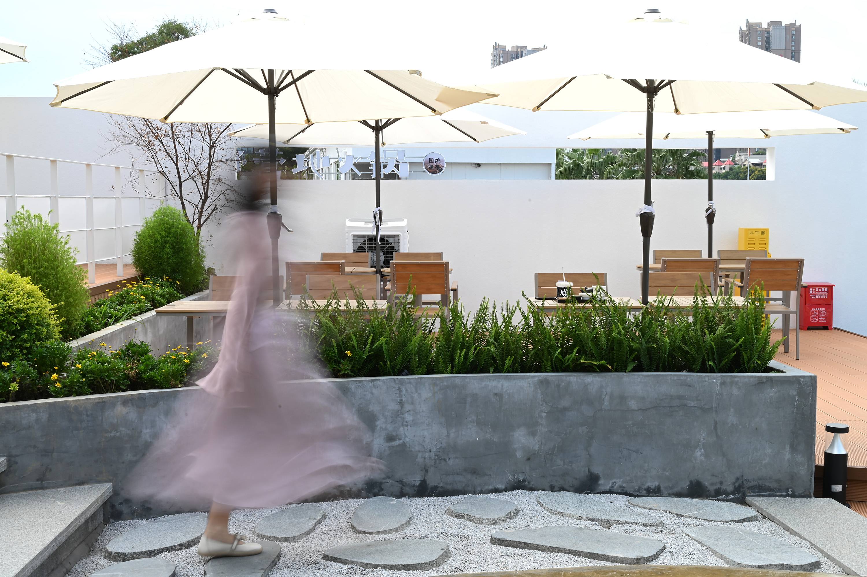 空间布局:项目一共有三个板块,室内大厅,户外A区,户外B区,通过中间搭建区将两户外始末串联,互通户外花园与室内。户外庭院错落有致分割不同的落座区,保证了 私密和空间的层次感。将休憩和交流两种状态整合与一体,从而达到了移步异景的视觉效果。
