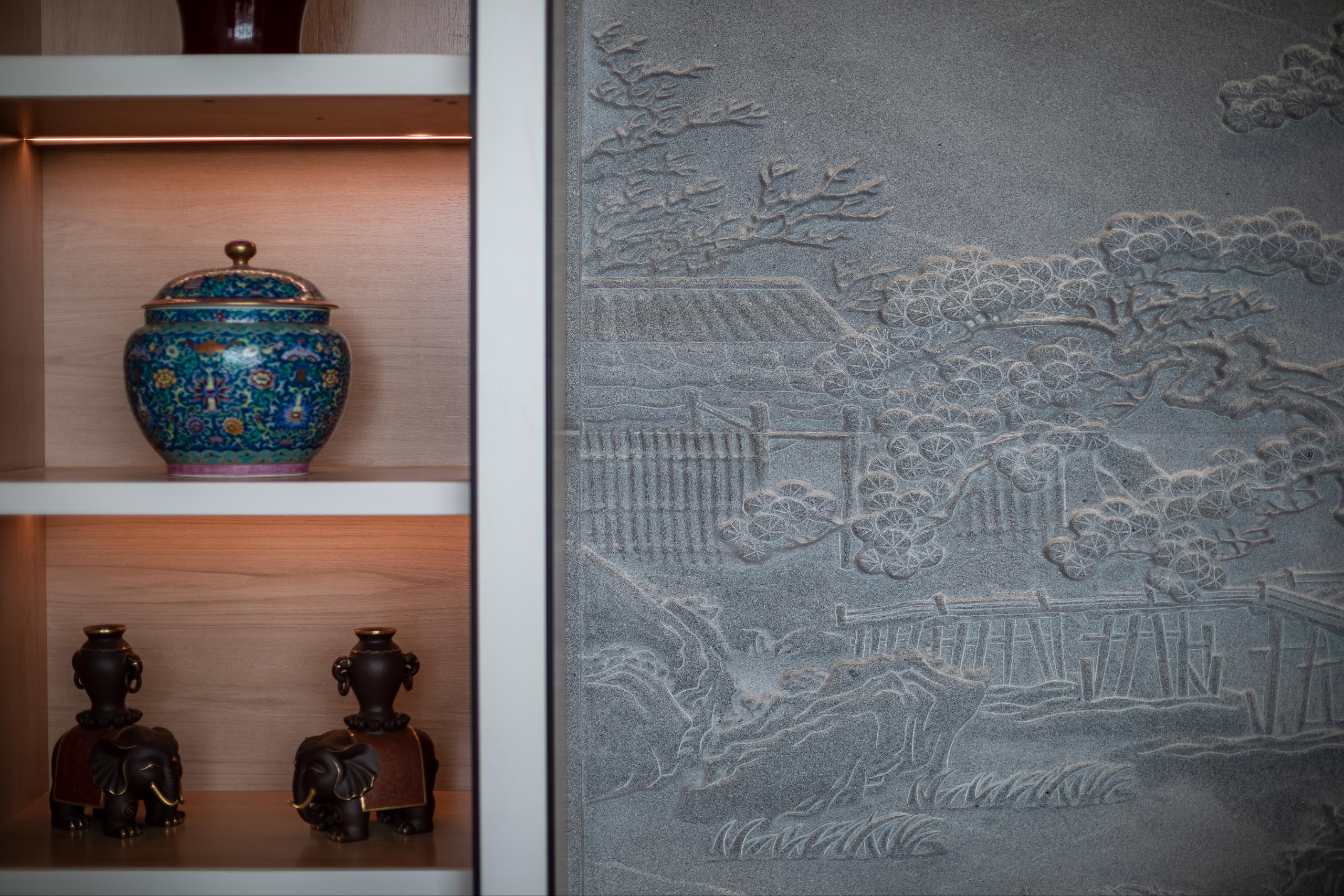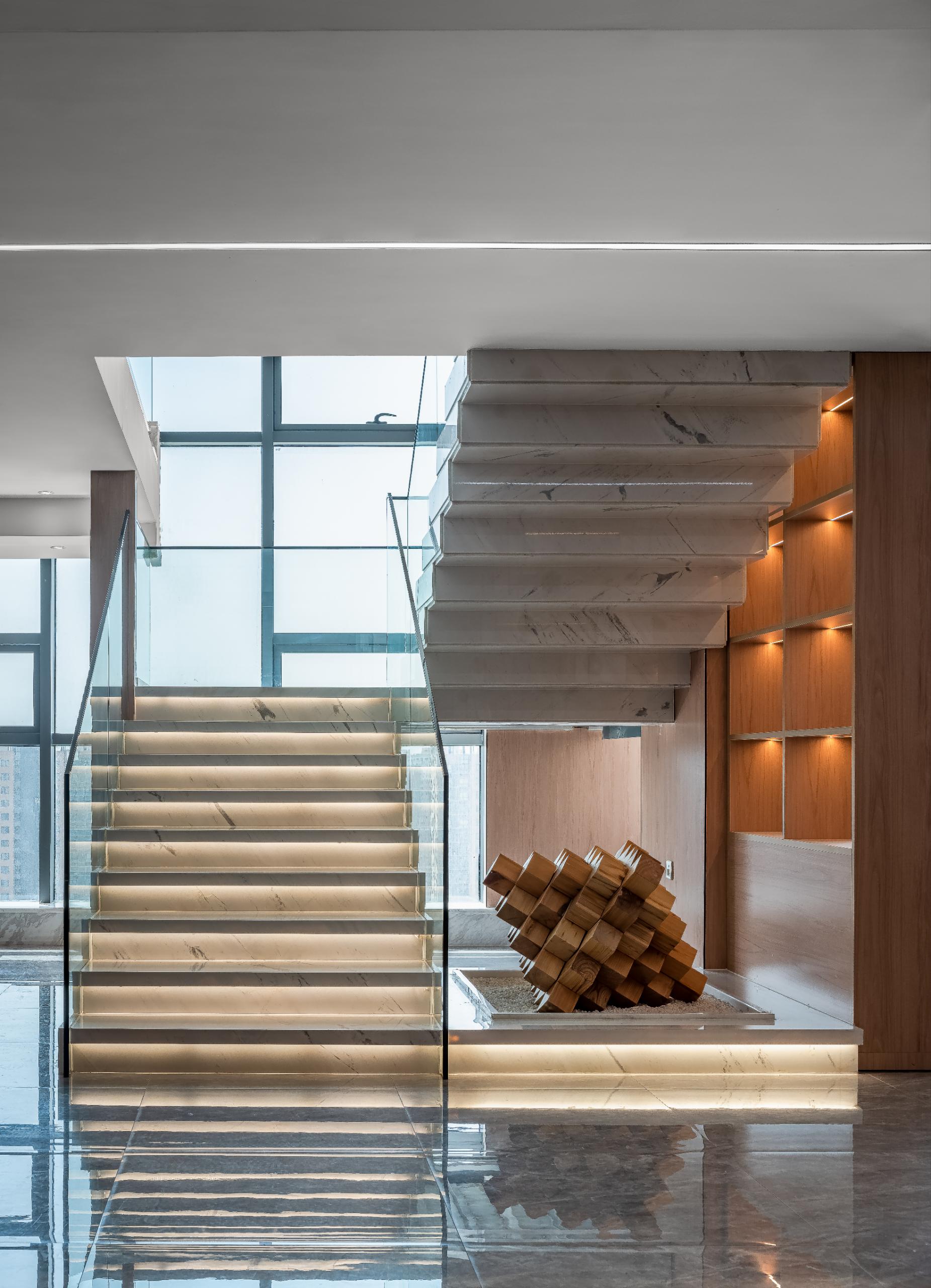 空间意境:以斗拱做为中华古典建筑的精神和气质的代表,有着吉祥如意的寓意。它是汉族建筑上特有的构件,是由方形的斗、升、拱、翘、昂组成,位于柱与梁之间,起着承上启下的作用,造型精巧美观,又是很好的装饰构件;鲁班锁,是中国古代民族传统的土木建筑固定结合器,流传于中国民间的智力玩具民。鲁班锁以其古朴的外表,对称的形状,神奇的内部结构,散发出独特的吸引人的魅力。一个古老的玩具,却折射出一个民族智慧的传承。而这些凝结着智慧的组织构件,经设计师的巧妙布置和应用,也在项目空间中绽放着熠熠光彩。