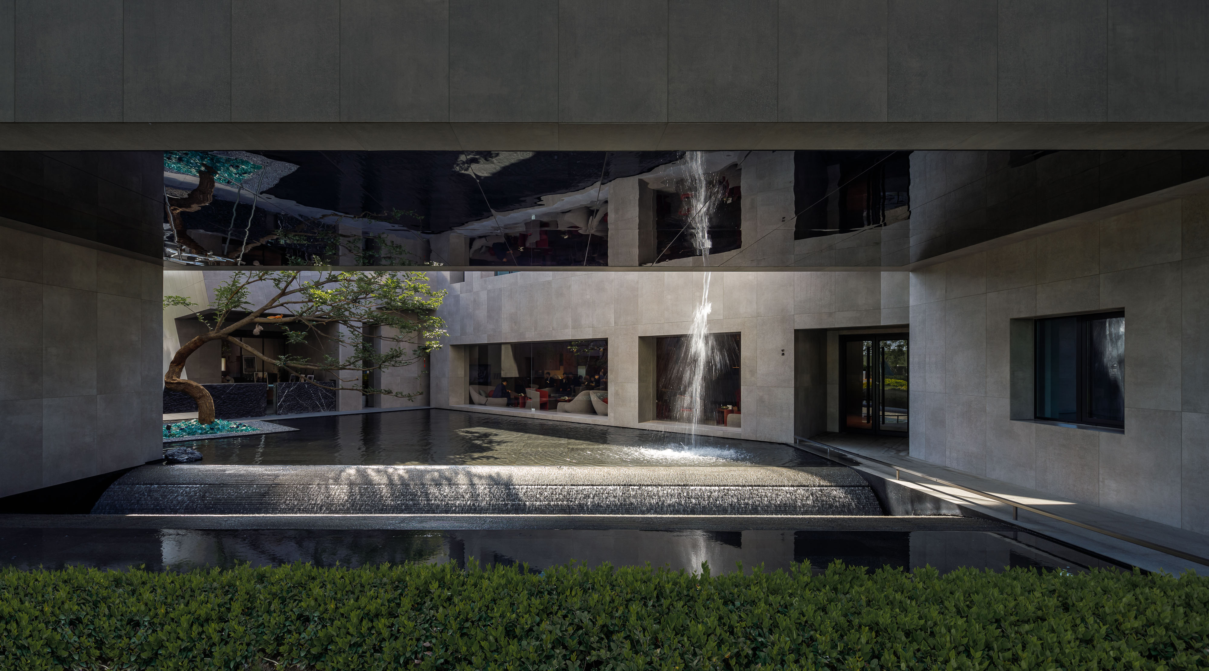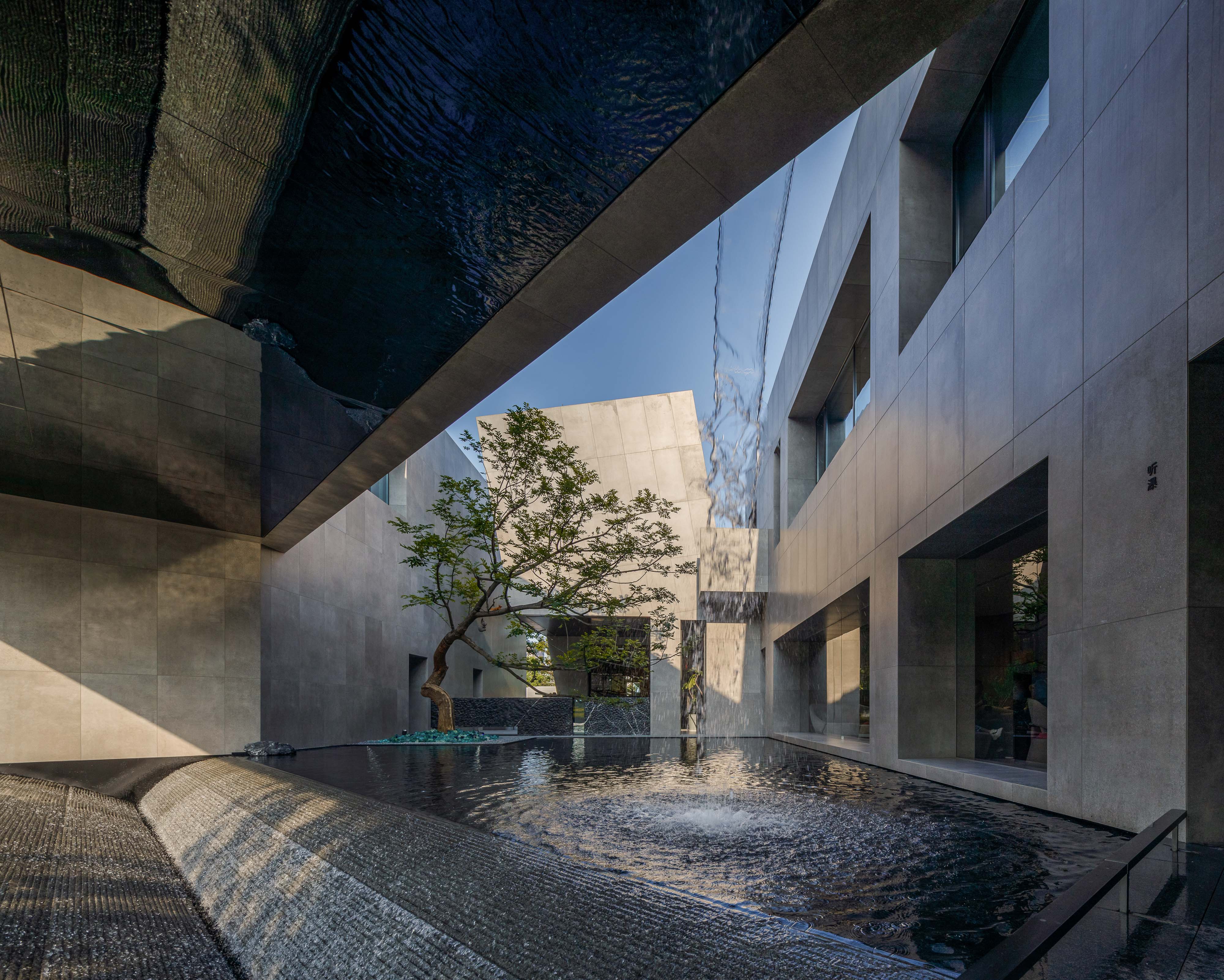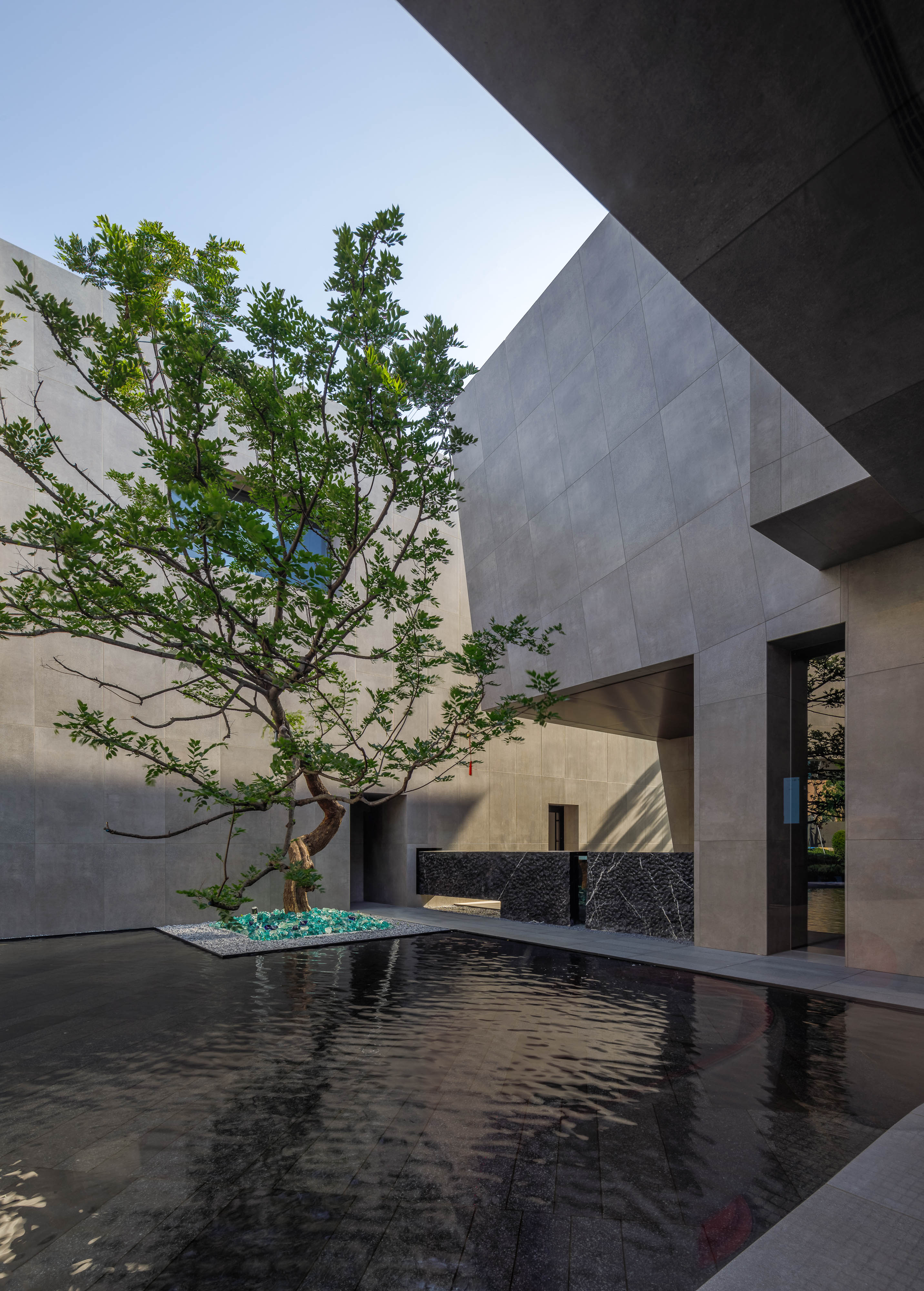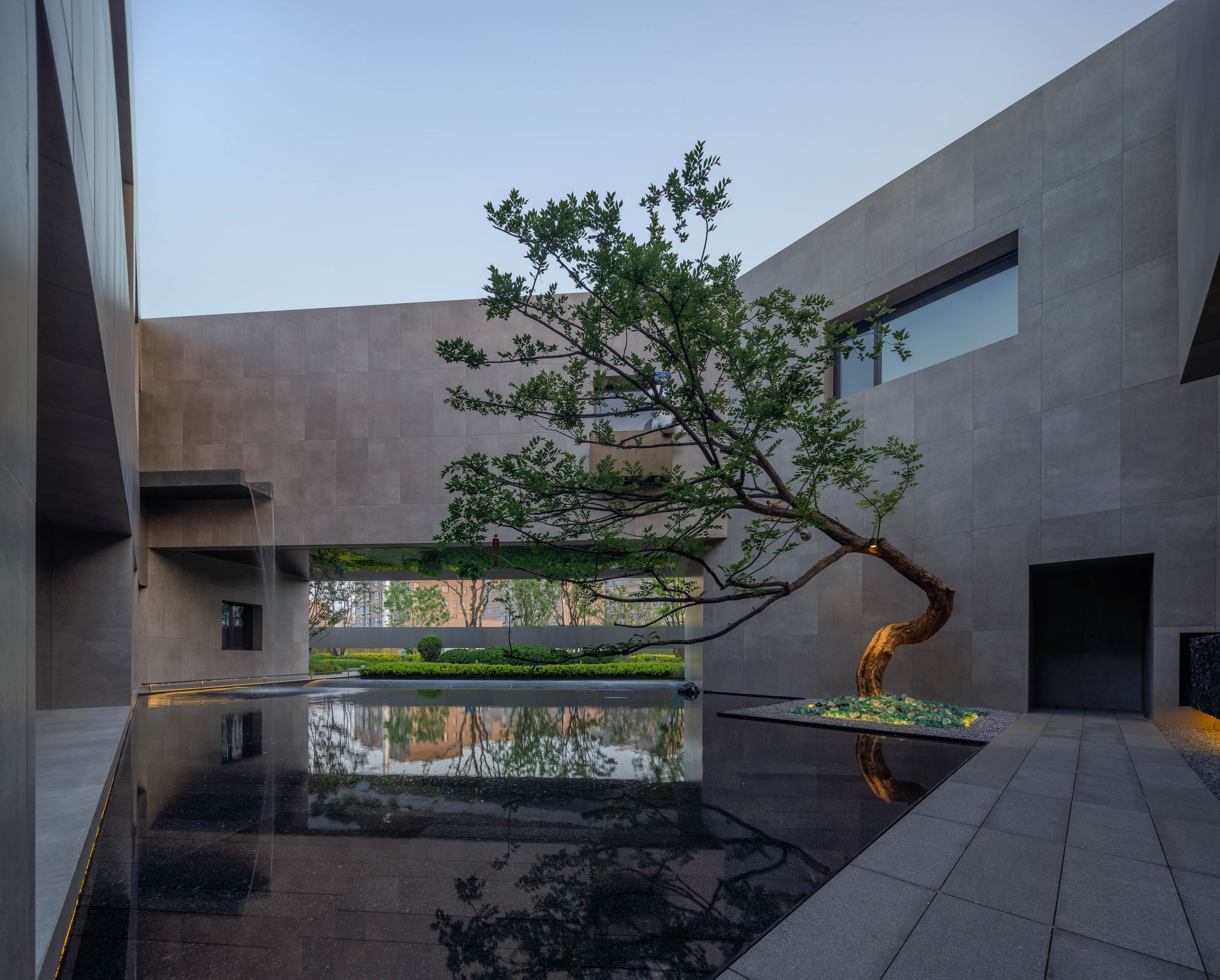 将建筑做成了一个极简的围合水院,造型简约典雅,使展示区域在闹市中拥入了一方静谧,隐其风华。