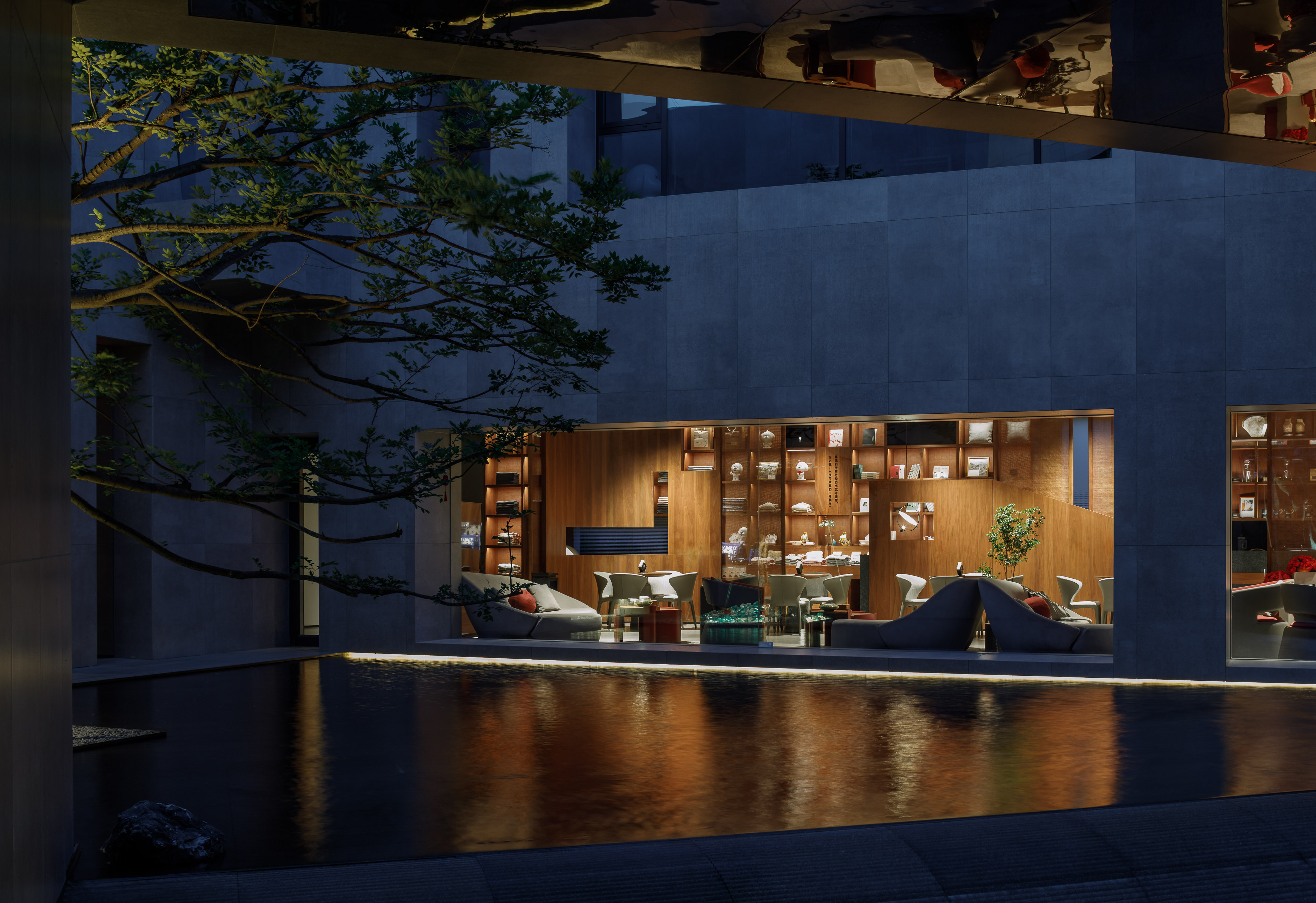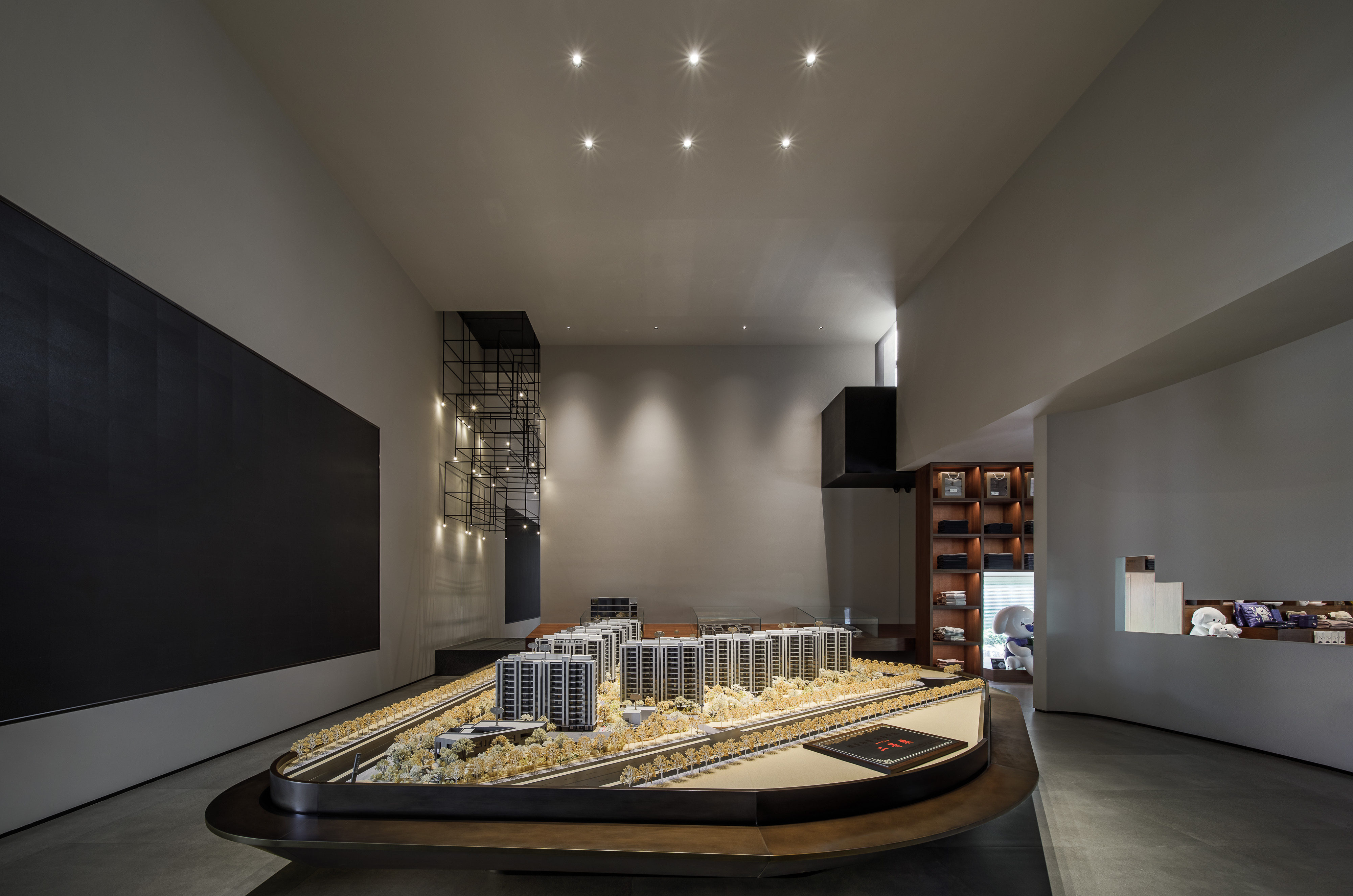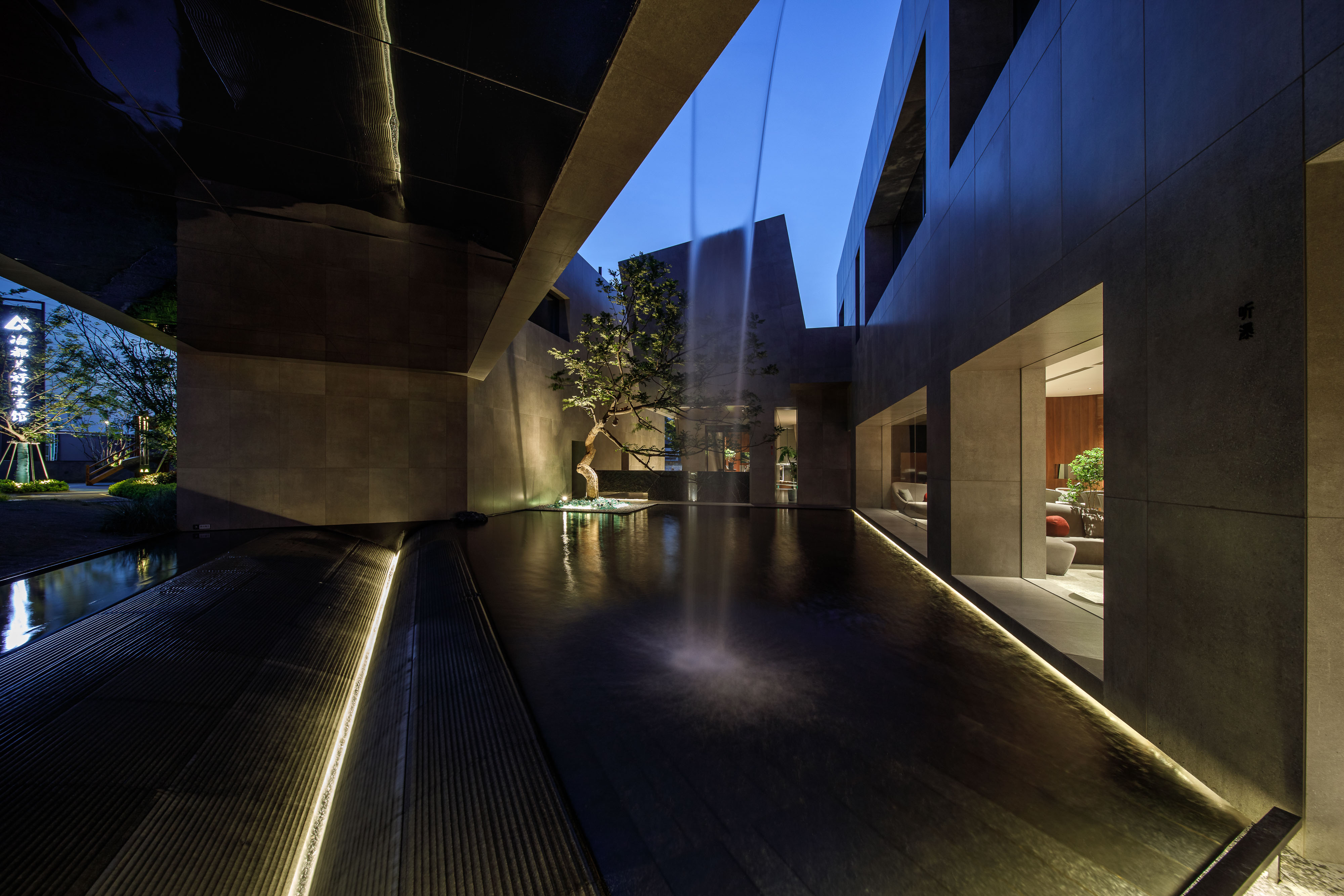将建筑做成了一个极简的围合水院,造型简约典雅,使展示区域在闹市中拥入了一方静谧,隐其风华。