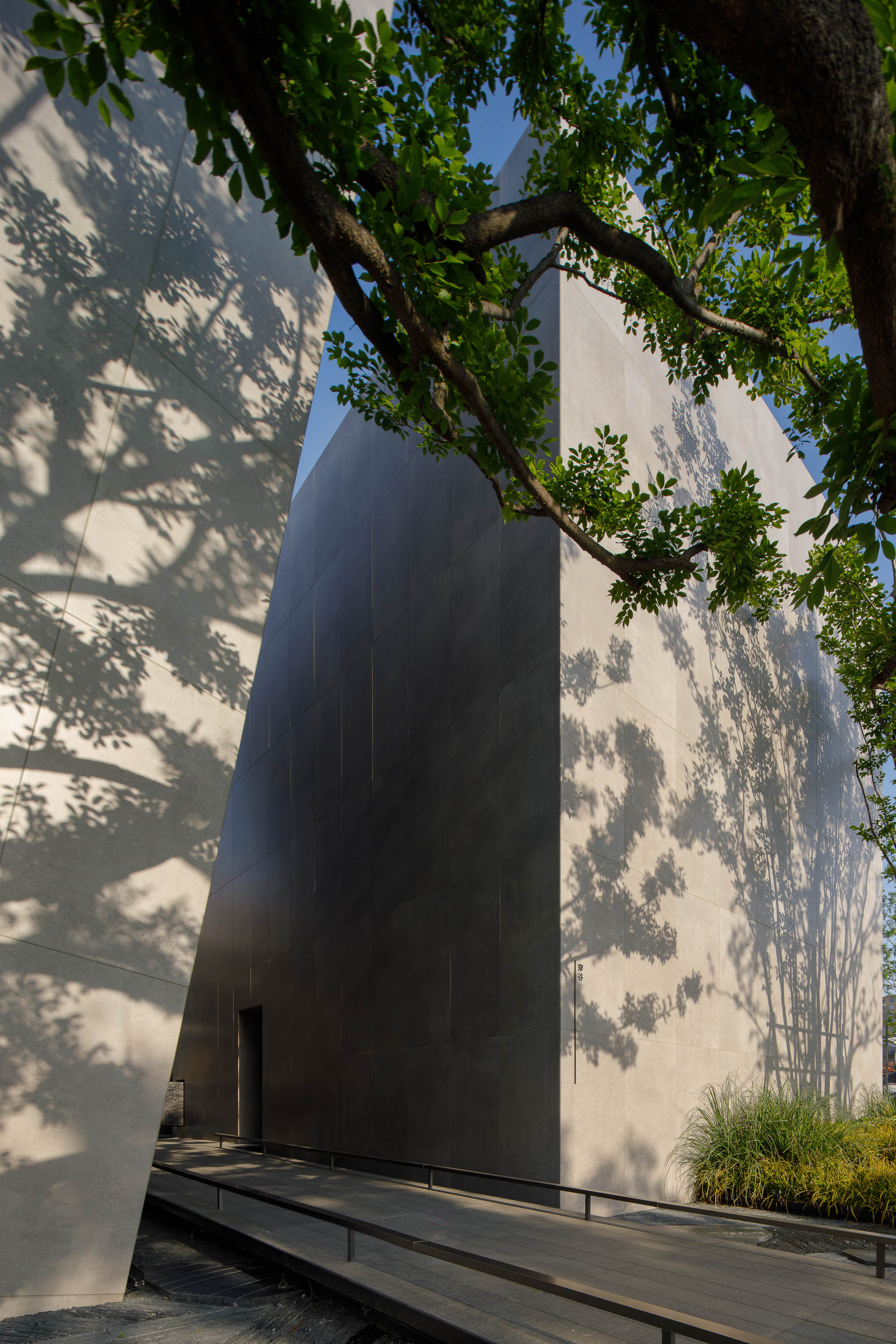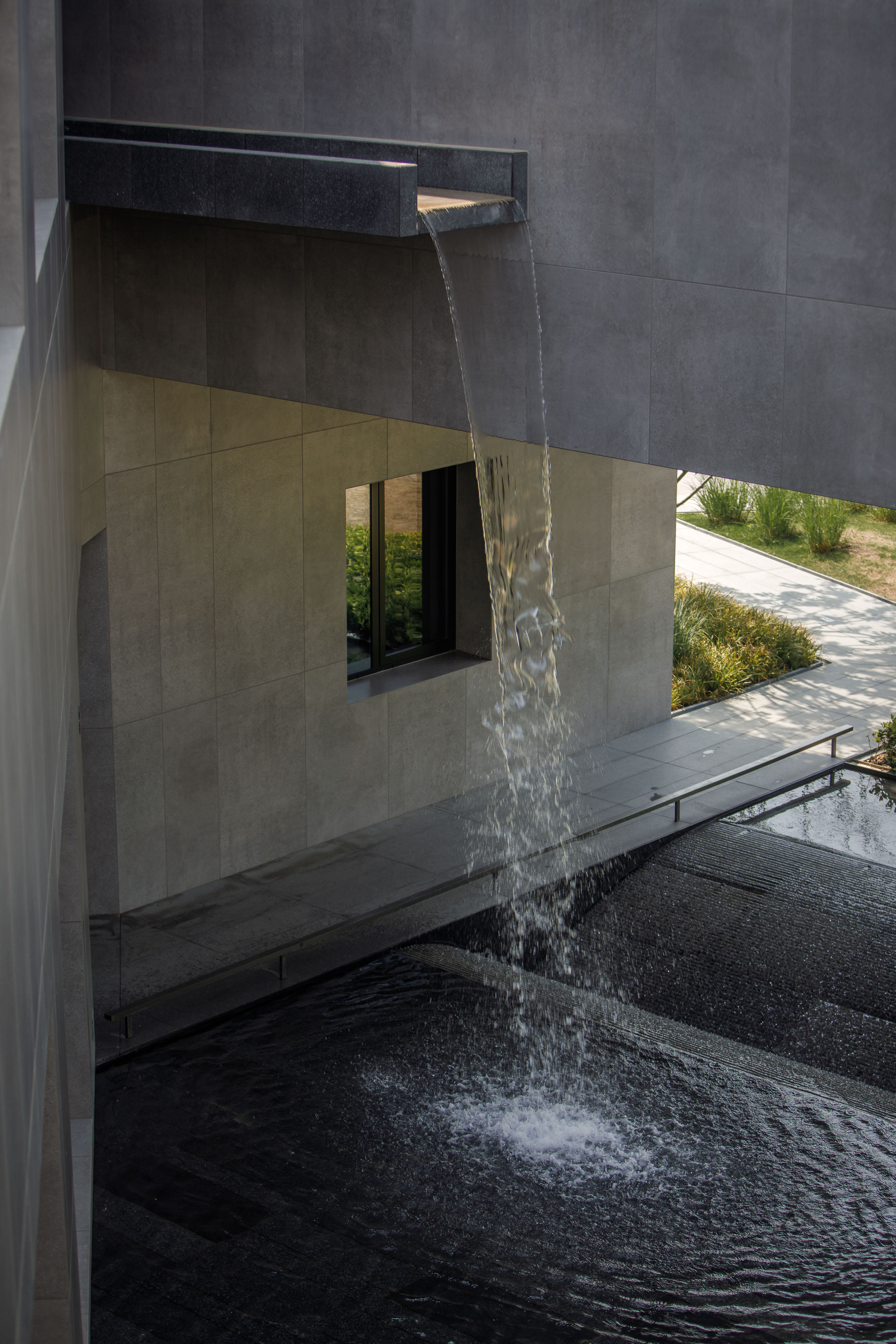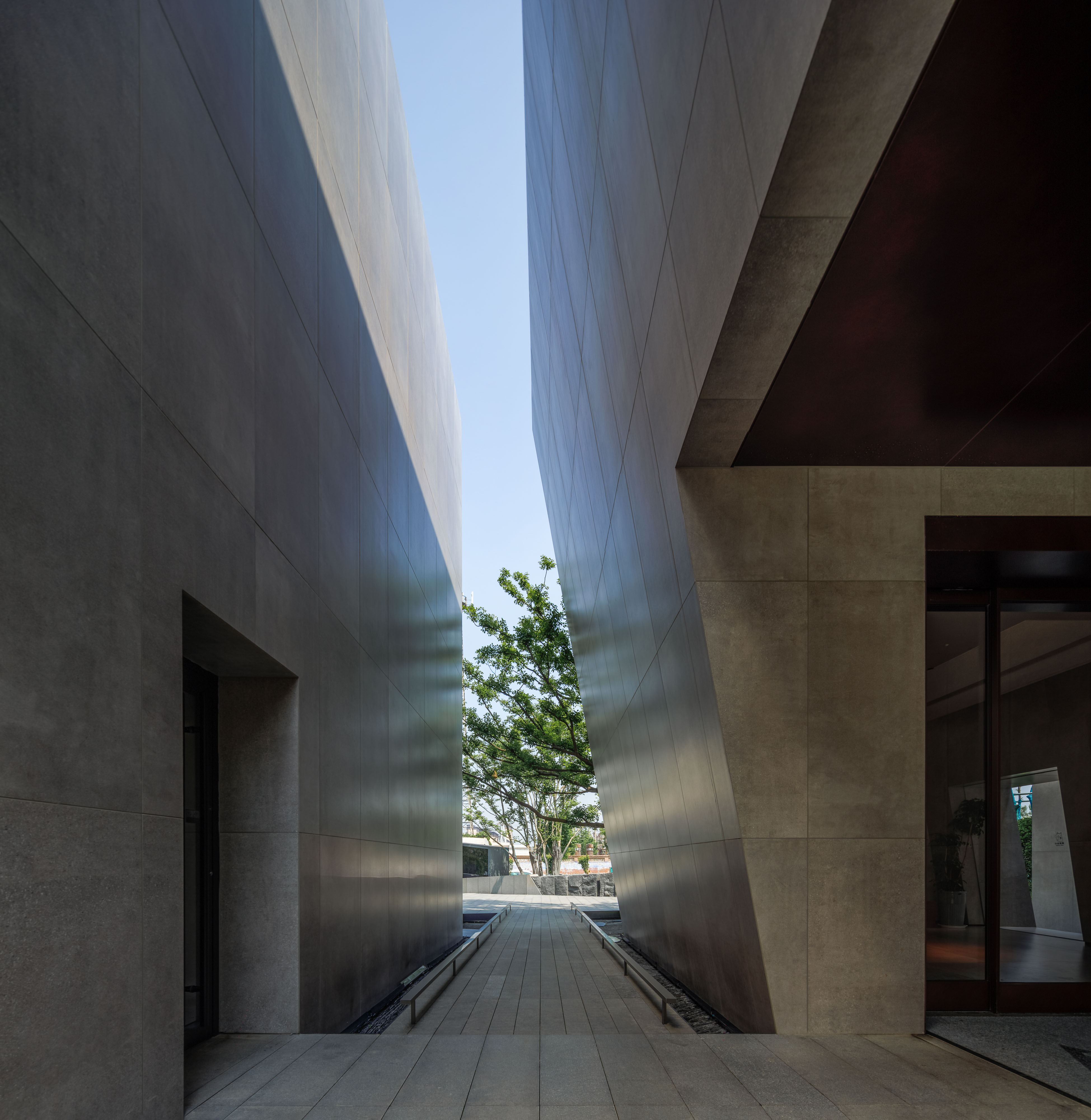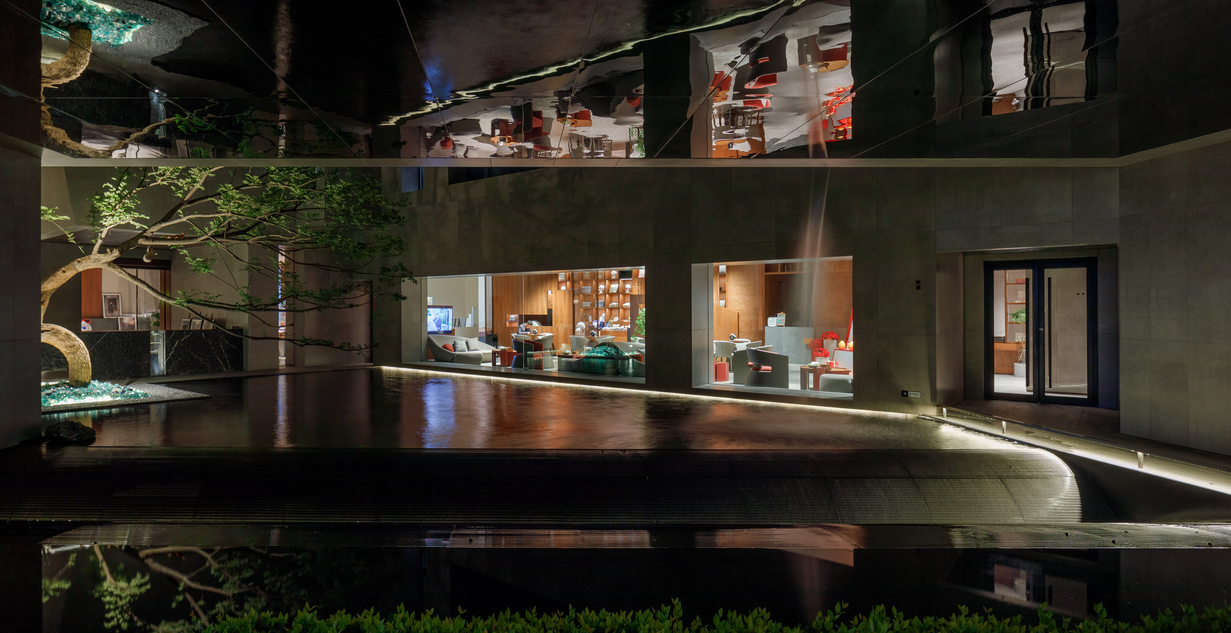 将建筑做成了一个极简的围合水院,造型简约典雅,使展示区域在闹市中拥入了一方静谧,隐其风华。
