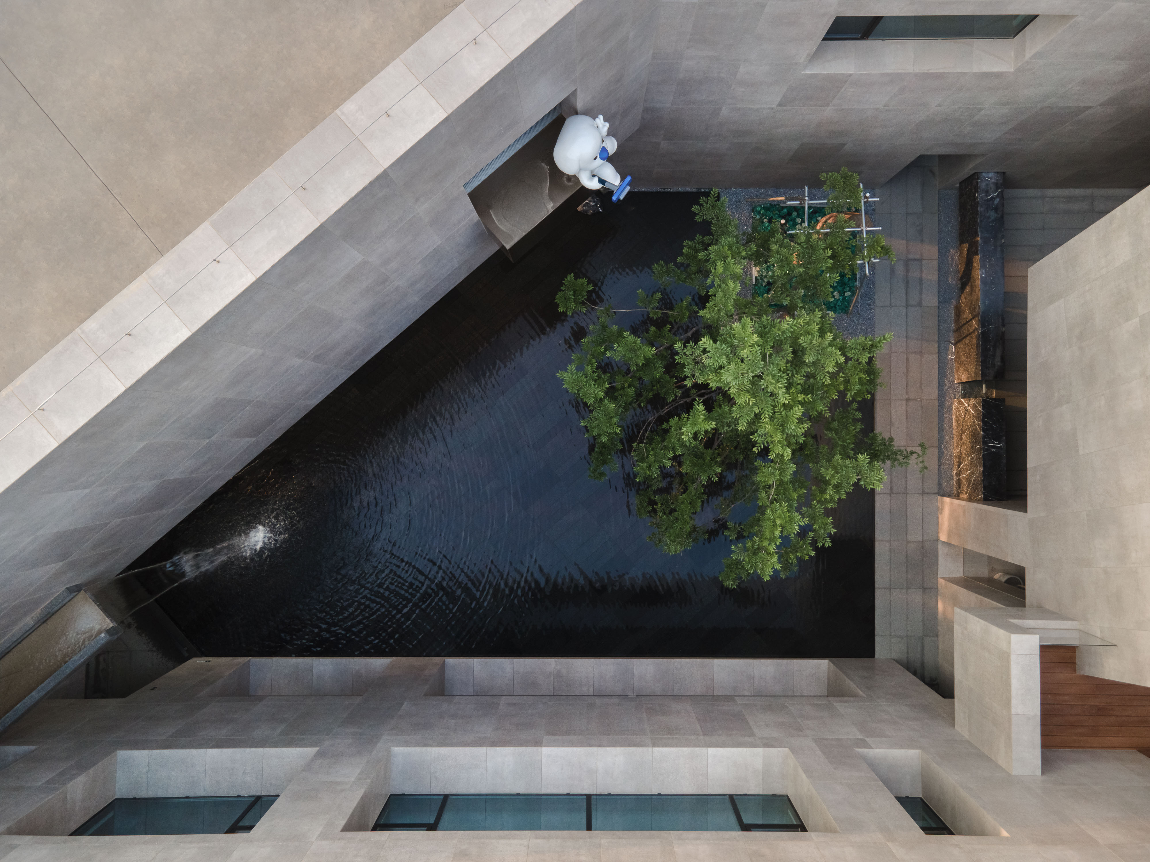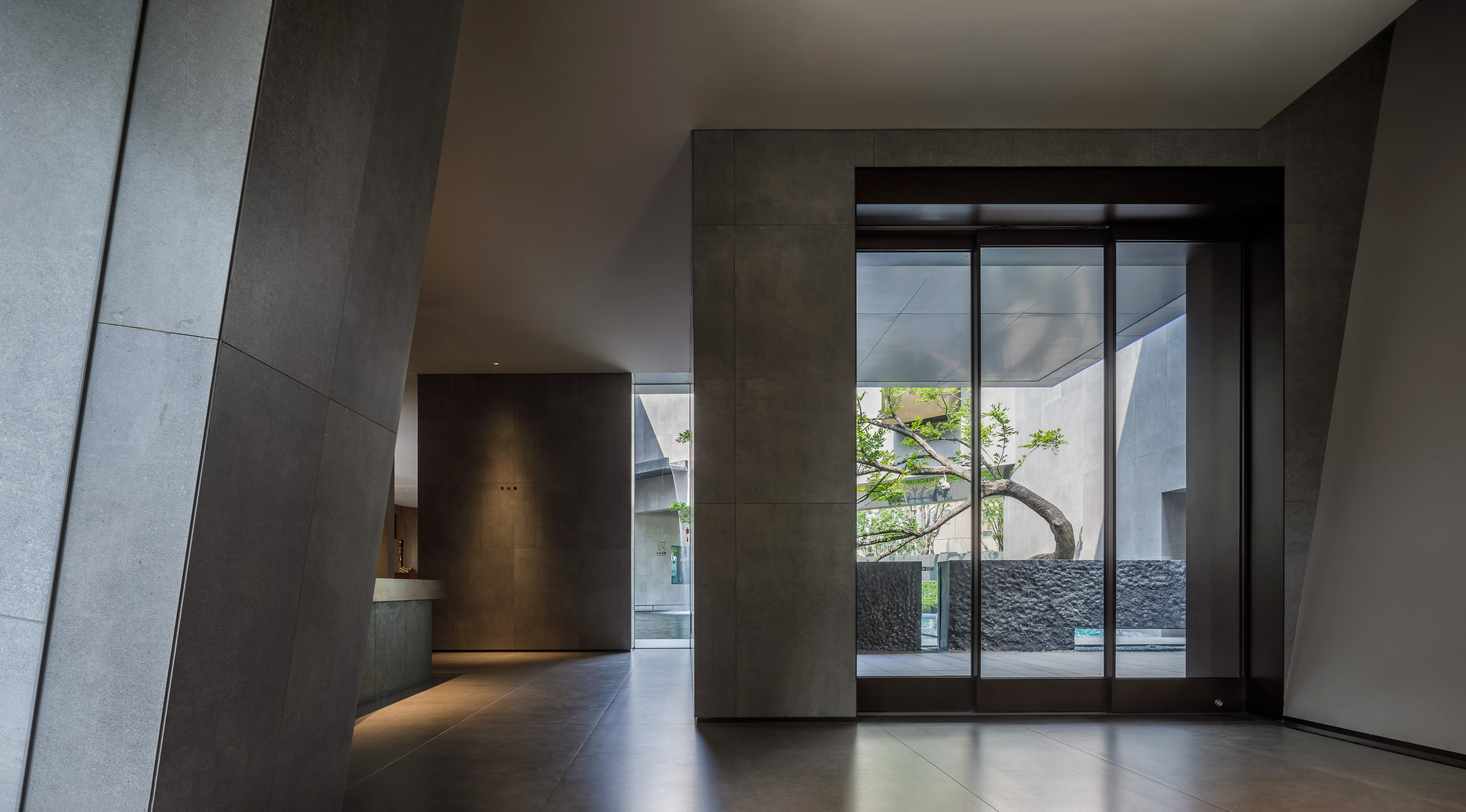 门厅空间内最大限度地使用了自然光,将光线自然投射于室内,落地的玻璃窗模糊了空间的界限,引山入水,踱步之间可见山之景、水之形跃然于眼前。在空间中将自然引入室内,眼前的落地窗映射了水院的树影,仿佛置身于山林之中。