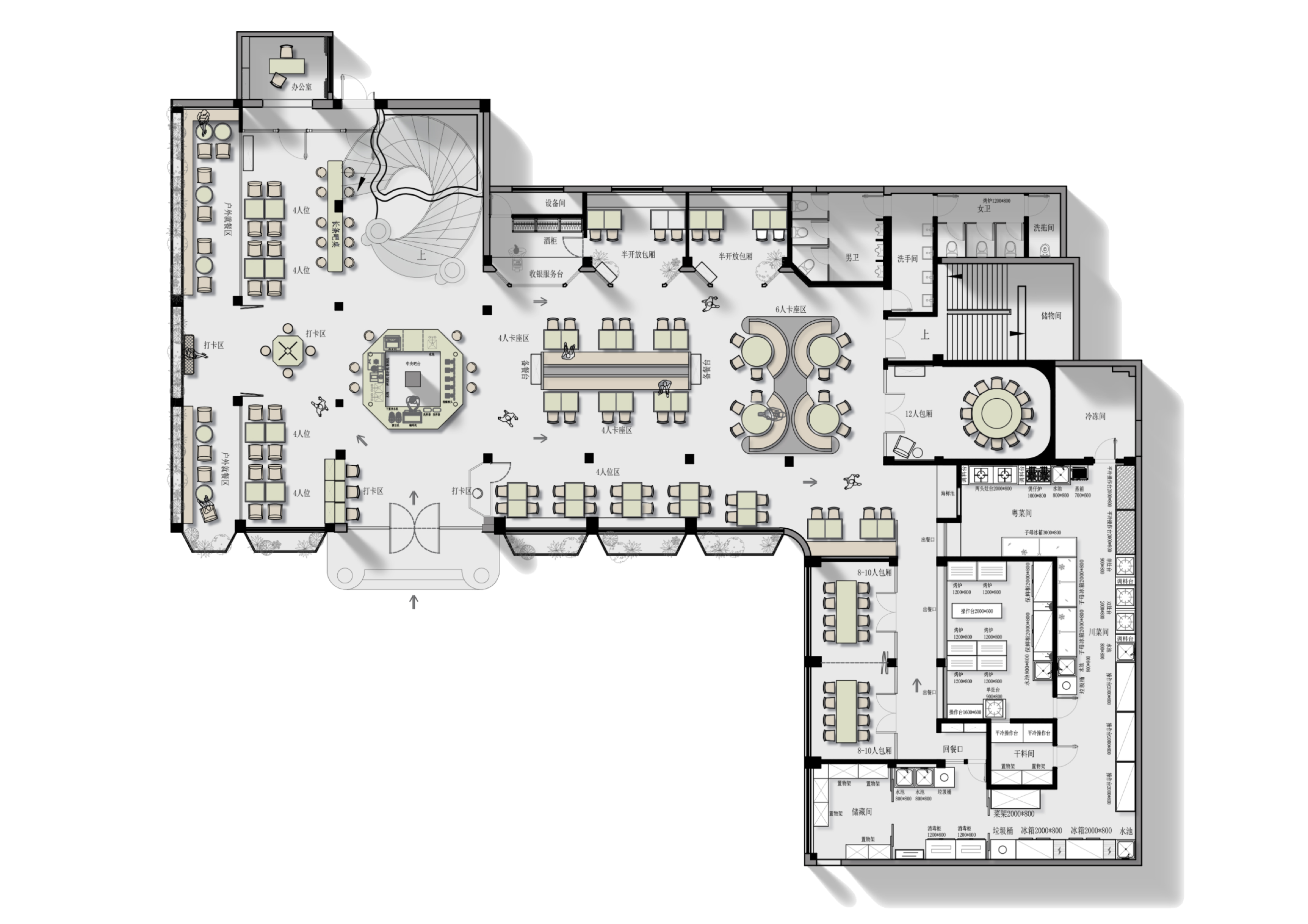 一个餐厅的成功并不全是由美食和服务决定的,它必须始终注重视觉效果,在色彩、形态和材质等方面进行了现代化的改良,从而实现了一种独具魅力的视觉效果。本设计注重空间的灵活性,让顾客在用餐的同时,可以感受到空间的变化与美感,从而创造出一种亲切、轻松的用餐体验。