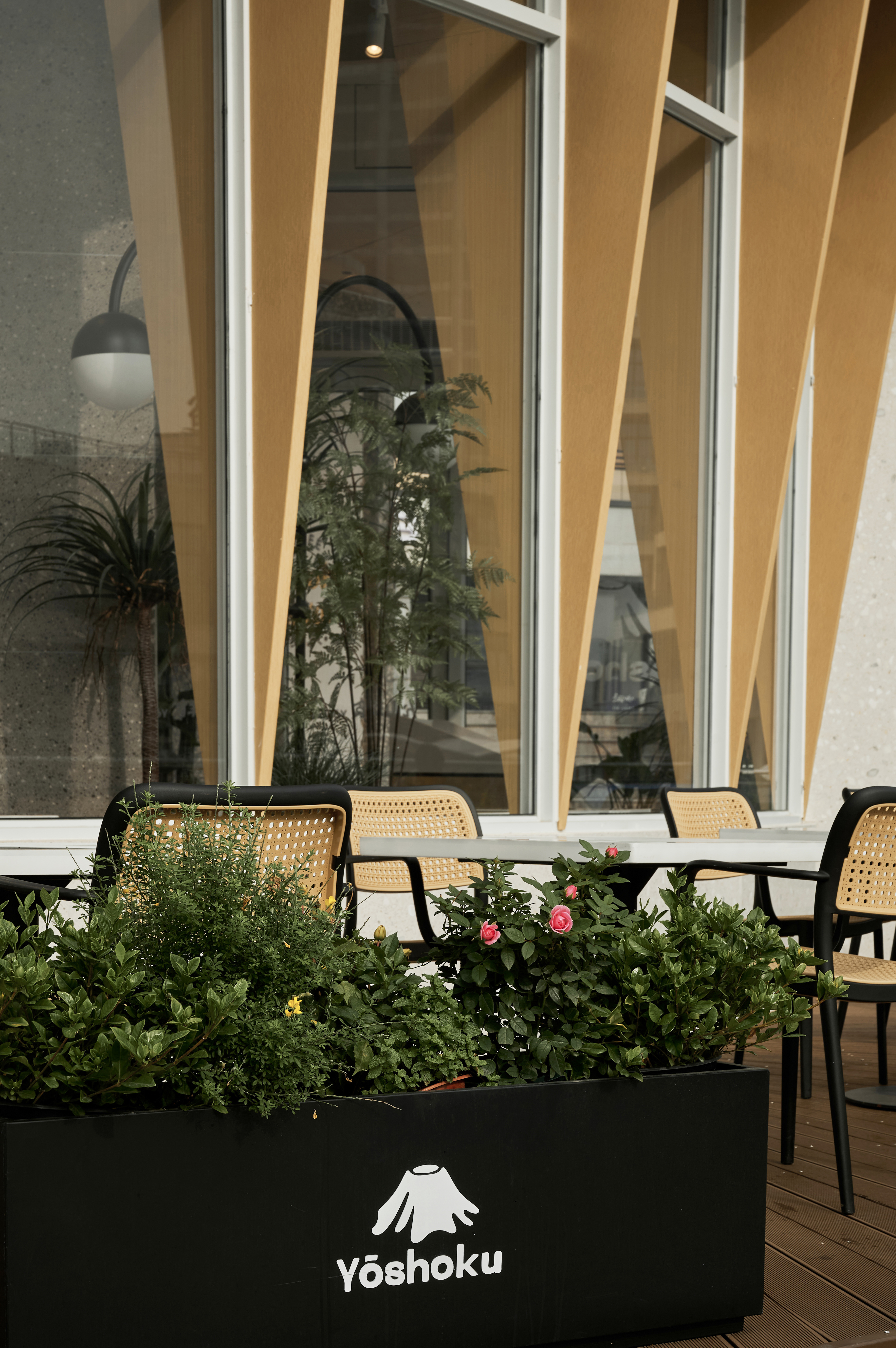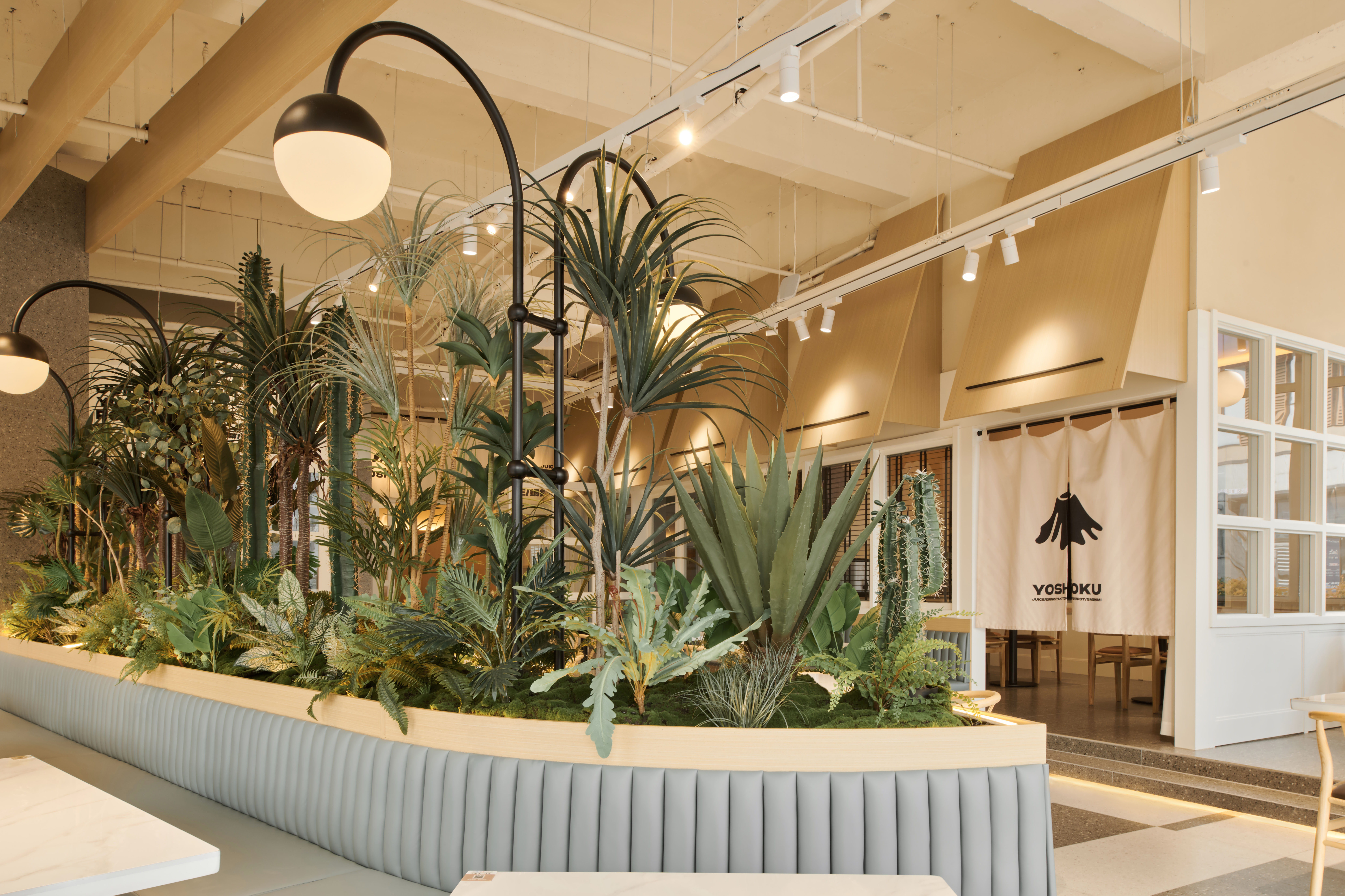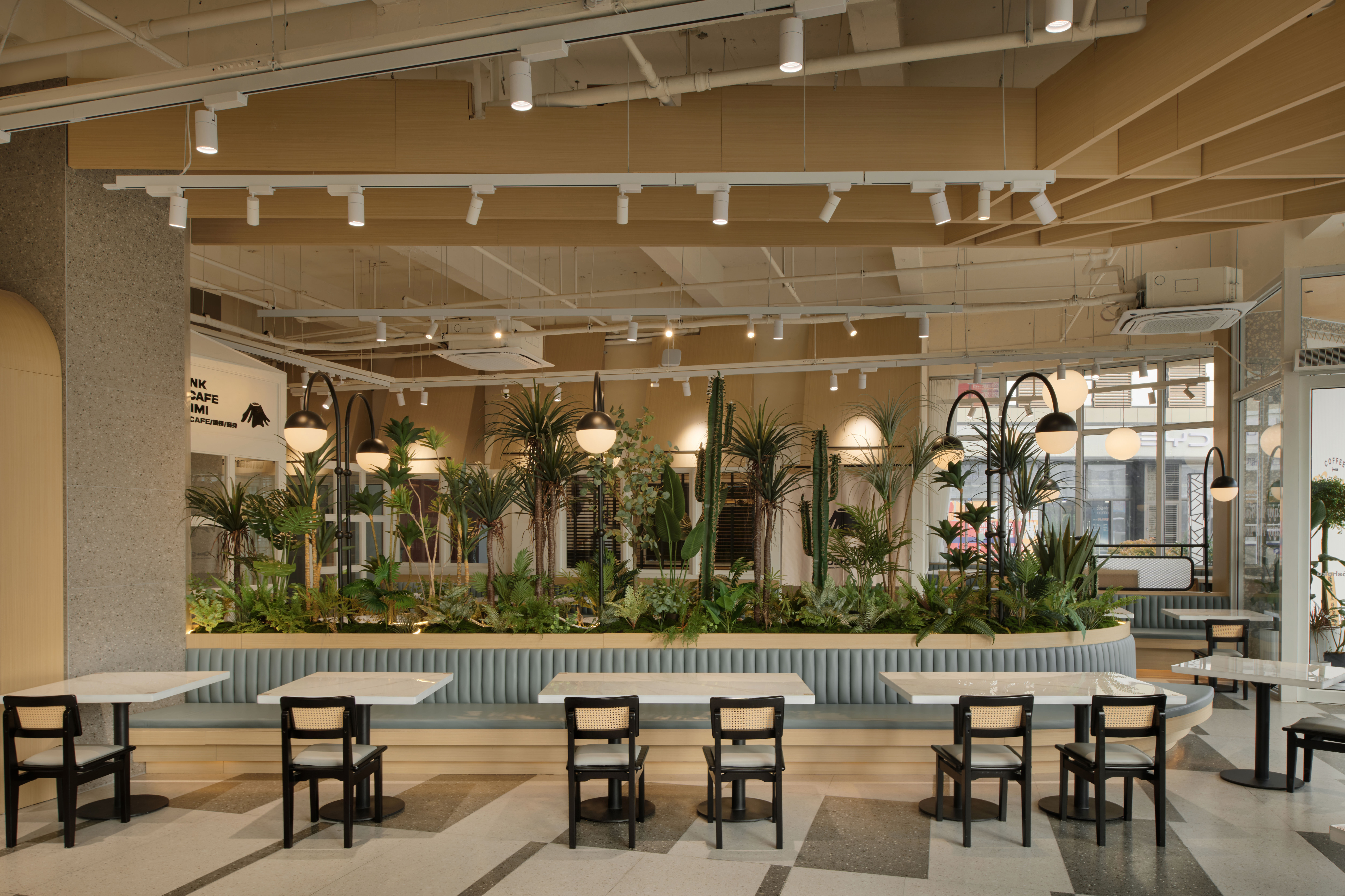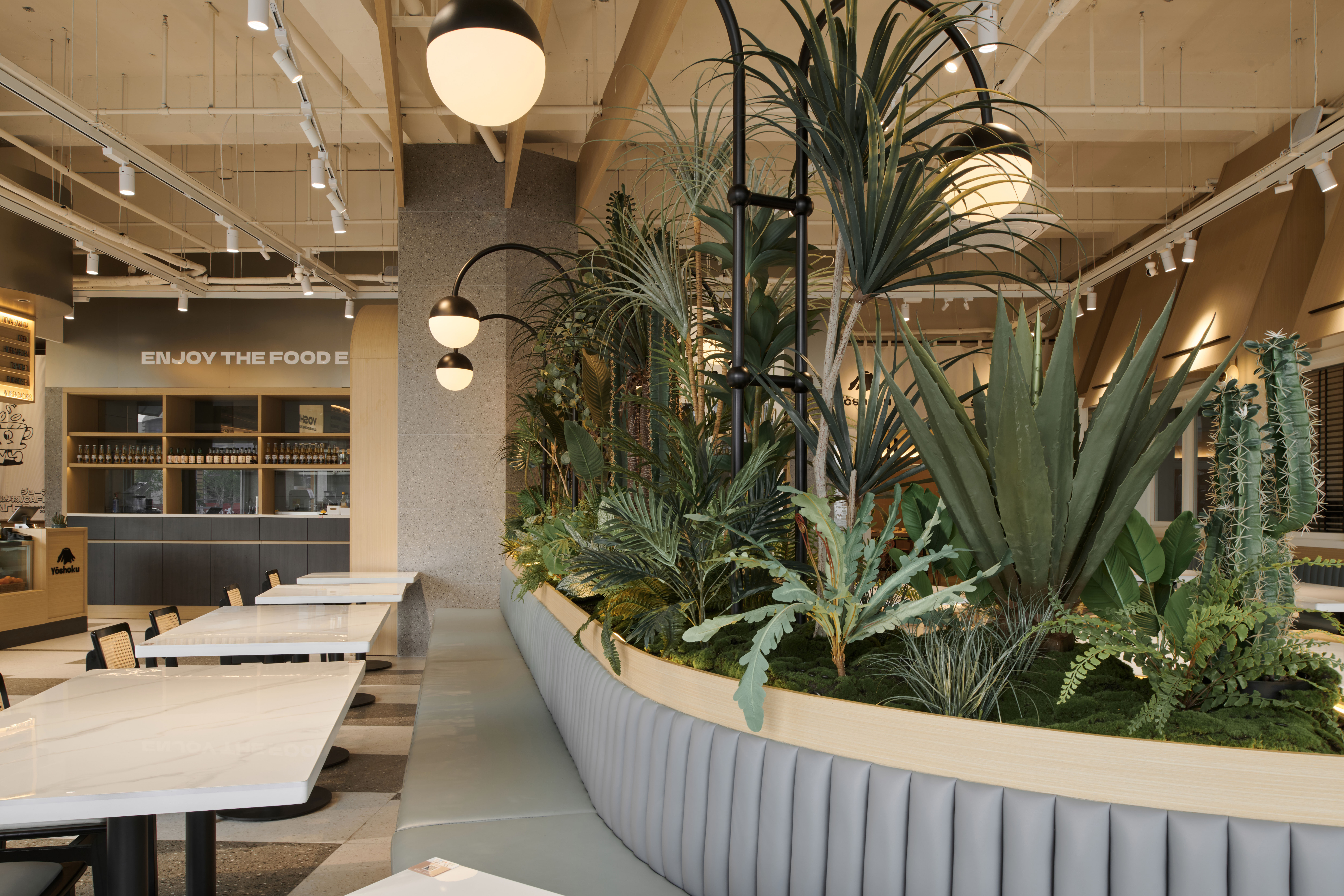 通过材质进行叙事,带来更为纯粹的感官体验,语言边界的模糊,为用餐带来充满想象的余味。空间不同的就餐区域,形成两个不同的用餐高度,植物的堆砌有效的将卡座划分为两个就餐区,延续着自然细腻的质感,木质造型设计出来的屋檐让天花和墙面链接,拼花地板采用不规则铺设,象征着自然界中万物的随机生长。