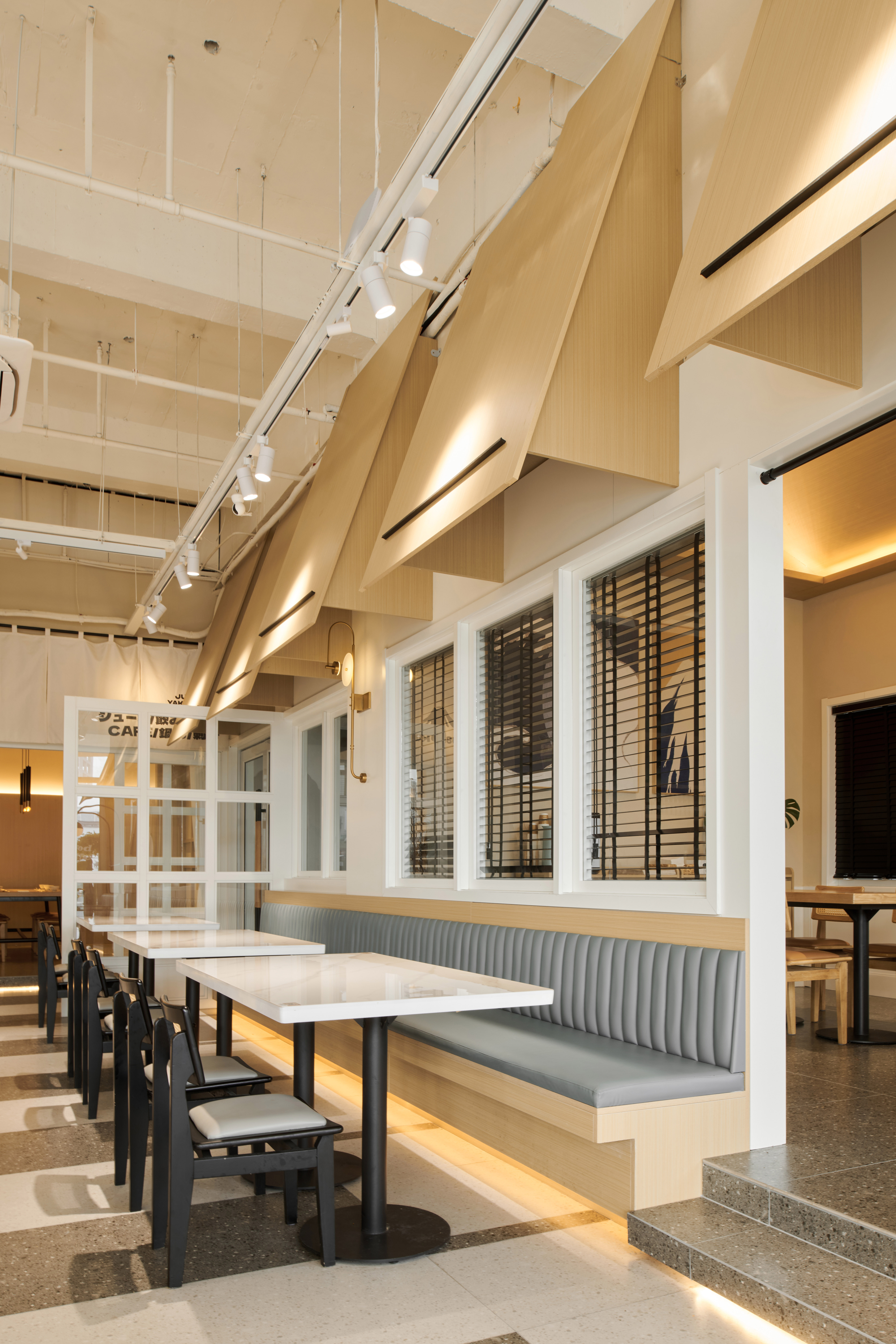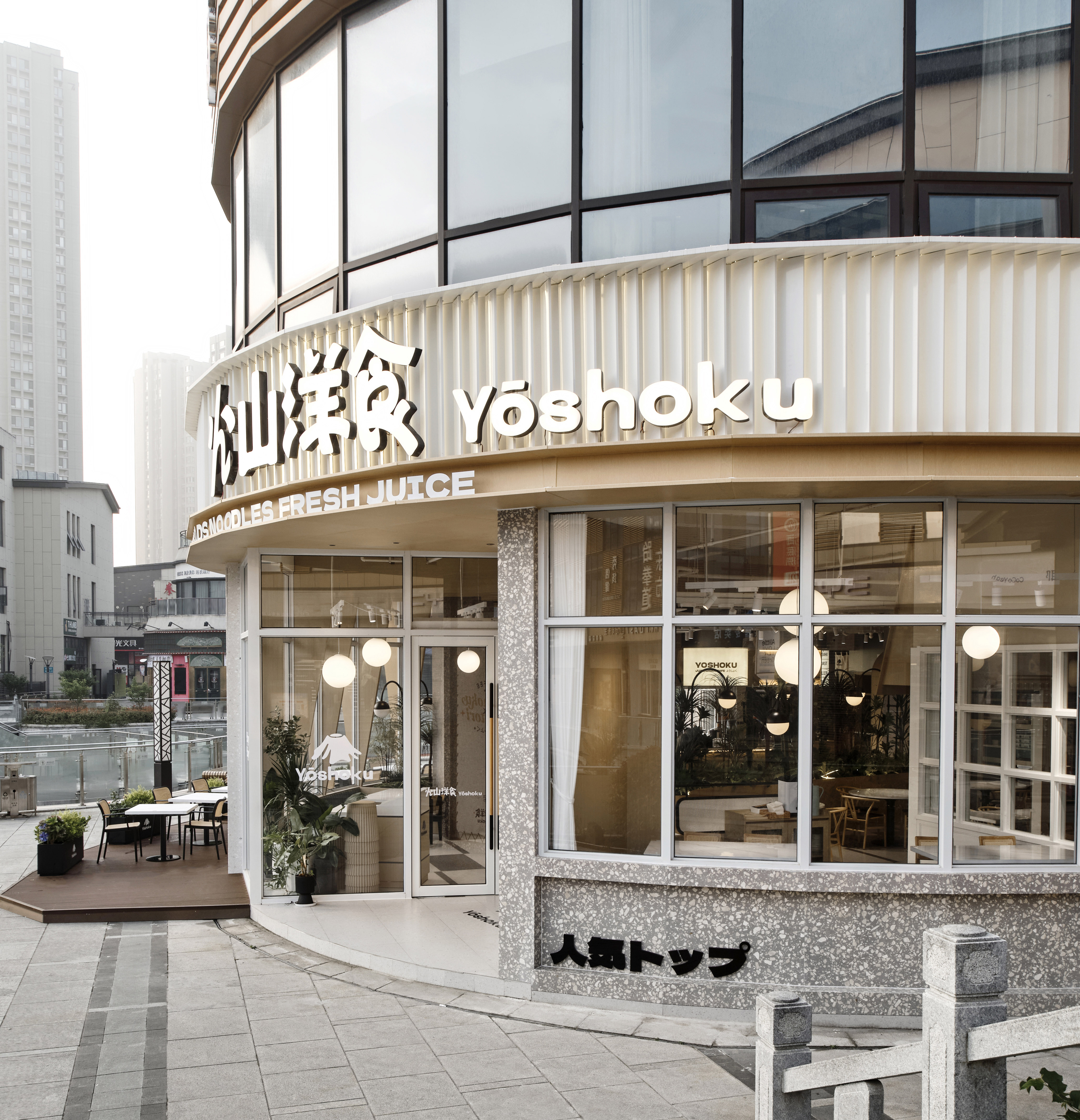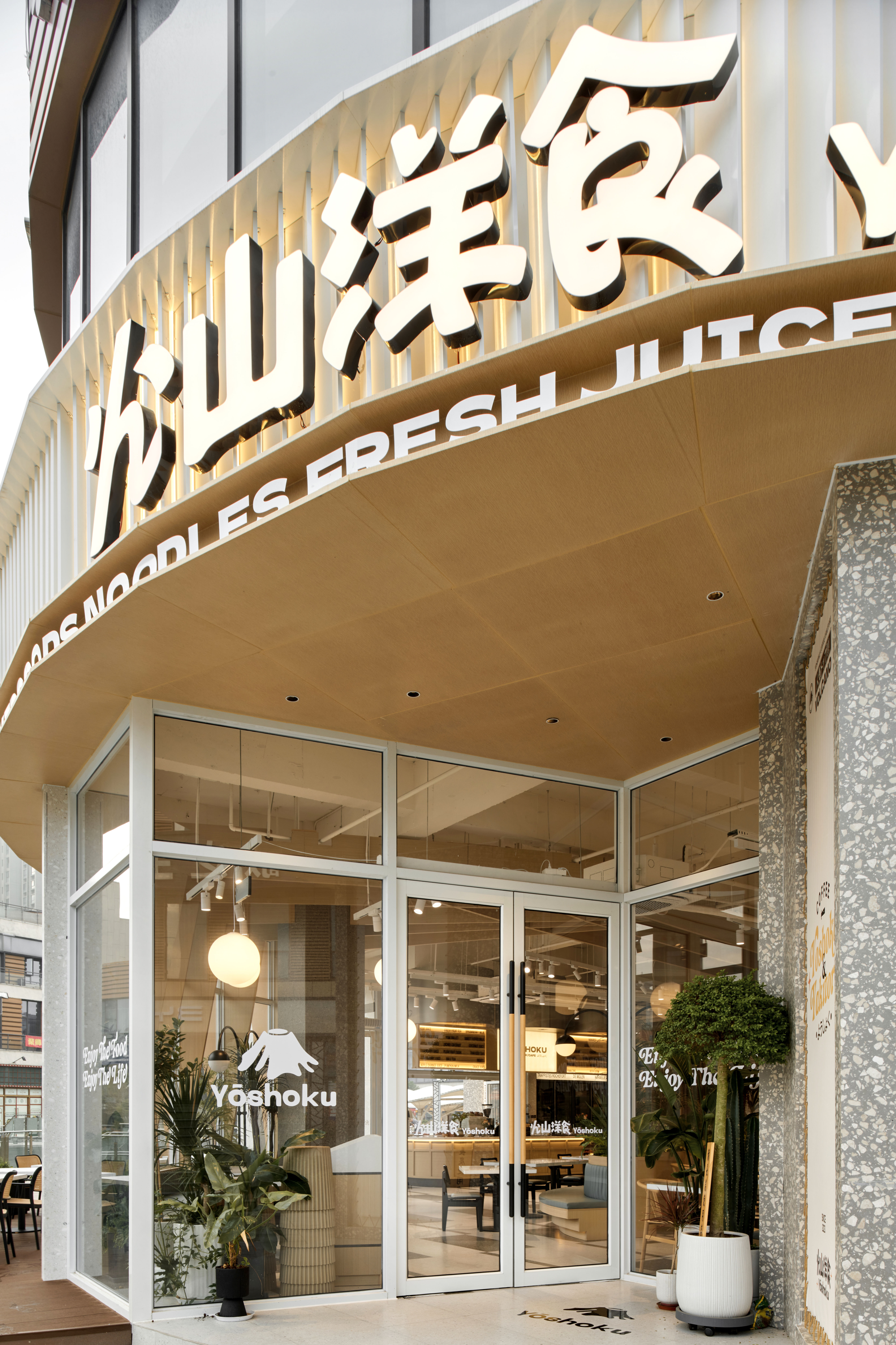 场地独有的优势在于其空间有着极好的室内外体验,并且室外的平台立于大片的水面之上。白色和木色让整体显的温暖,干净,拥有这么宽敞的展示面是亮点,再加上圆弧的围合,在外立面的展示上就加分了,设计了通透的采光玻璃,在垂直面上结构变化,让门头和室内空间有更好的贯穿性,路人可以慢下脚步,也会慢慢观摩,让食客们有“照”可拍。结合灵活空间从而达到和消费者的情感连接。