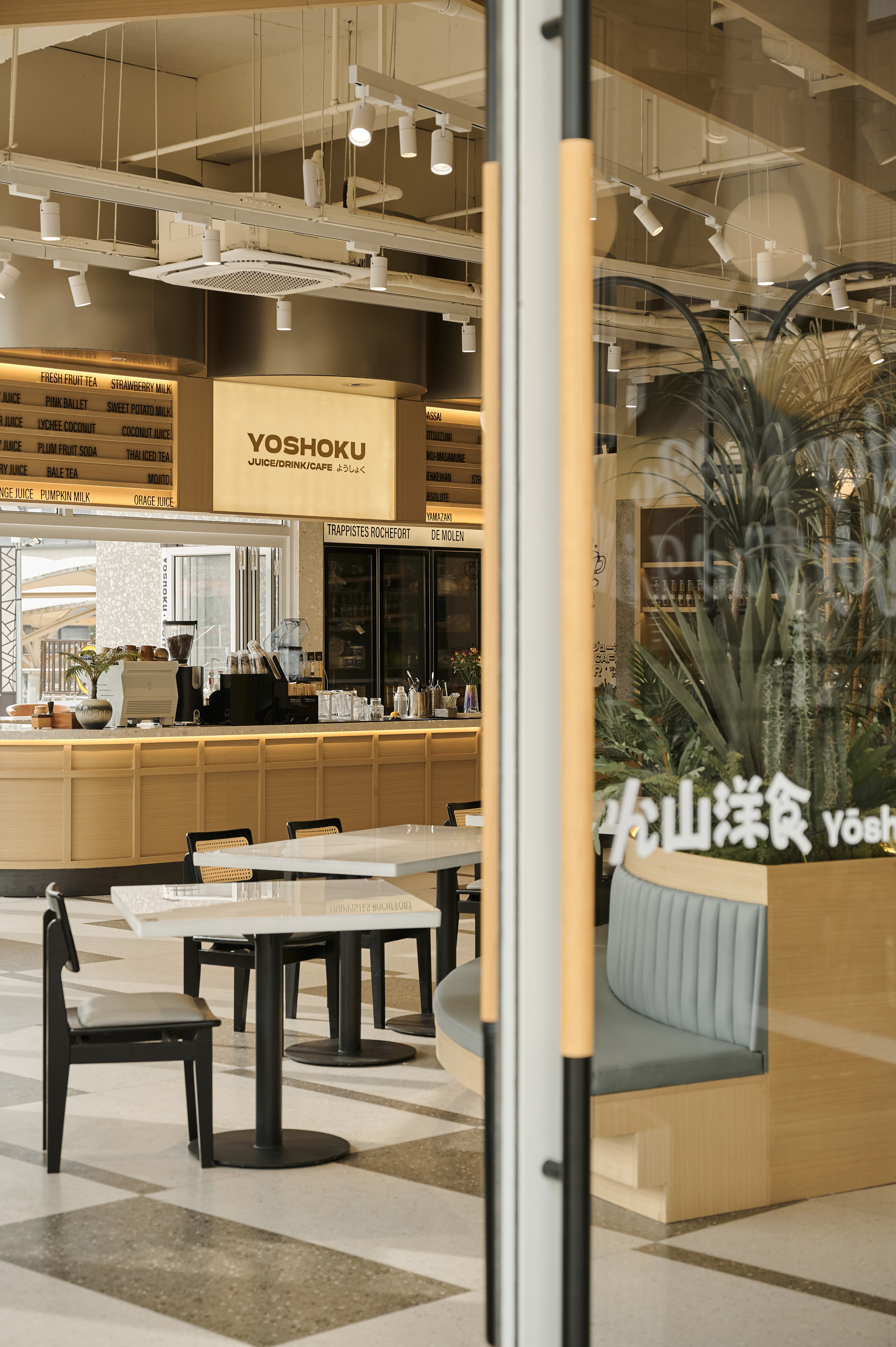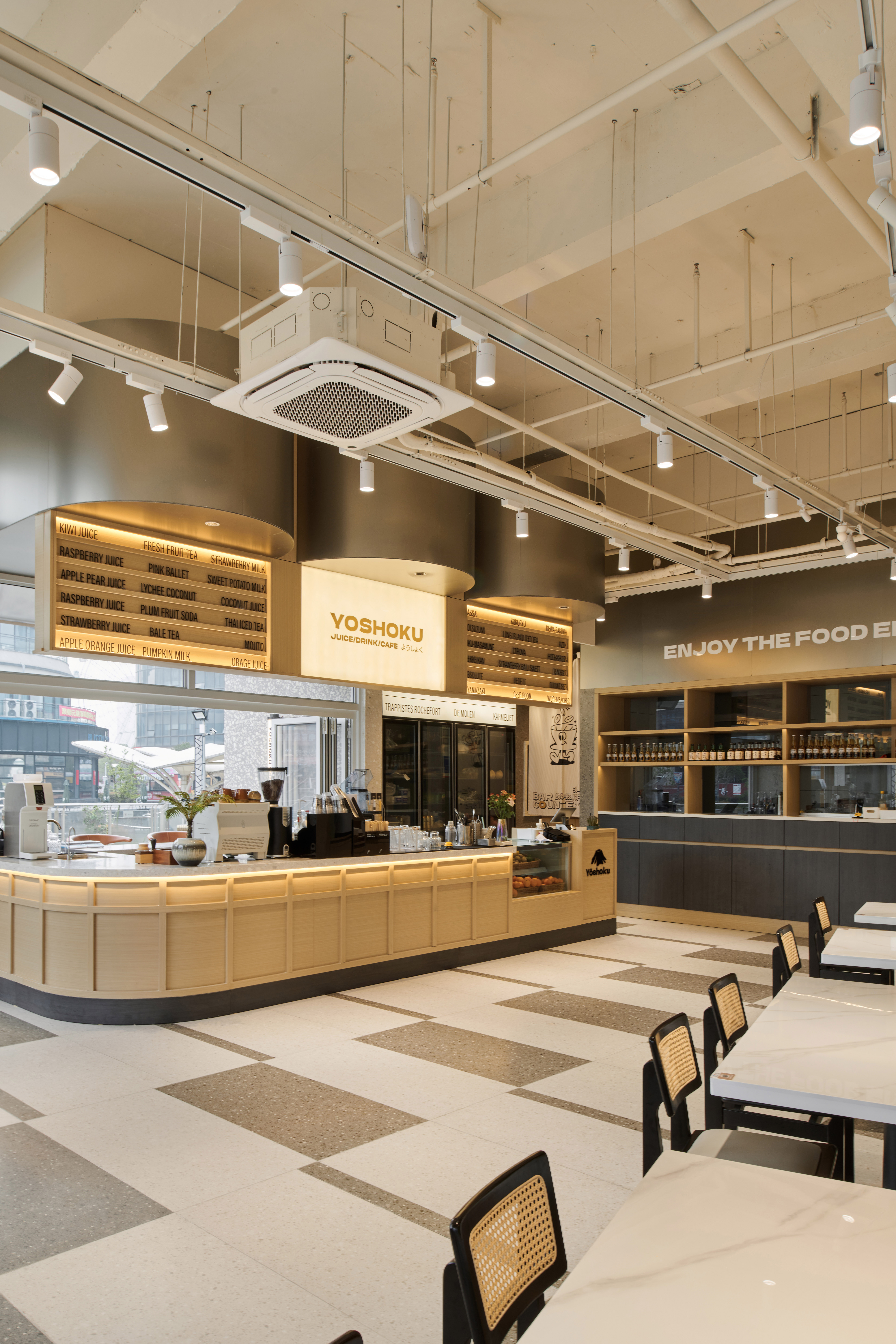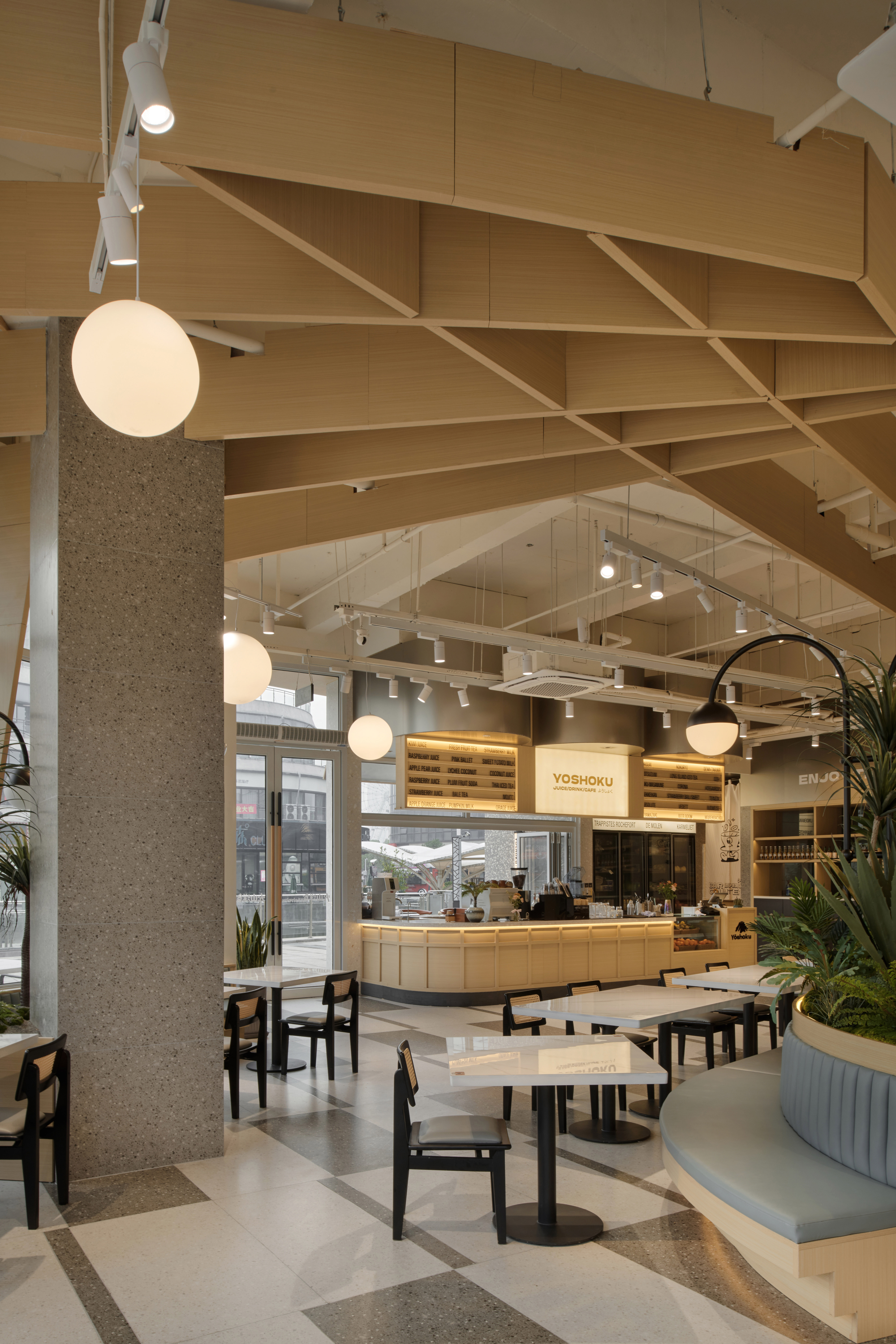 场地独有的优势在于其空间有着极好的室内外体验,并且室外的平台立于大片的水面之上。白色和木色让整体显的温暖,干净,拥有这么宽敞的展示面是亮点,再加上圆弧的围合,在外立面的展示上就加分了,设计了通透的采光玻璃,在垂直面上结构变化,让门头和室内空间有更好的贯穿性,路人可以慢下脚步,也会慢慢观摩,让食客们有“照”可拍。结合灵活空间从而达到和消费者的情感连接。