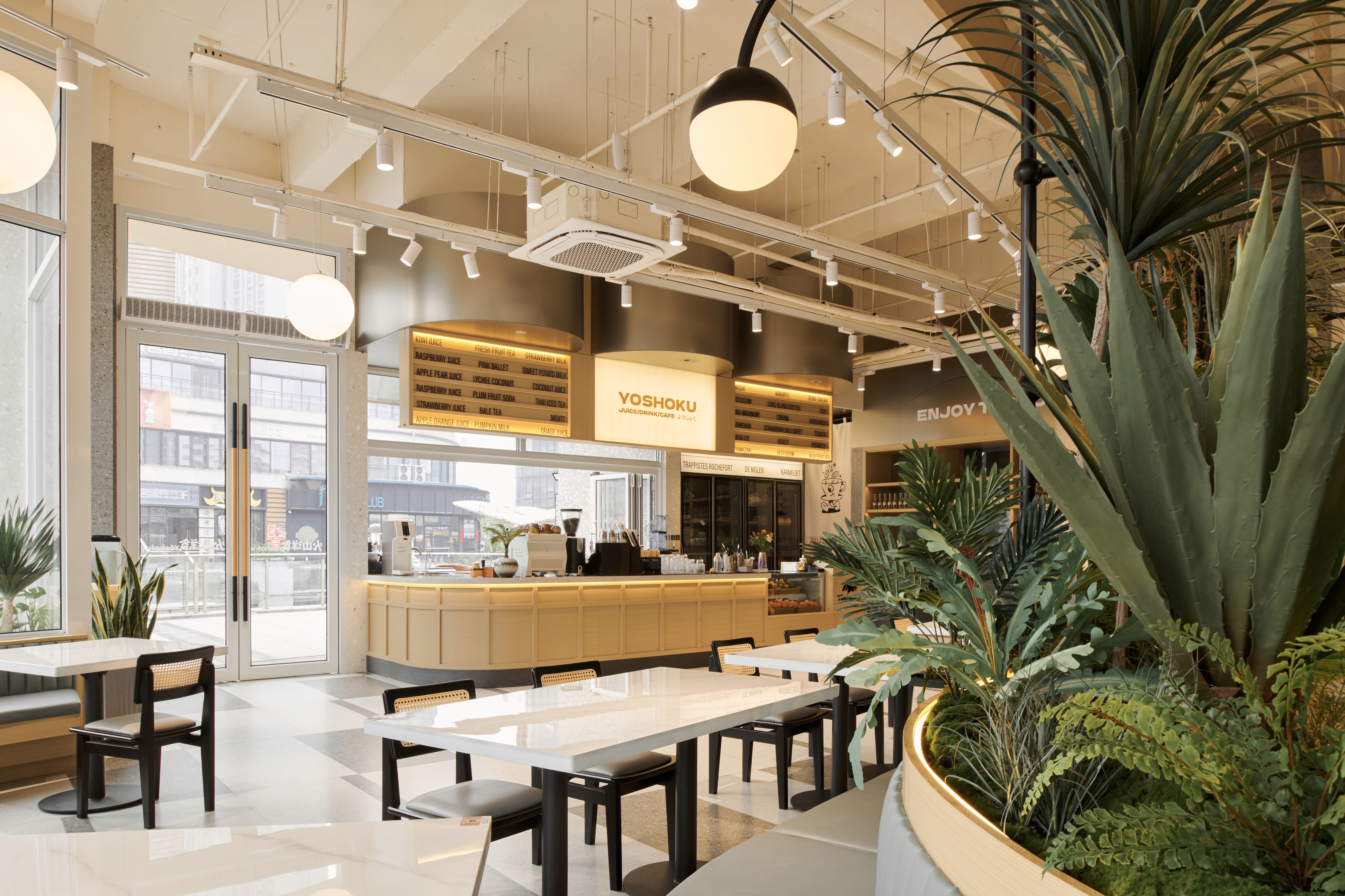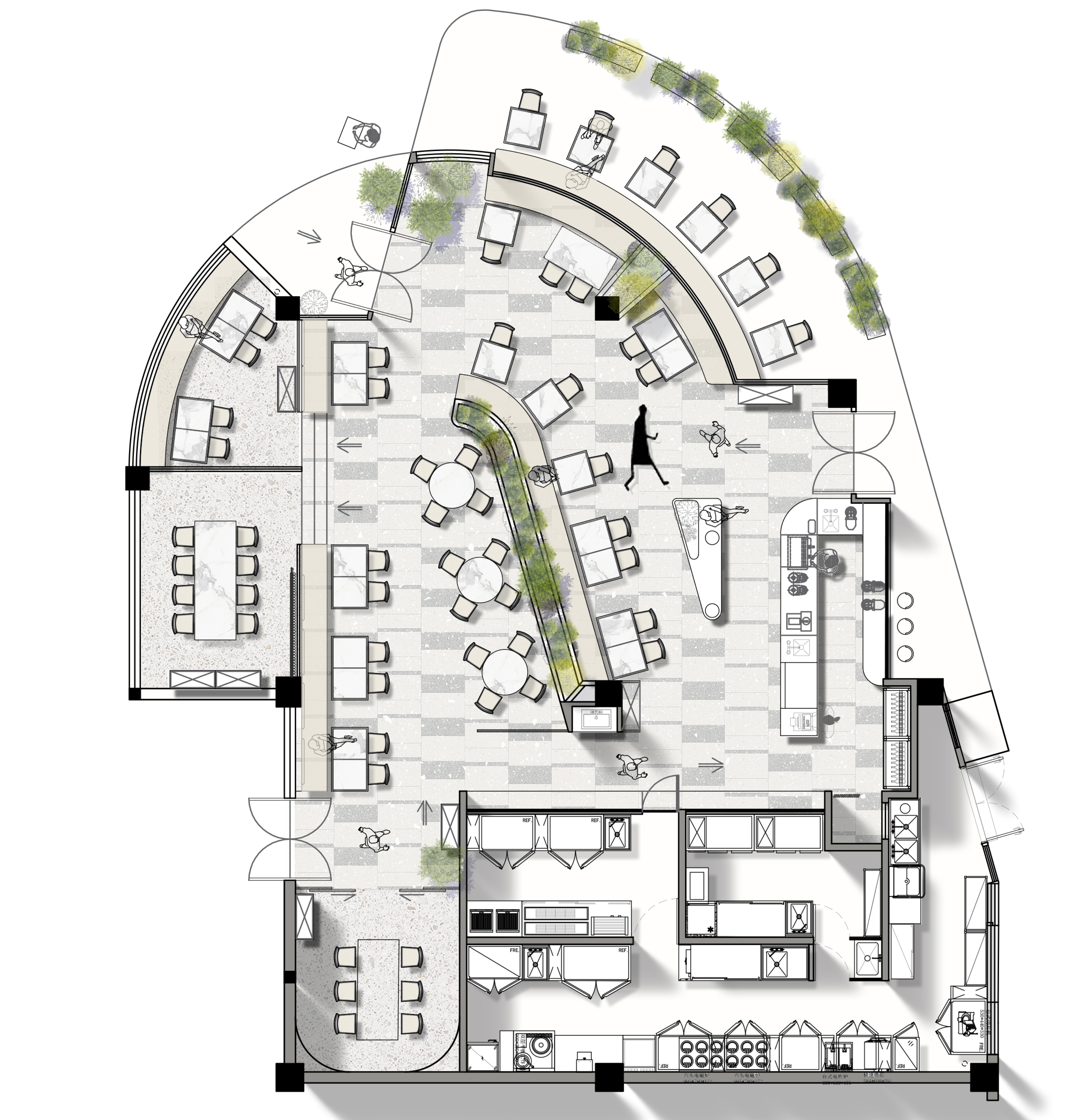 对于餐饮空间来说,布局我们起初要掌握几个要素点:经营内容/客座数量/运营动线,分析透彻之后,一一整合归纳,轻食餐厅,最先把后厨的位置功能以及明档口区域确定,出餐回餐路线,吧台收银出单的操作流程,满足多少数量的客座位,并且保证每个客座位都是具有包裹性的,以及包厢相互之间的功能需求,那么最后就是在外立面的展示和进入口处,如何吸引人流,如何让人停下脚步,如何让人走进来,开放式的外摆,退入式的空间布景,将保守传统的用餐人们越来越引入户外,都充满了舒适的细节。