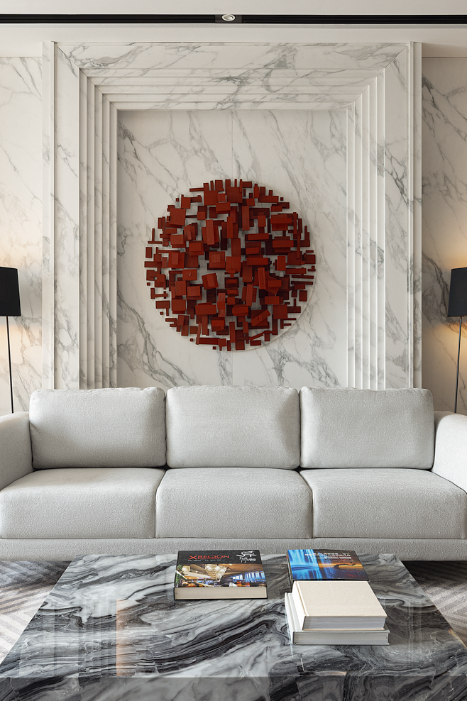 白色大理石盒子体块的转折,上下灯带的强化让它更有立体感和视觉指引。