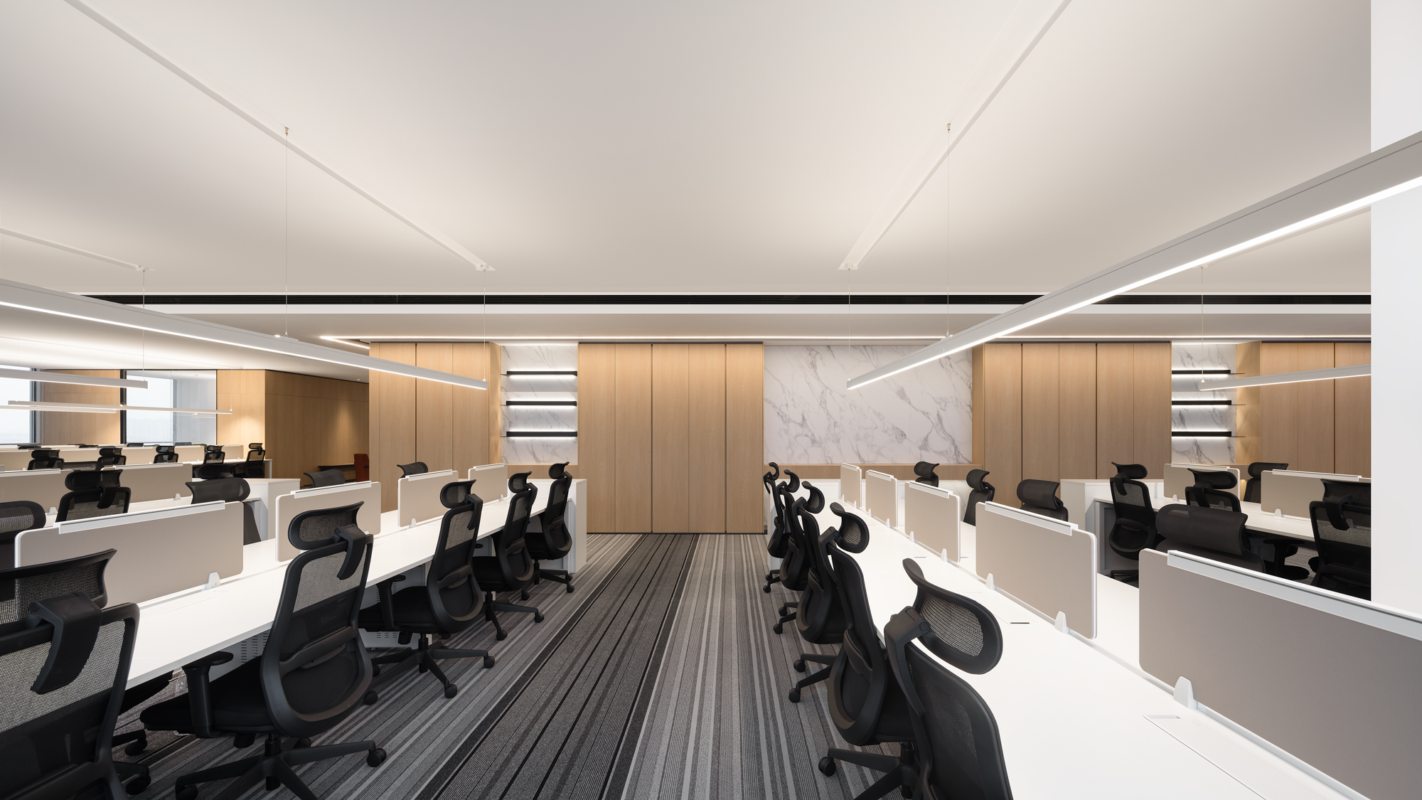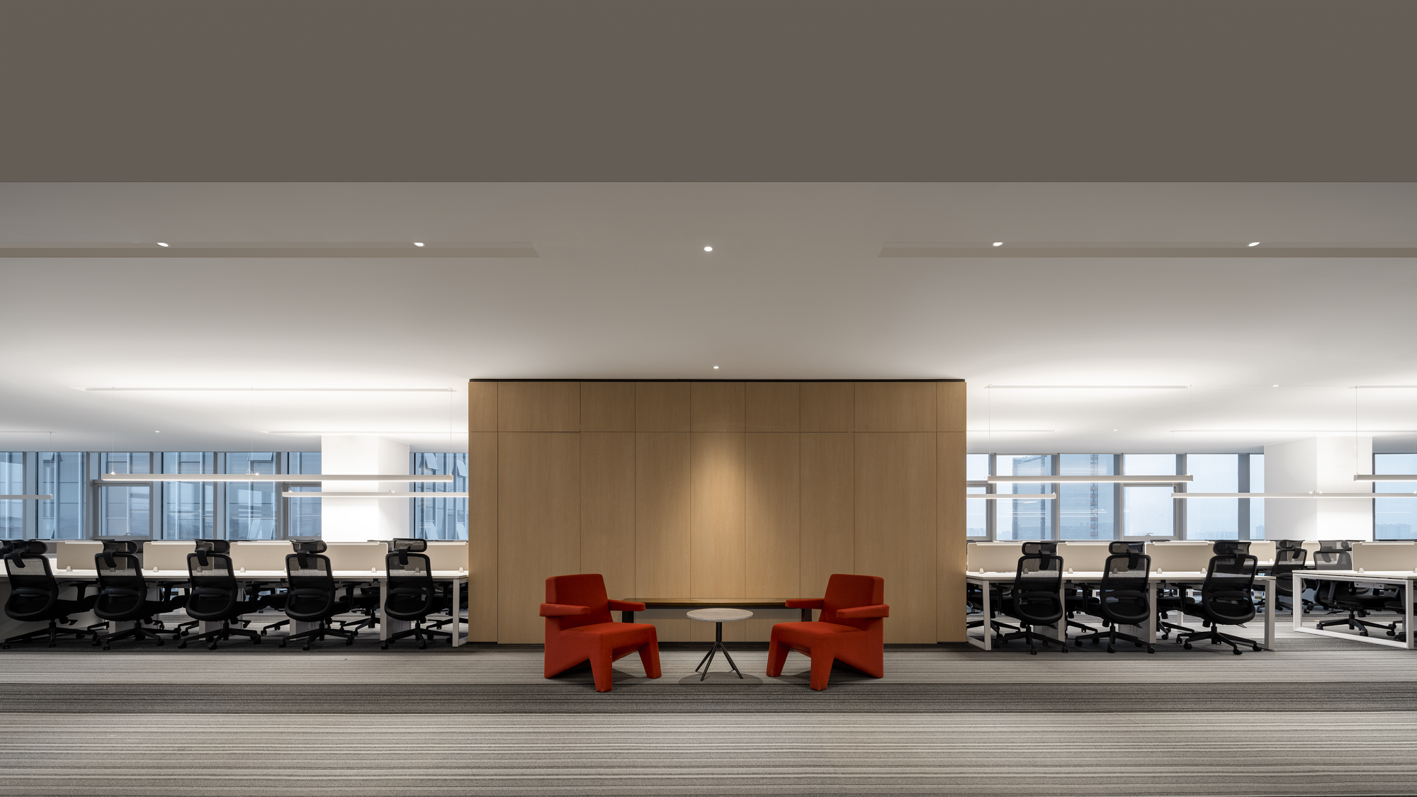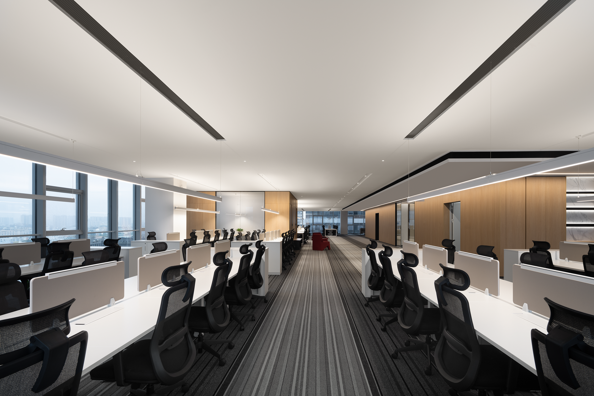开敞式的办公通过天花结构进行功能分区,大面积条纹地毯的通铺让空间独立又整体。