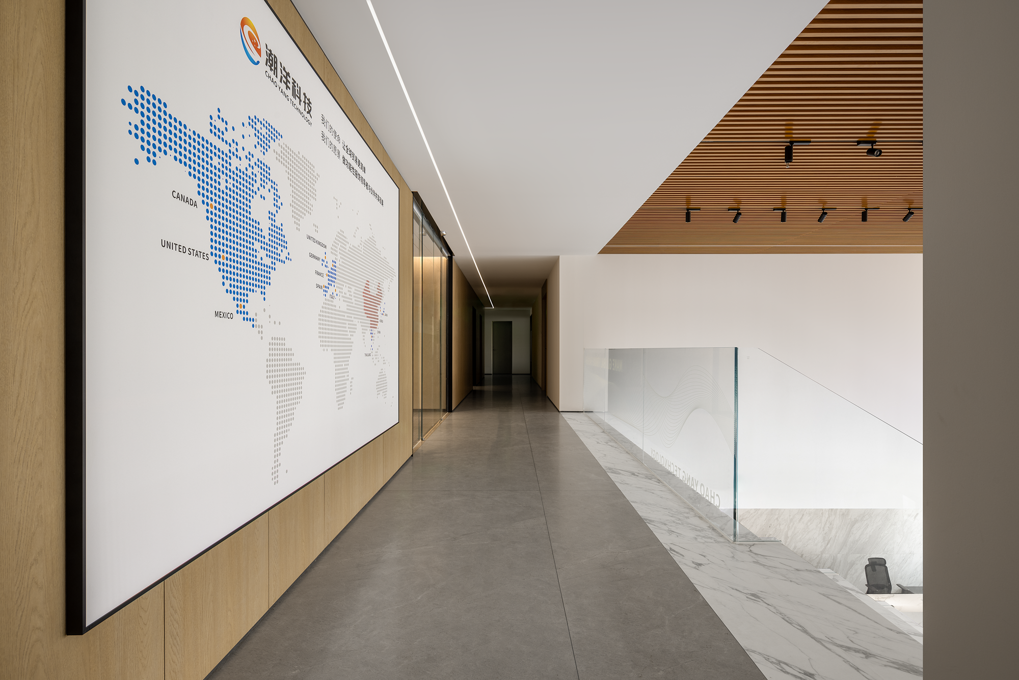 楼梯上到二楼的对景则是一个世界贸易地图,向往着企业发展的空间可持续性。