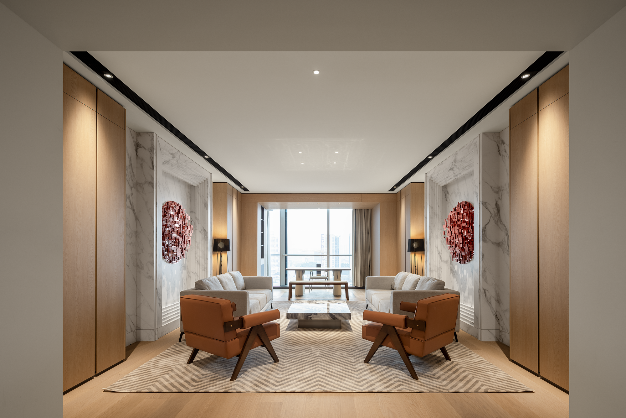 前台大理石背景材质延续到接待性会议室,纹理动线式引导,内外结合互不干扰。