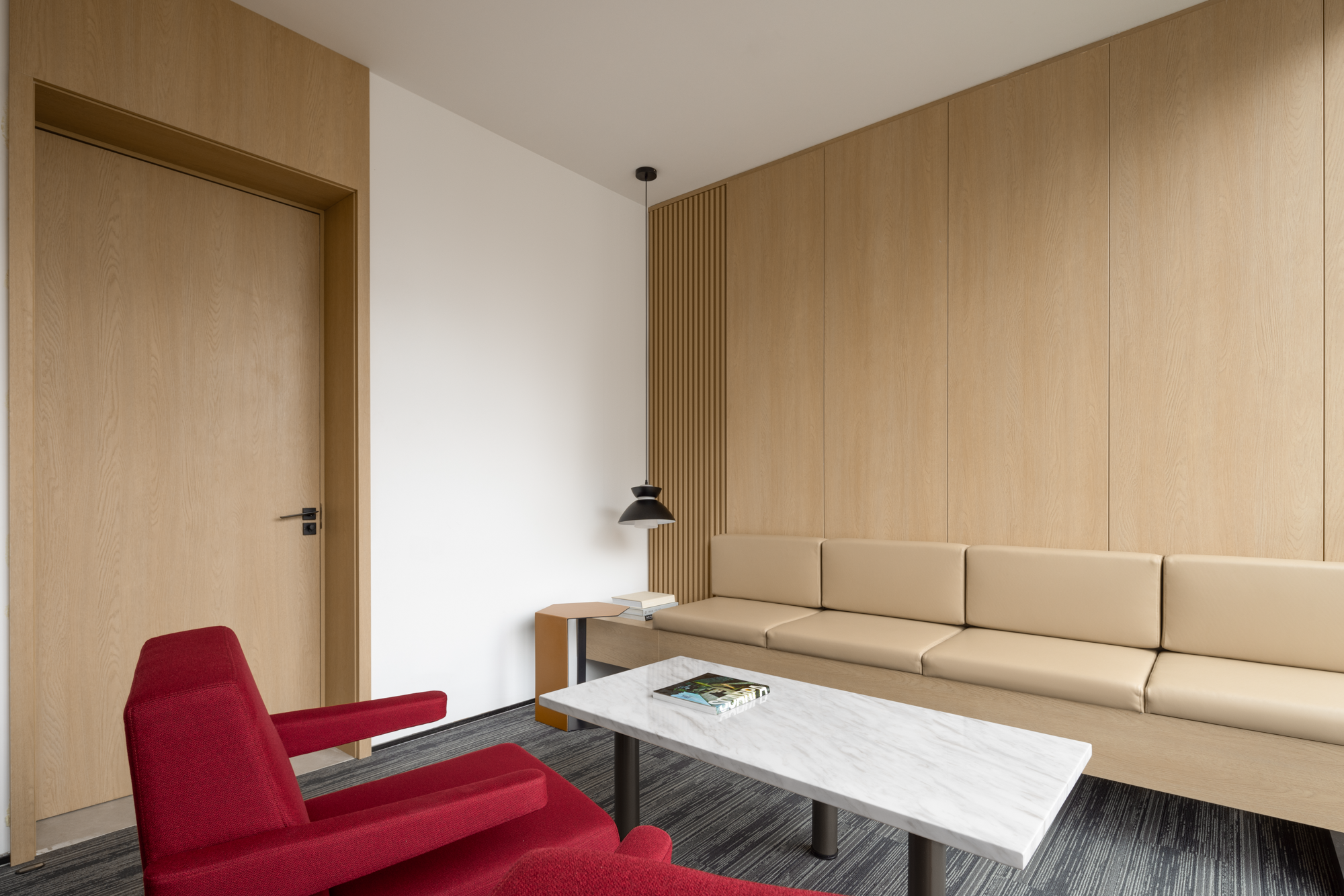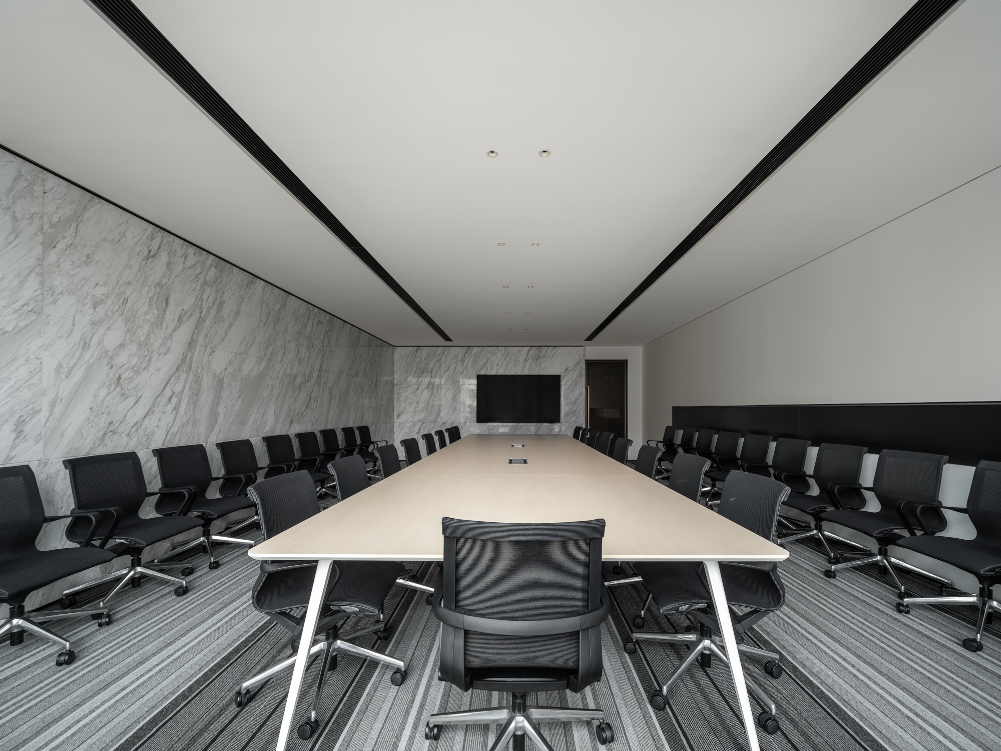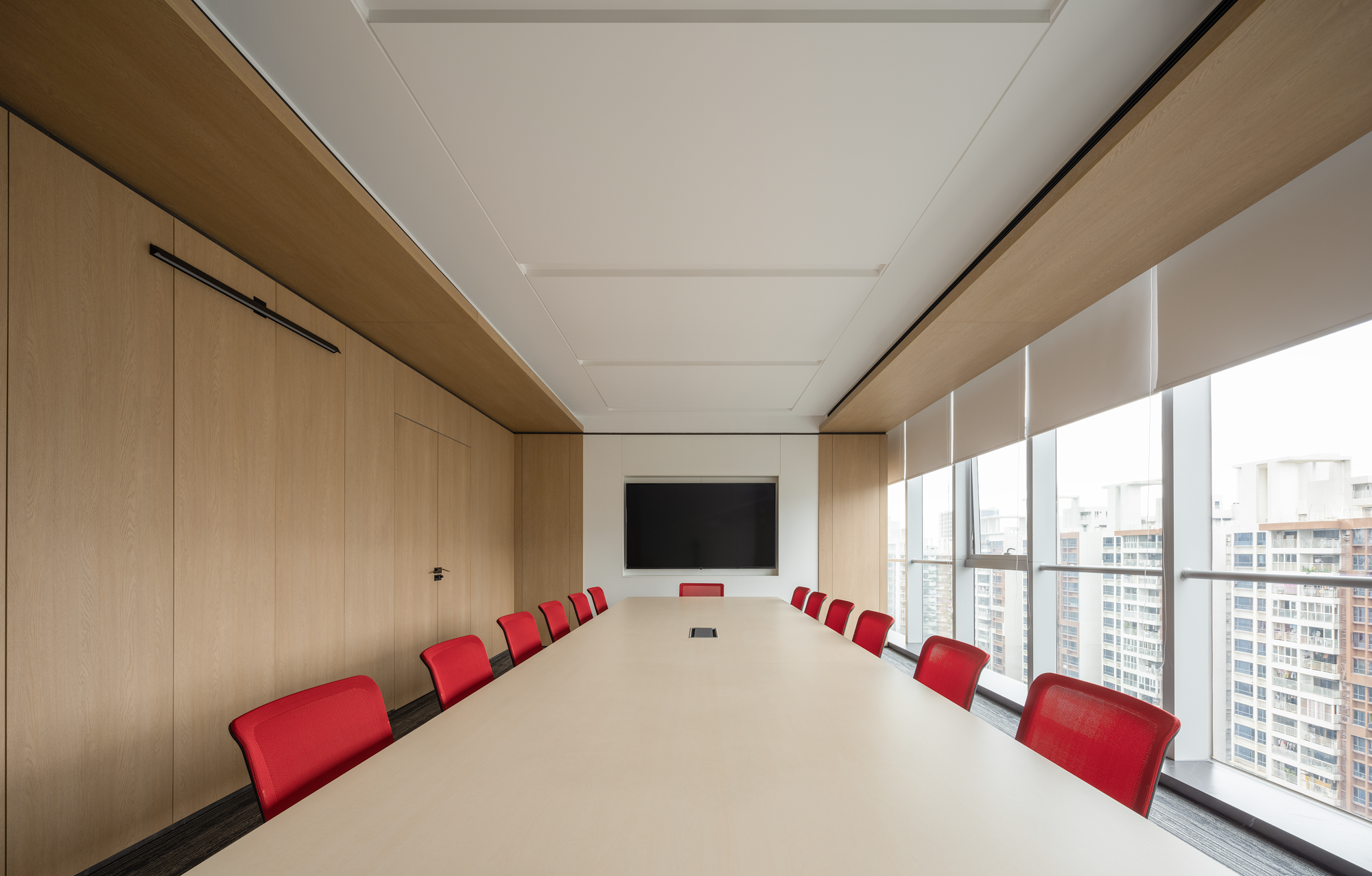 方正的小会议室,表达了一个严密、高效的办公场景。那一抹红跳跃如空间之上,与底色形成较大的对话关系,让空间更有活跃灵动性。
