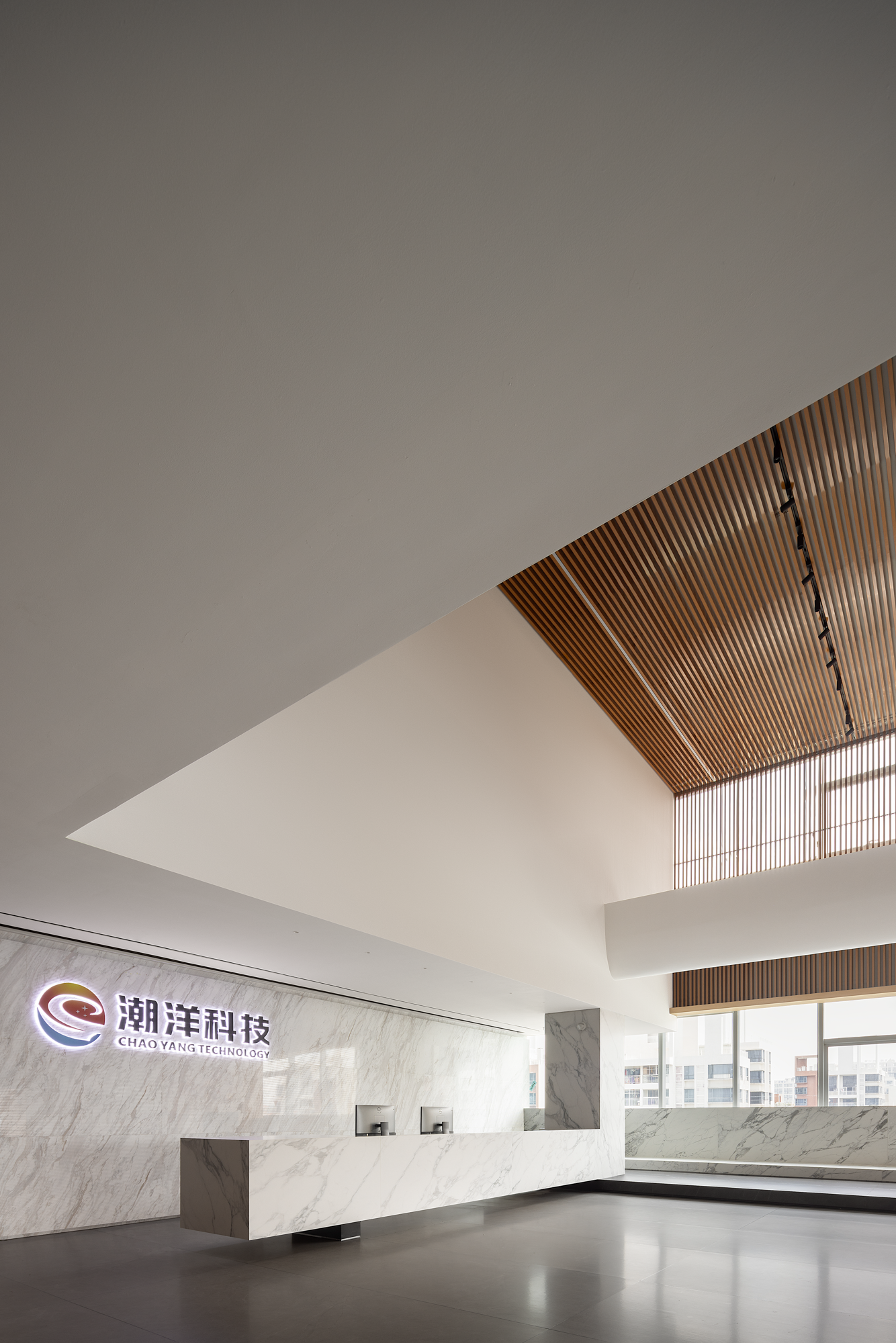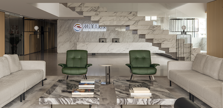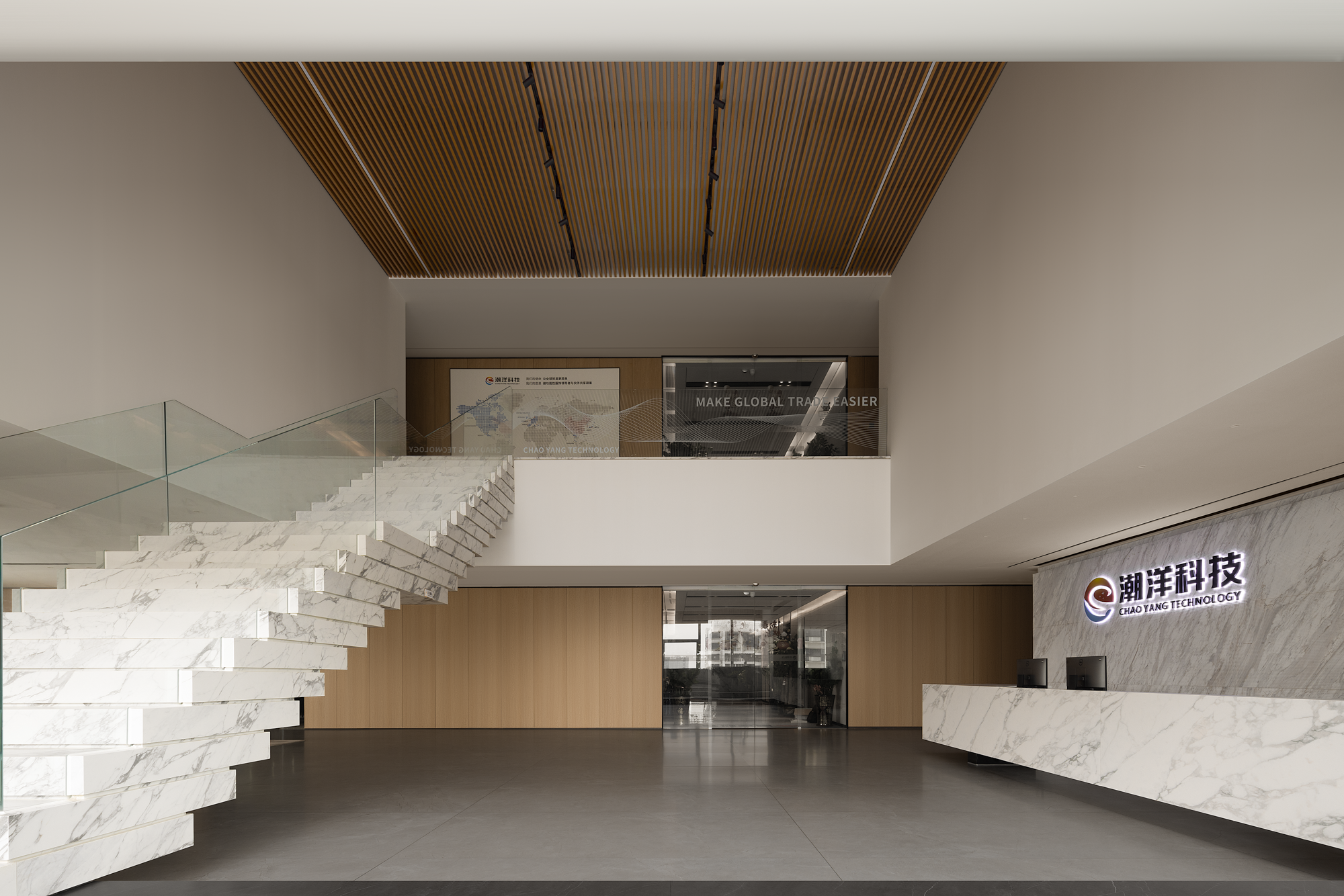 项目定位:潮洋科技主要板块业务是出海的跨境电商,结合公司性质,怎么体现作为亚马逊头部功能性服饰内衣品牌的实力和出海的特性,原本是独立两层写字楼,设计师对空间做了一个大动作的调整切部门楼板,前台和柱子的咬合如海上前行的轮船和向着巨浪光明的跌梯中空油然而生,让原有独立的两层有一个很好的使用和交付衔接,将空间的维度做了一个上下两层的递进延伸,塑造出一个松弛、开放又独立的秩序空间。
