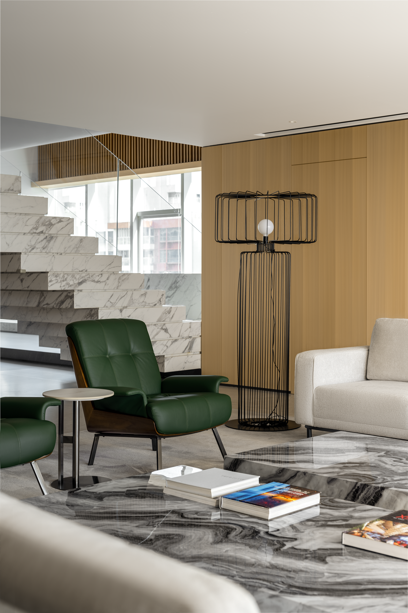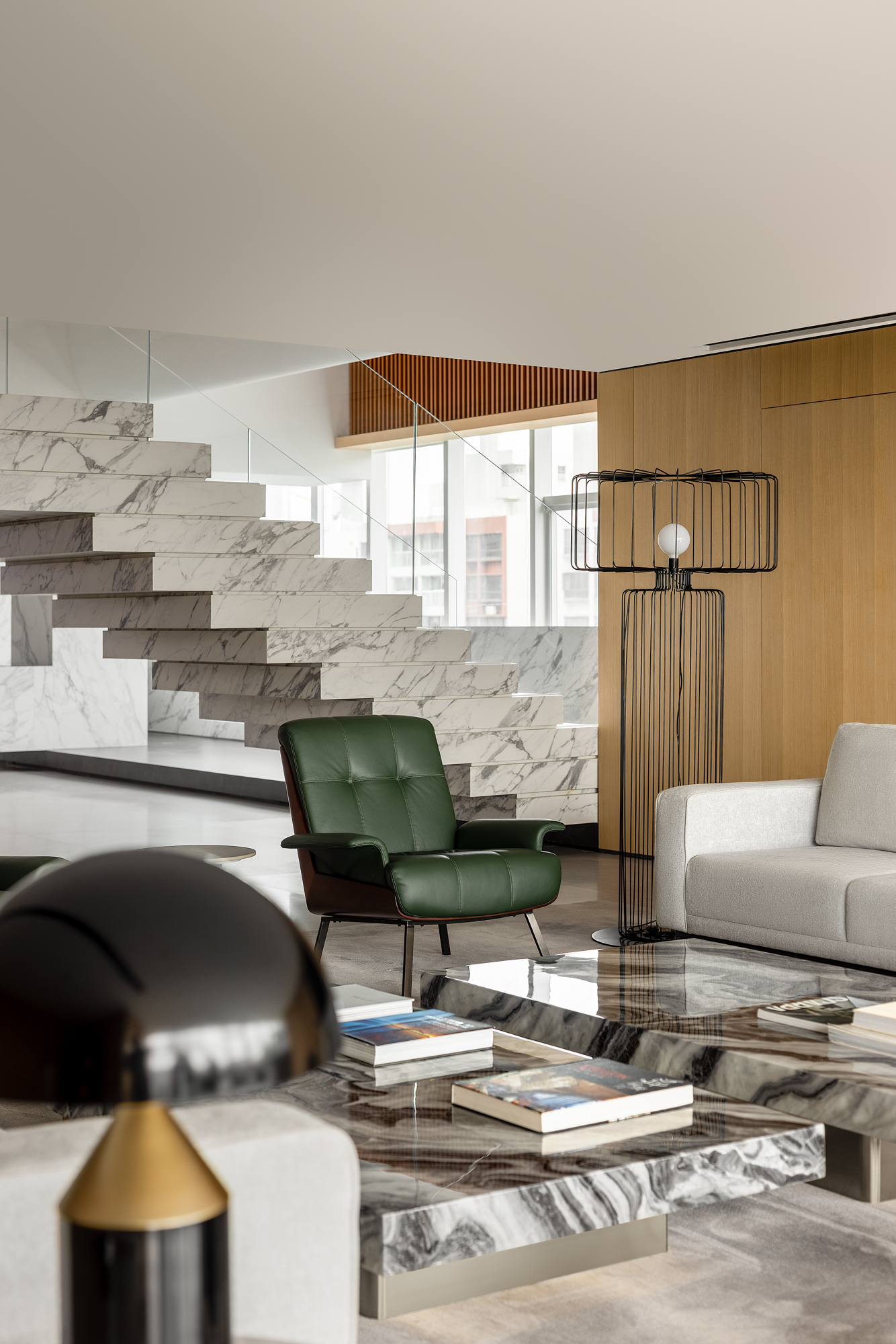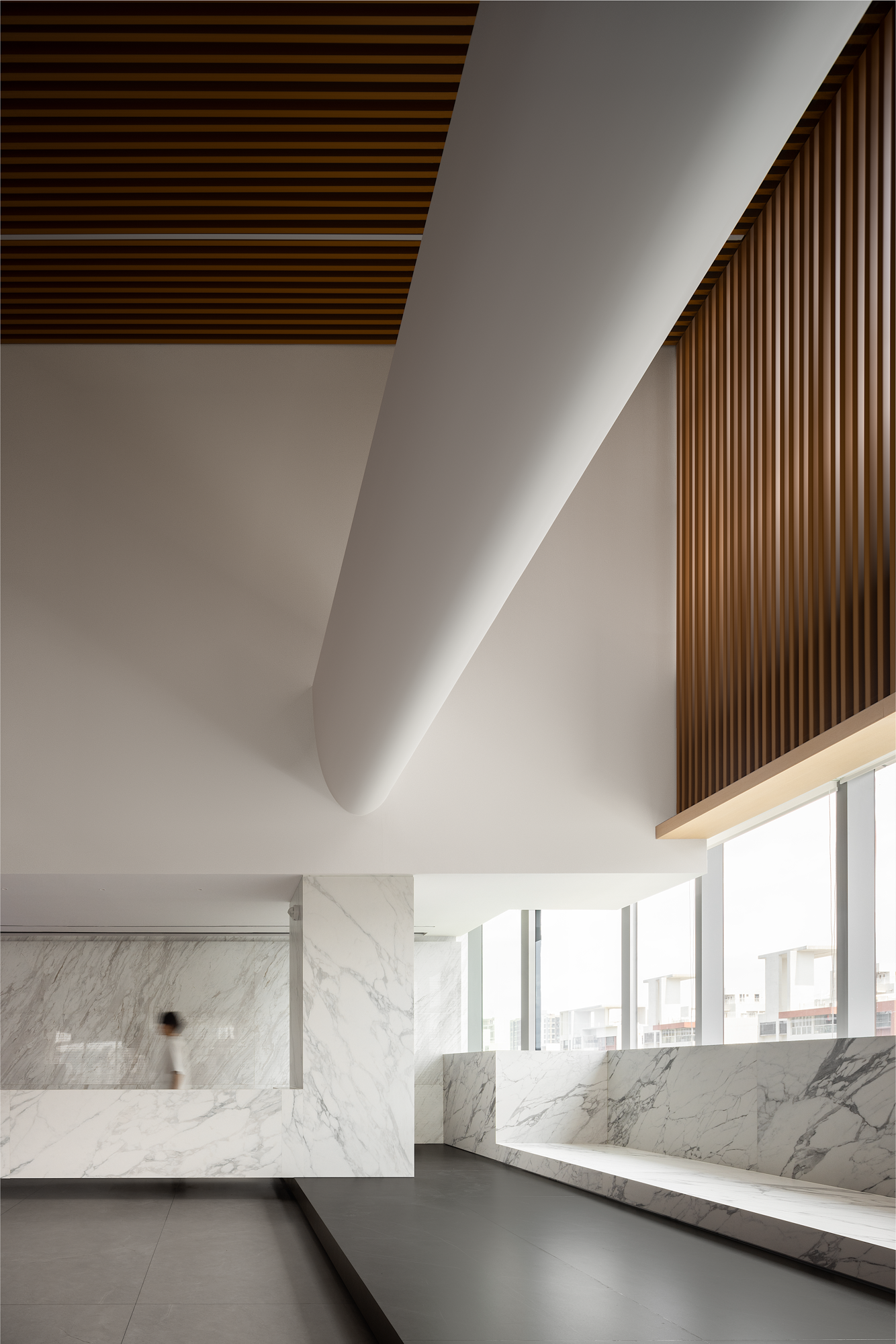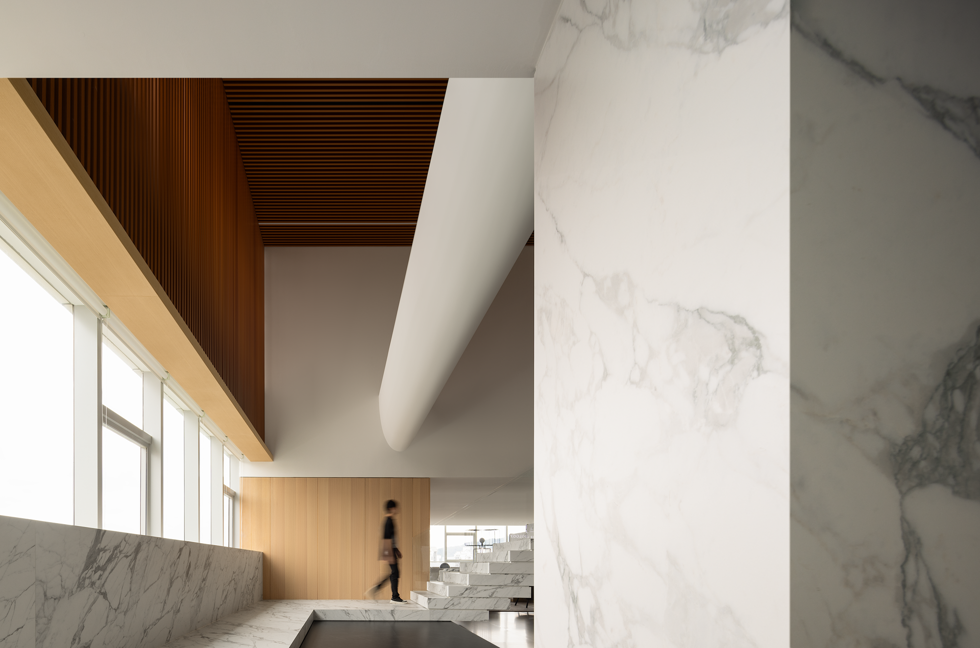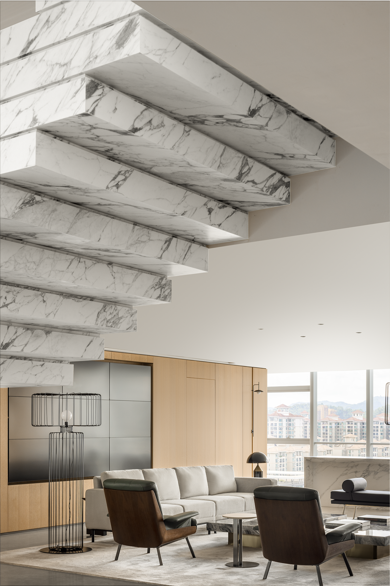 抽槽的大理石背景映衬着咬合式航海前台,天地两个“L"型形体转折,把视觉动线引导式的走向叠梯,放大上下尺度和左右延伸,让空间充满的探索性和视觉性。