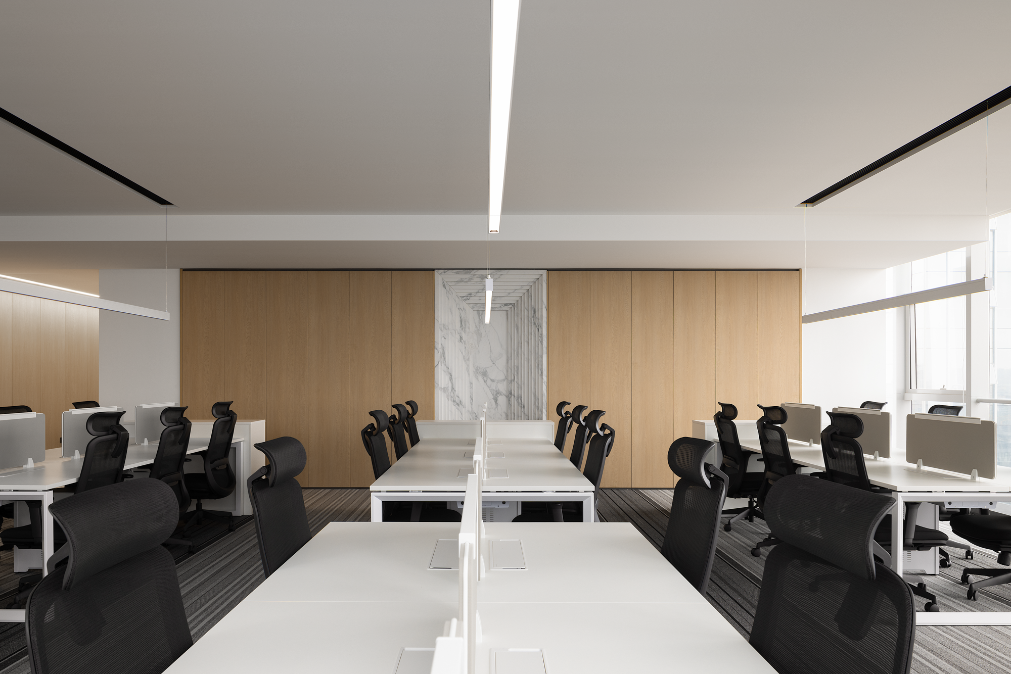 空间意境:本设计强调以“体块盒子链接”为核心,展现企业的使命、愿景和价值观。室内打破传统封闭式的功能分区规则,将整个空间划分成三个主体区域—前厅接待区、会议展示区、办公区。每个区域在保有自己特定功能属性的同时,又与其他区域产生功能场域的交互。一楼接待大厅同时拥有空间的体块感与建筑结构感,从空间整体出发,设计强调几何体块的相互咬合与精致的选材,以释放空间上下尺度和左右张力,催生“L”型转折线条、体块和光影之间的巧妙结合,两个L形体塑造出横向“光明窗口”的视觉指引,引导并梳理着行人轨迹。在某种意义上,我们希望从生活里提取一种公共情感、秩序和理性,它不是所谓的“压榨式的办公环境”,它应该有情感、有思想、有停留、有娱乐、有休闲,进入空间时就传递给每一个人,把最好远山景色的留给自己。
