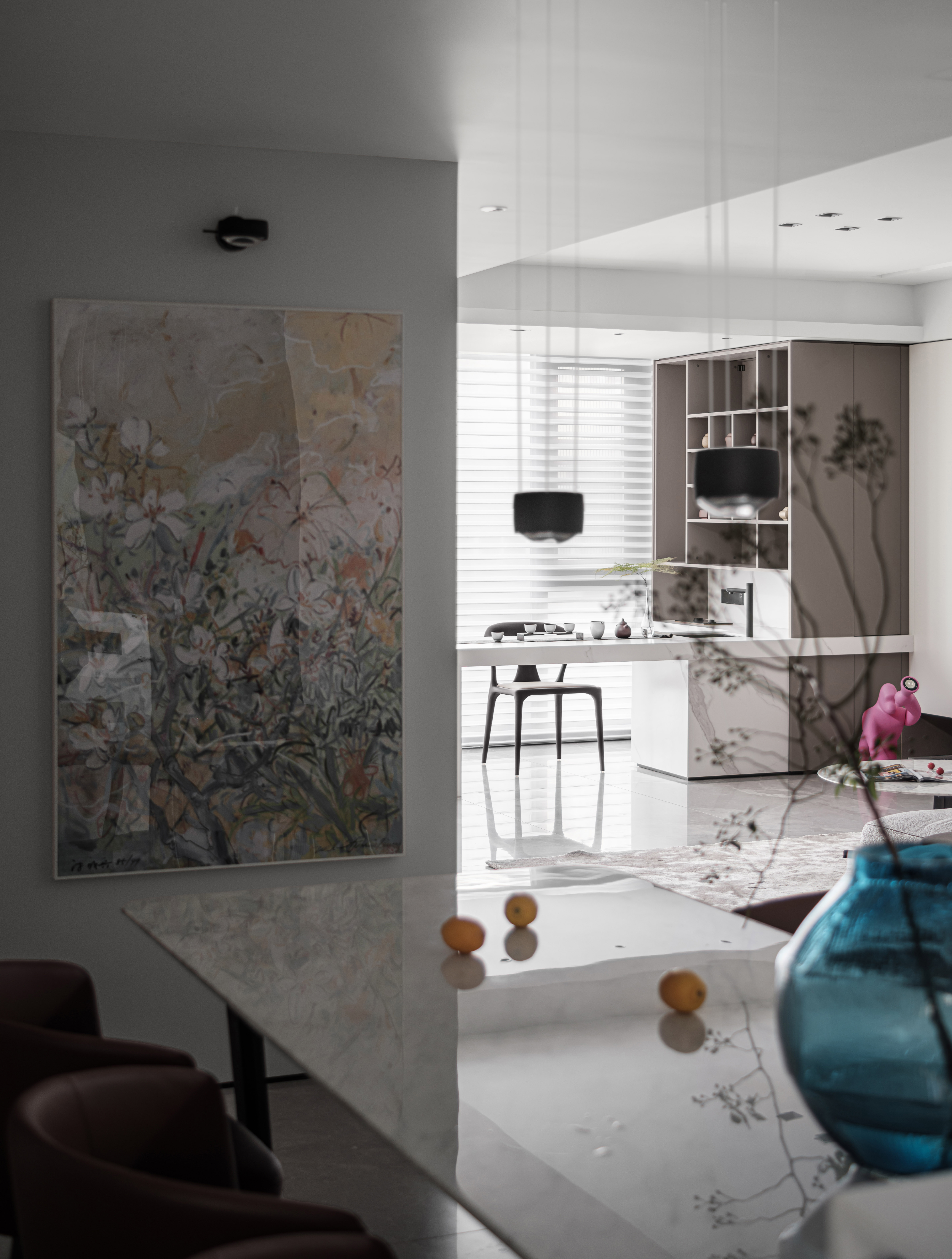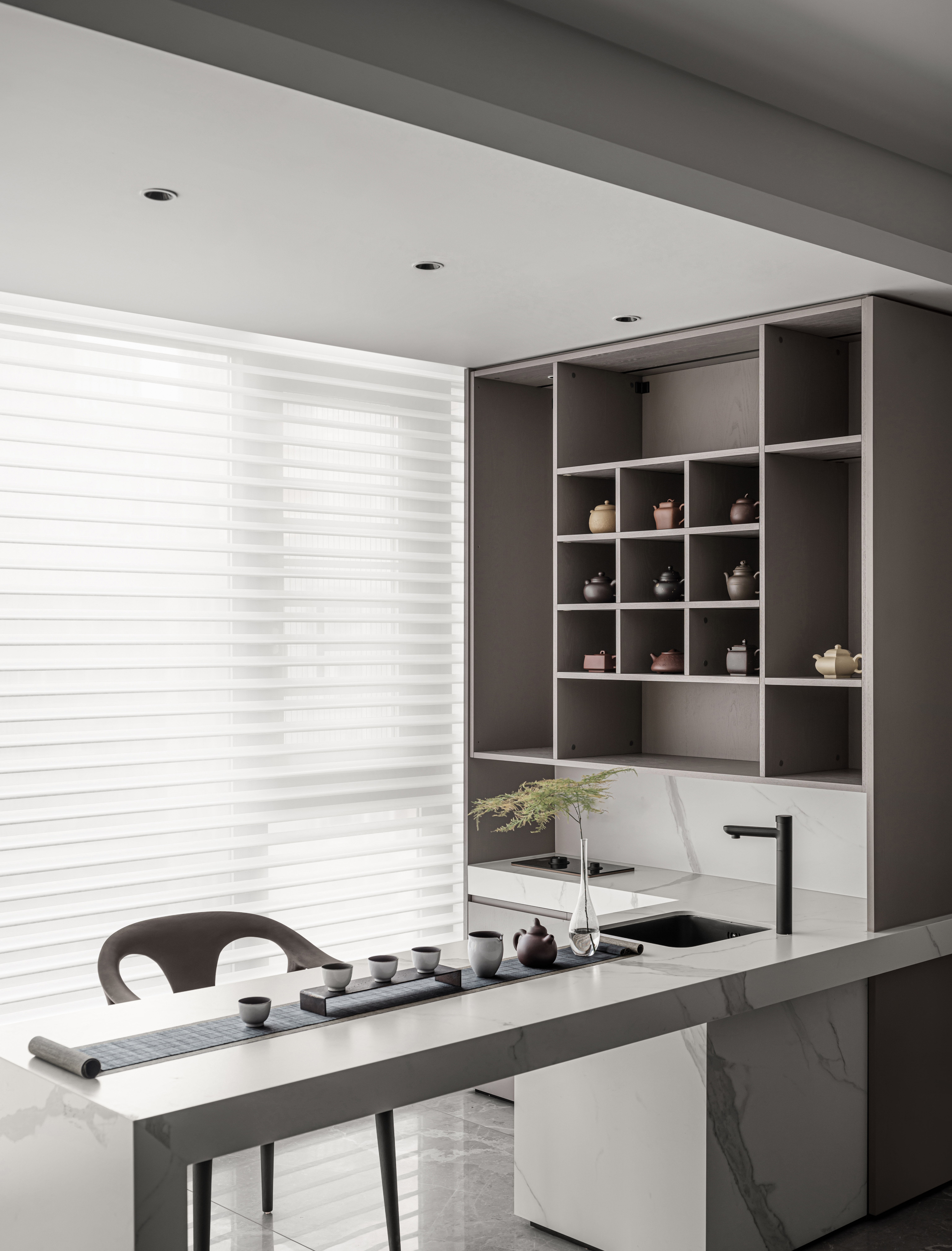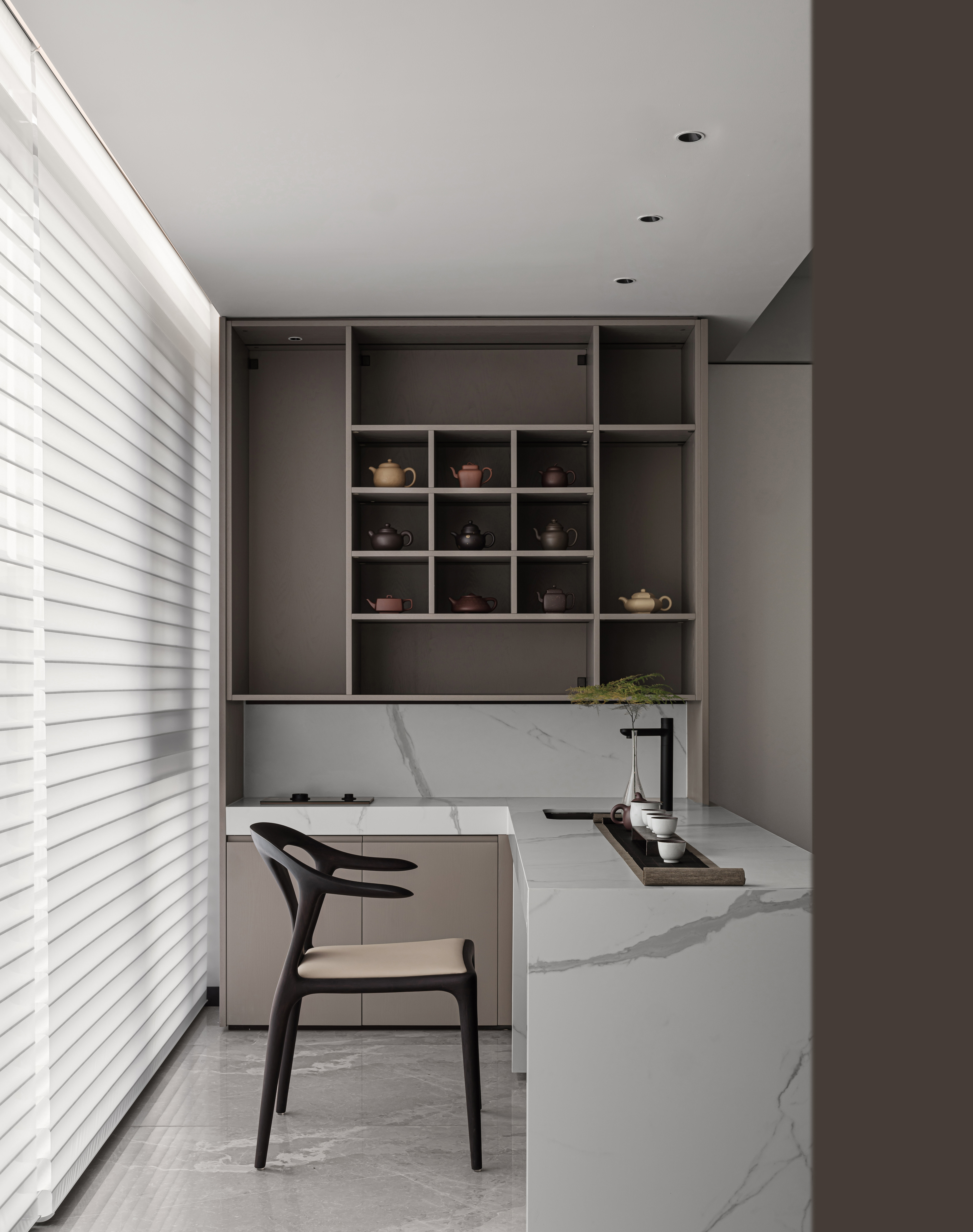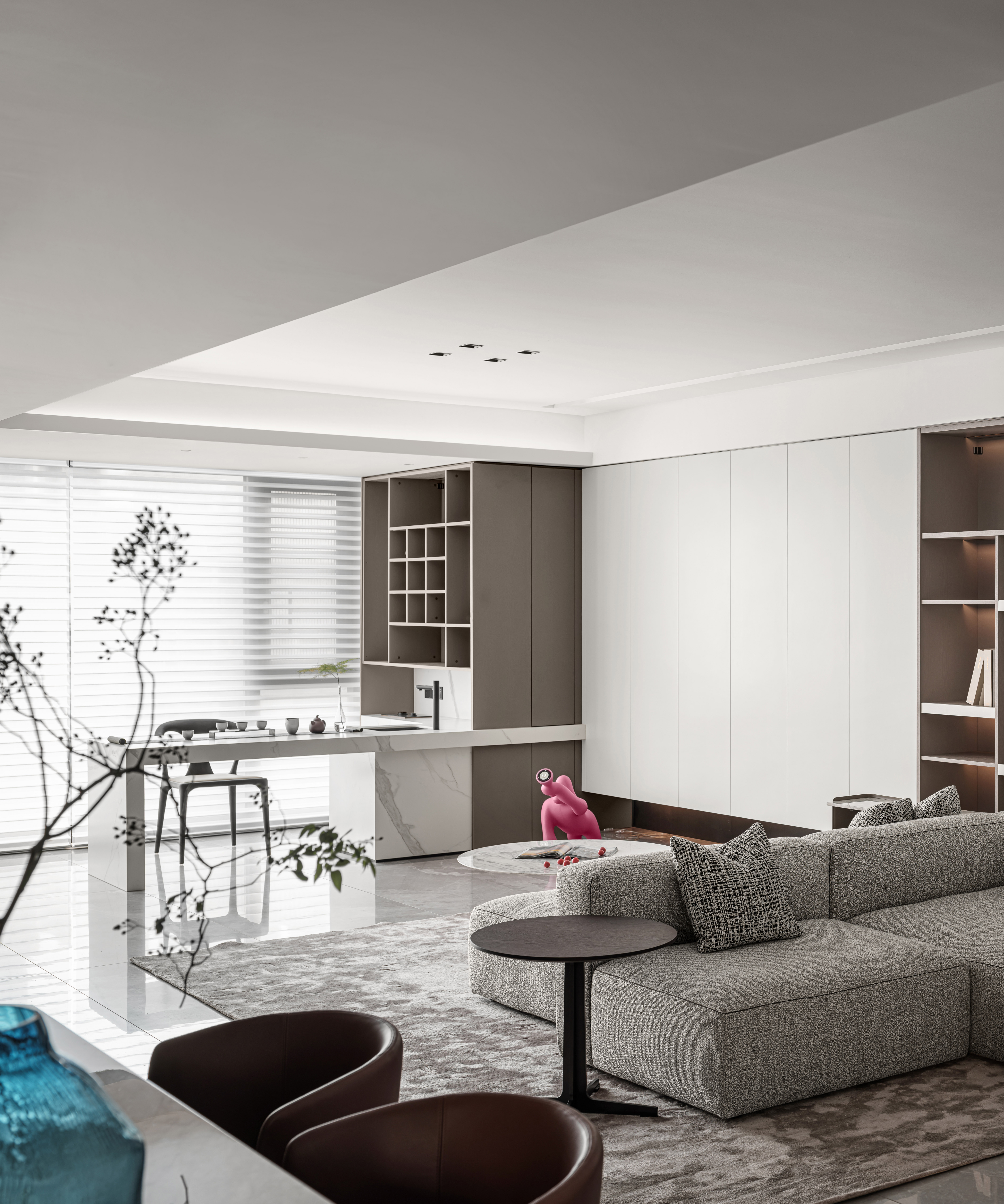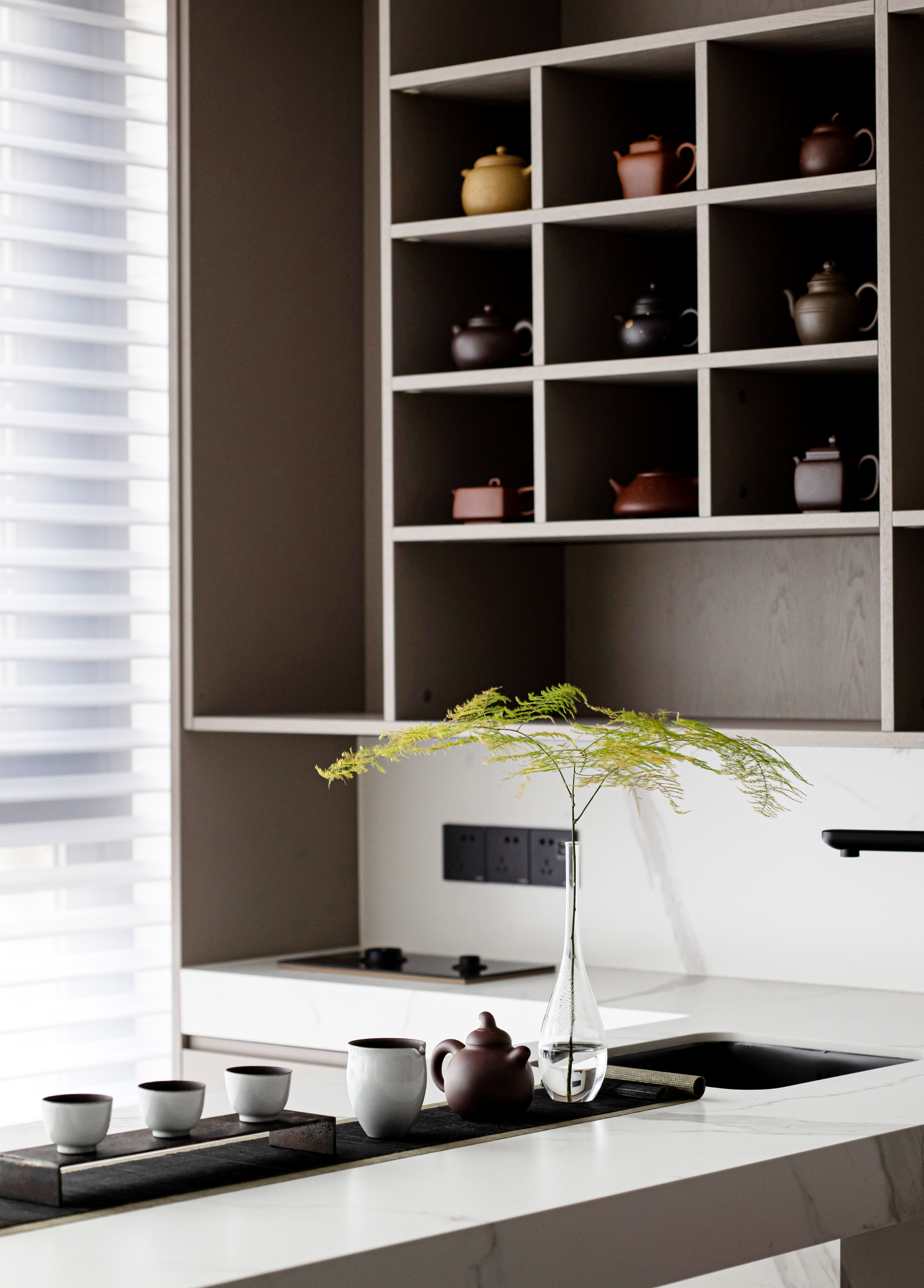 开门见山,设计师舍弃原本“豆腐块”厨房格局,随之而来的课题是敞开式的厨房与餐厅的互动关系,把传统玄关概念弱化,设计师着重考虑家庭成员多方位沟通交流的表达,环绕式动线释放了厨房封闭空间的压力,又解决了无光的餐厅形式。同时过道空间纳入厨餐区域,墙面L型吊柜的转折,将人视线带到开放的空间。客厅、品茶区和学习区构成一个完整的区域,既形成功能区域上的划分,同时构成一种空间的连续感,有效地将整个公共空间囊括进一个更大的尺度范围内。