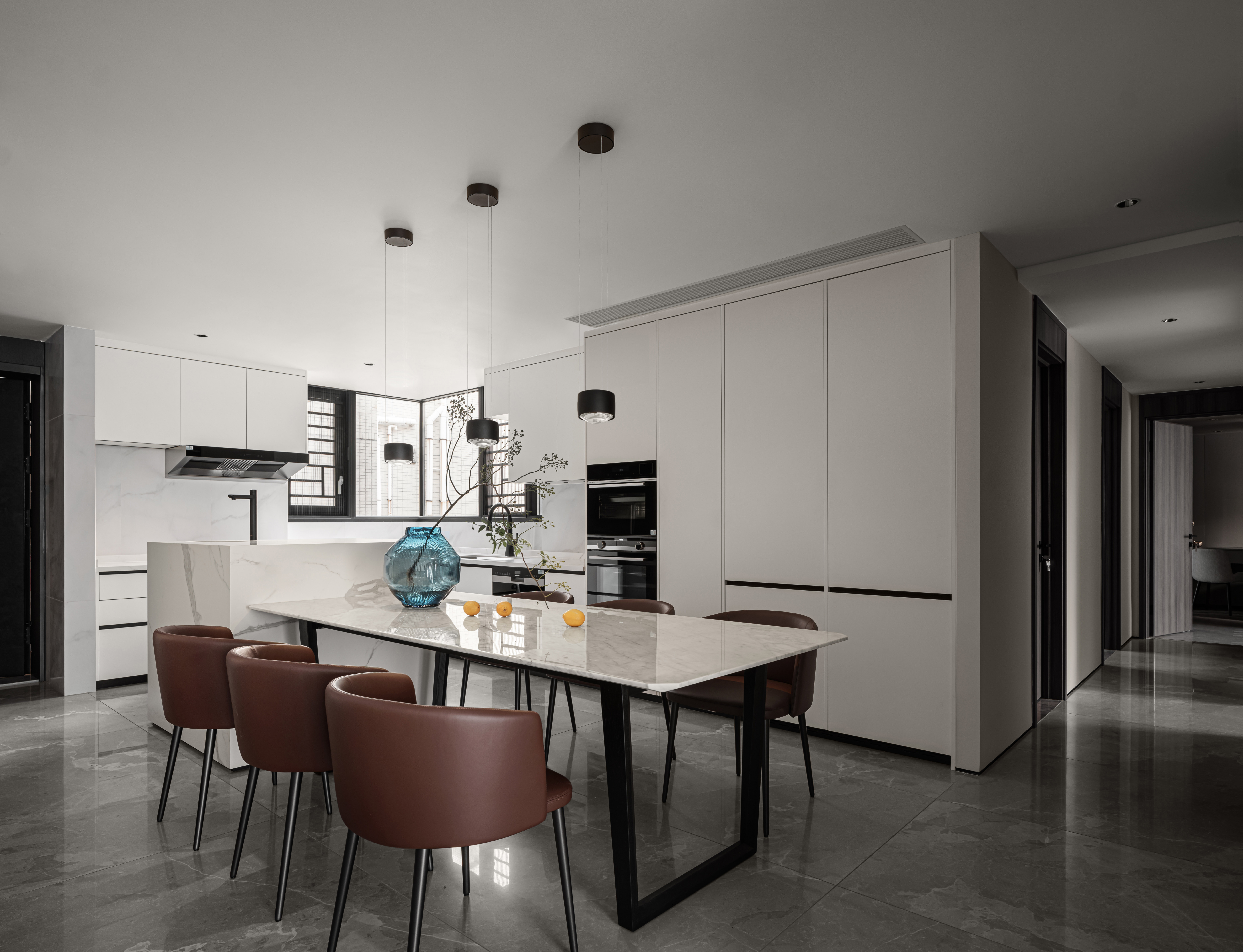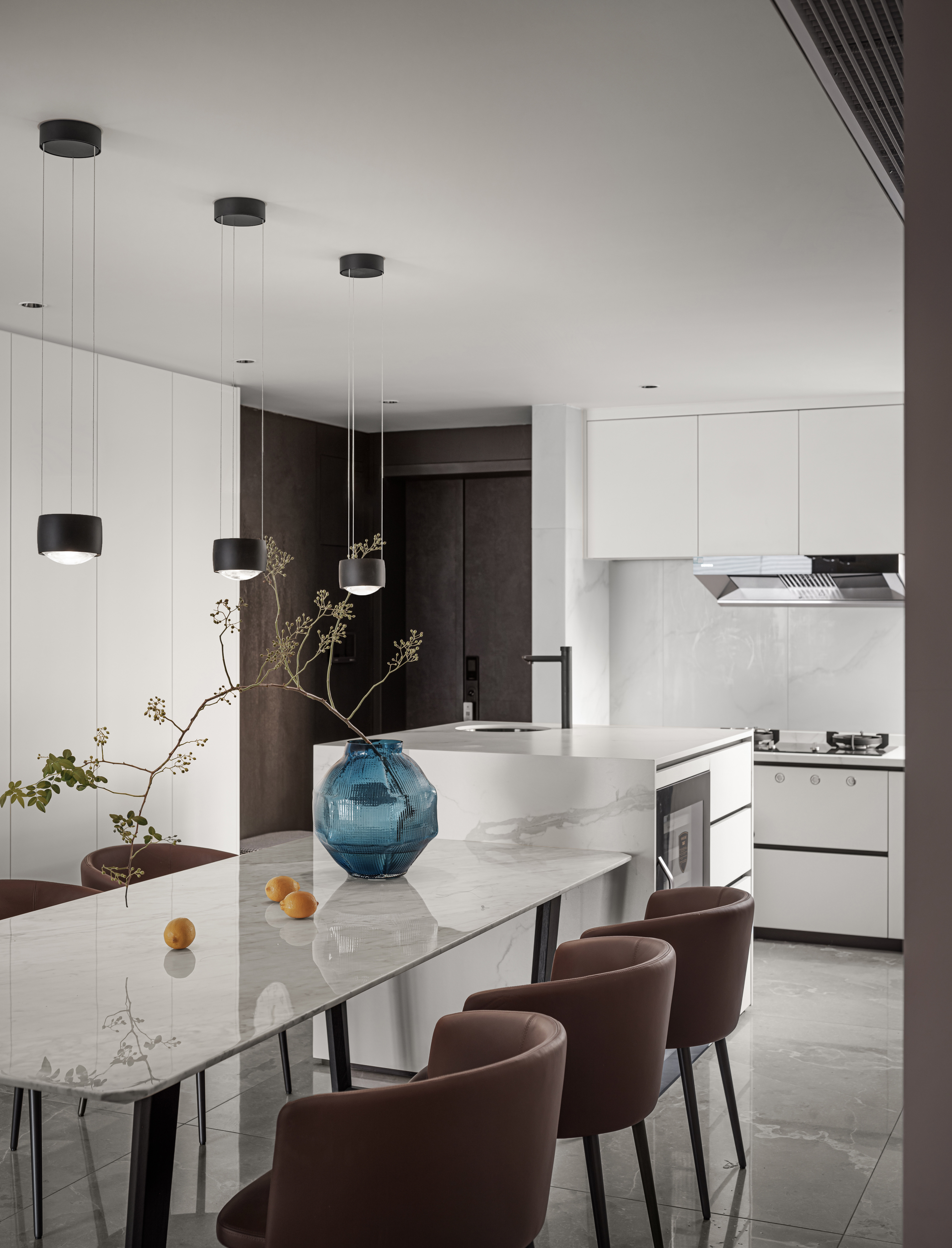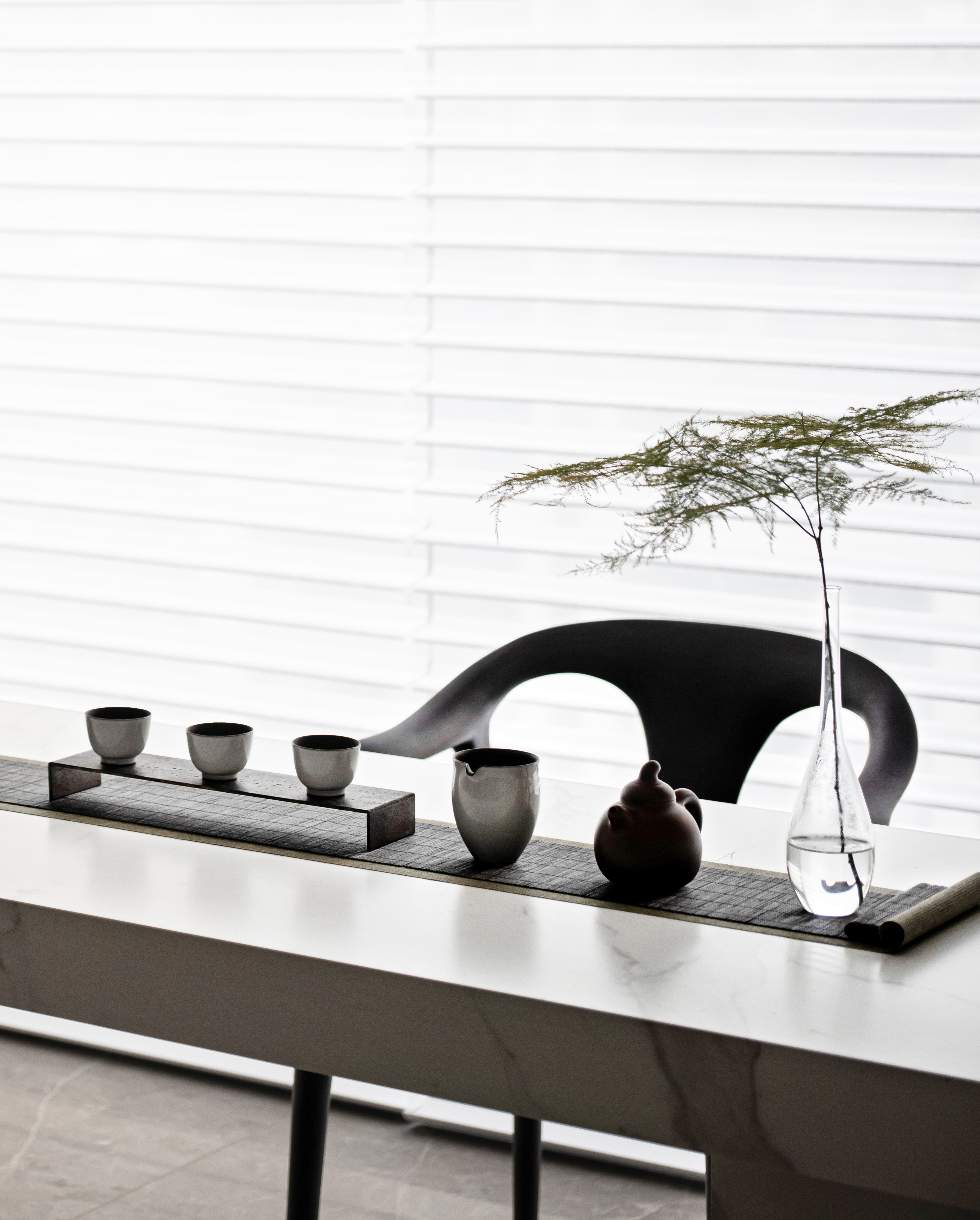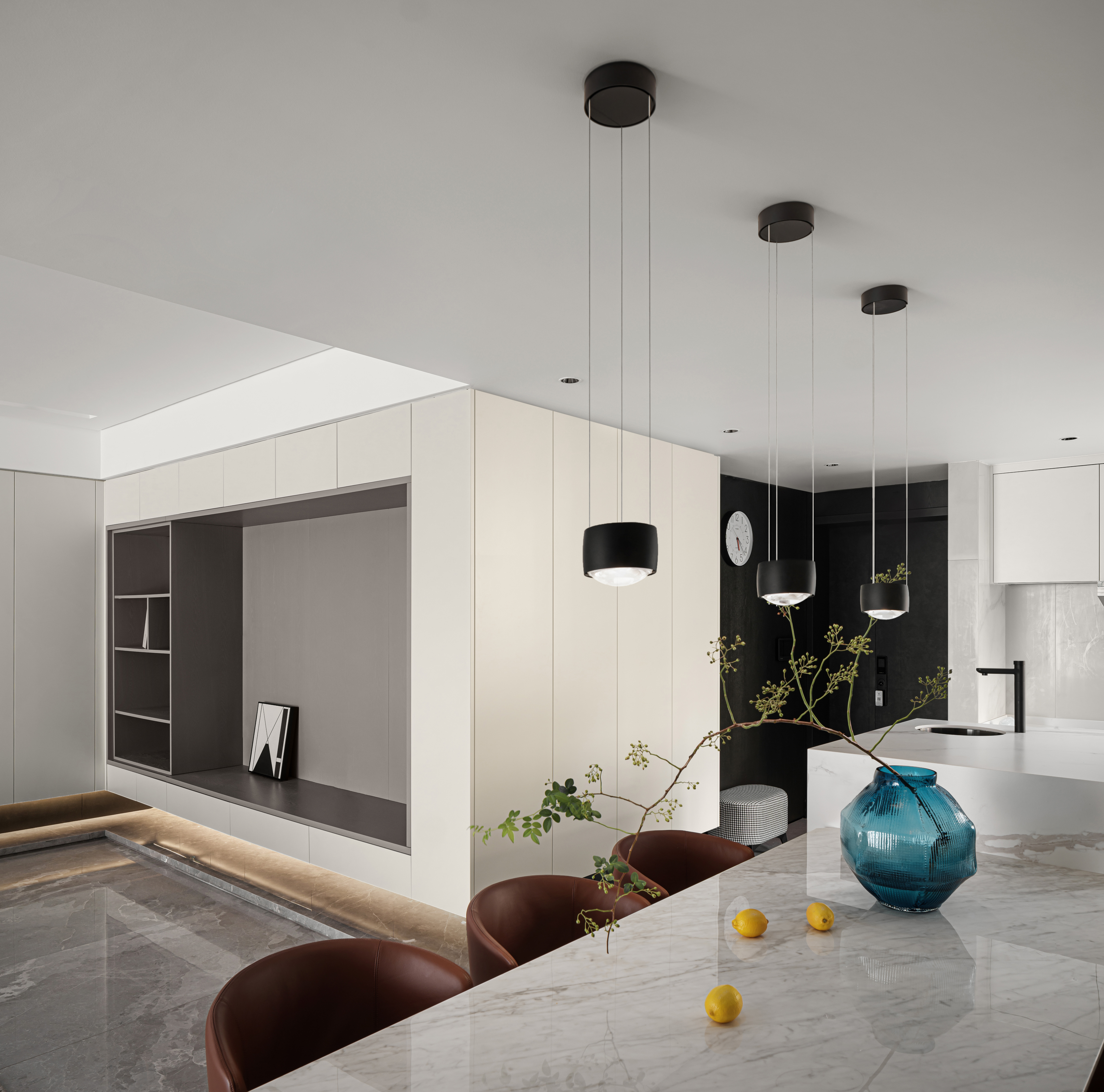 开门见山,设计师舍弃原本“豆腐块”厨房格局,随之而来的课题是敞开式的厨房与餐厅的互动关系,把传统玄关概念弱化,设计师着重考虑家庭成员多方位沟通交流的表达,环绕式动线释放了厨房封闭空间的压力,又解决了无光的餐厅形式。同时过道空间纳入厨餐区域,墙面L型吊柜的转折,将人视线带到开放的空间。客厅、品茶区和学习区构成一个完整的区域,既形成功能区域上的划分,同时构成一种空间的连续感,有效地将整个公共空间囊括进一个更大的尺度范围内。