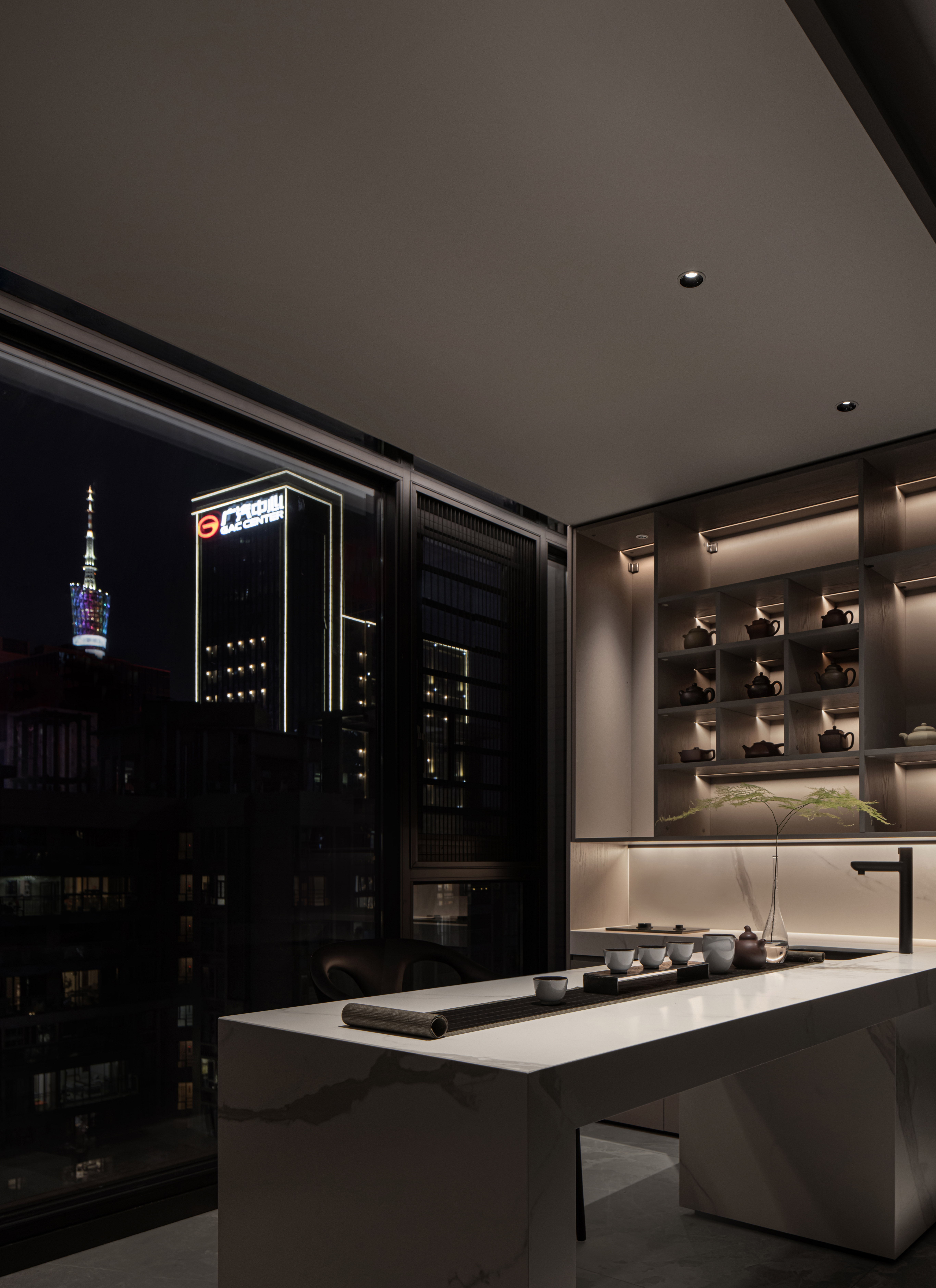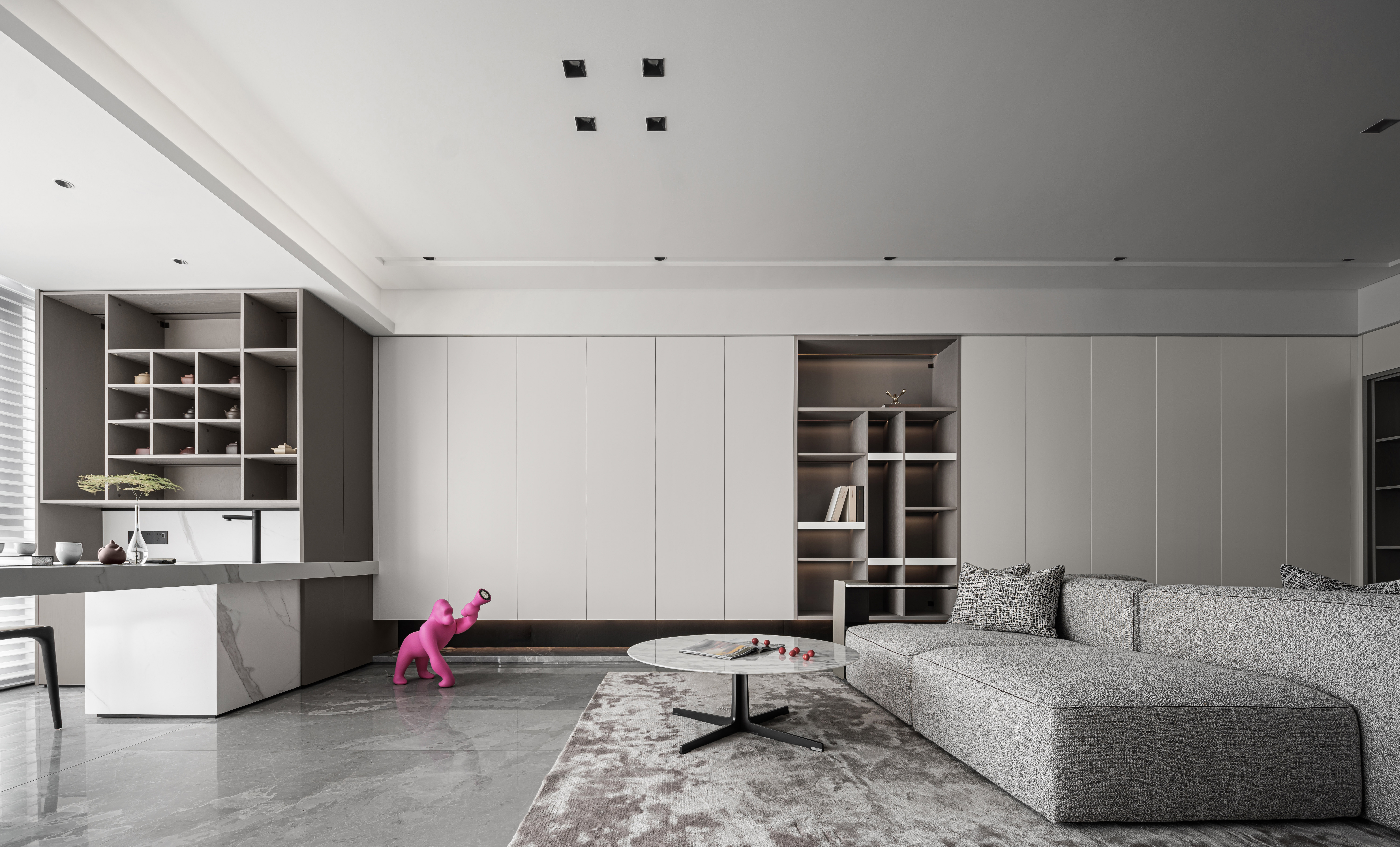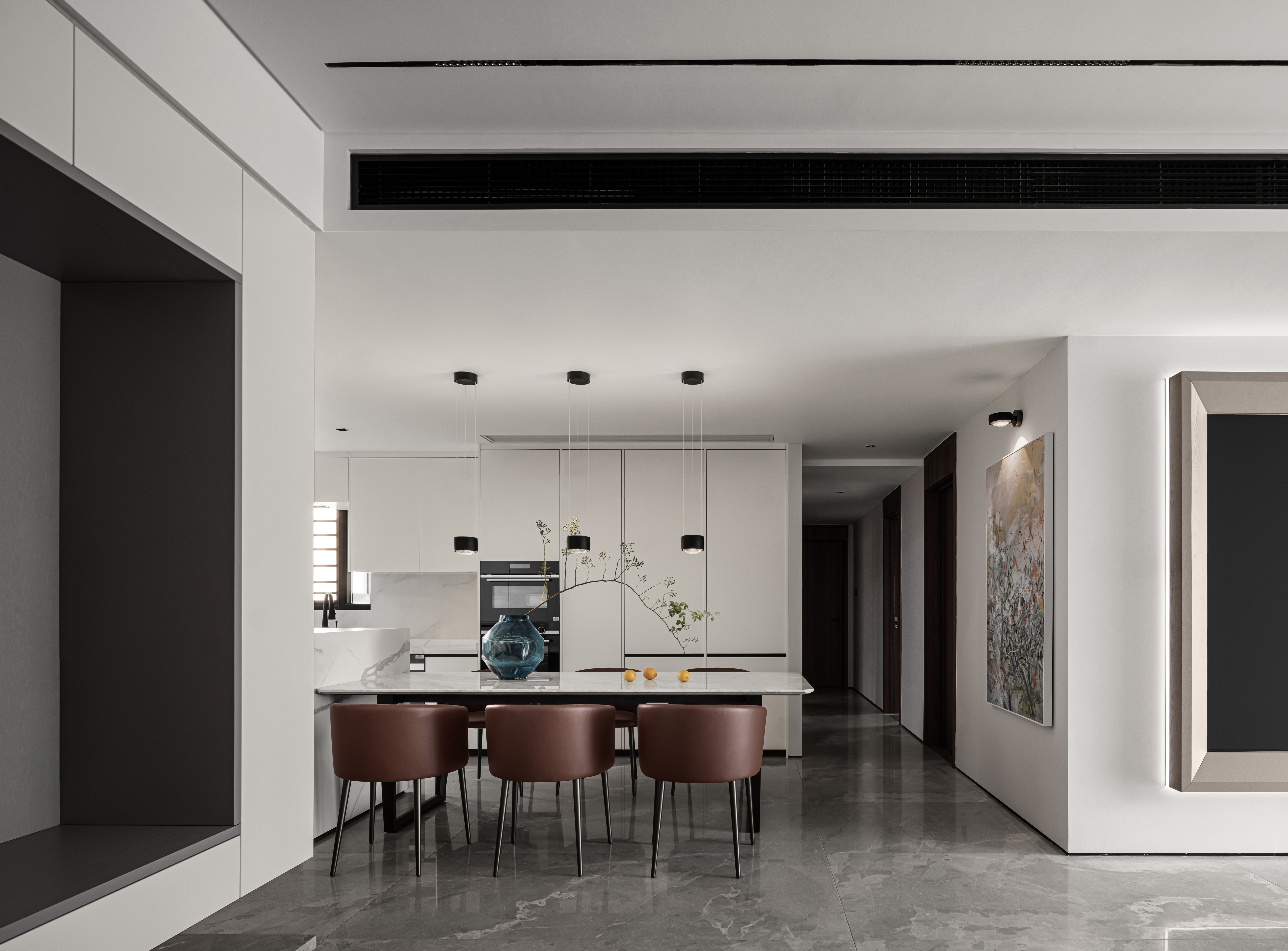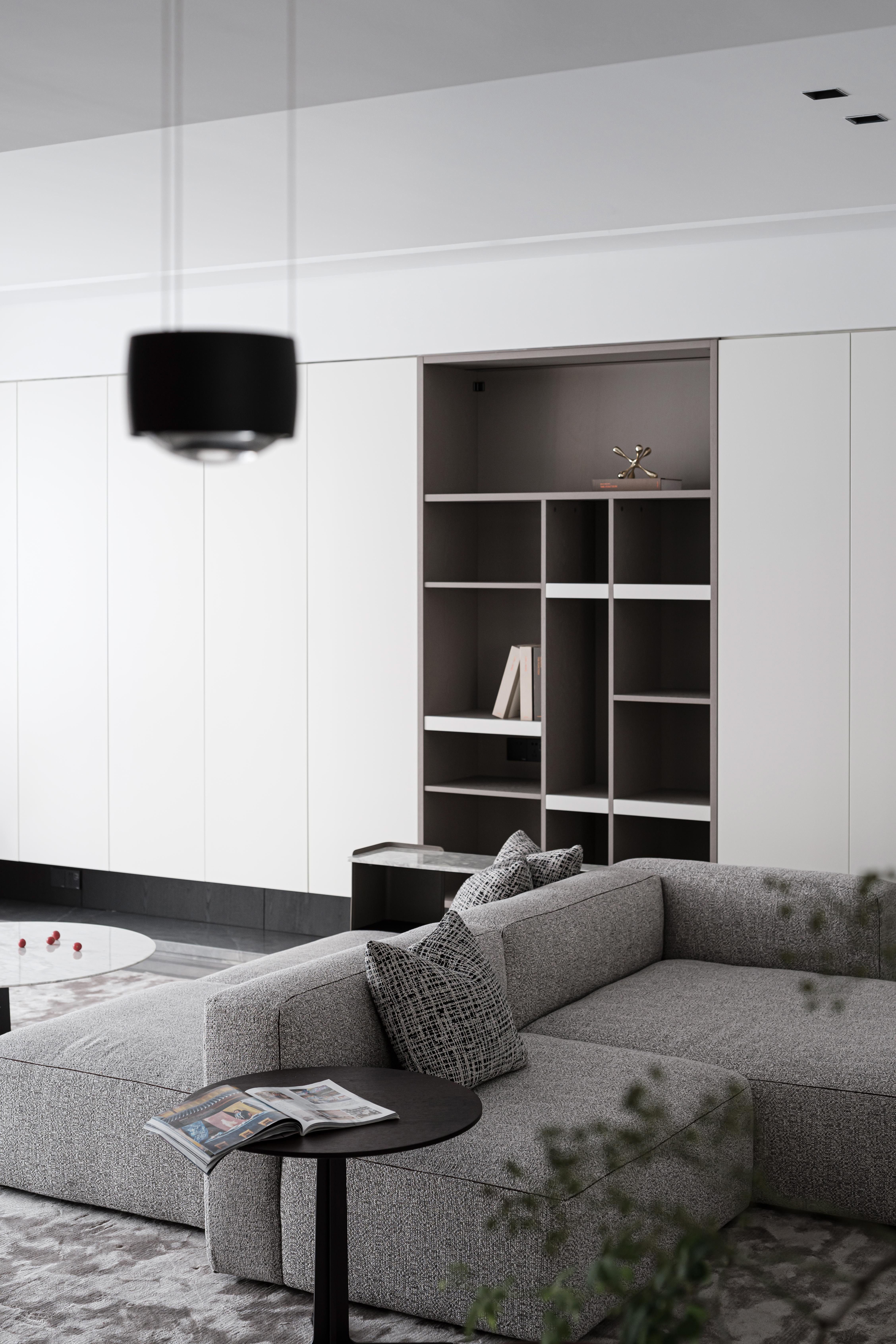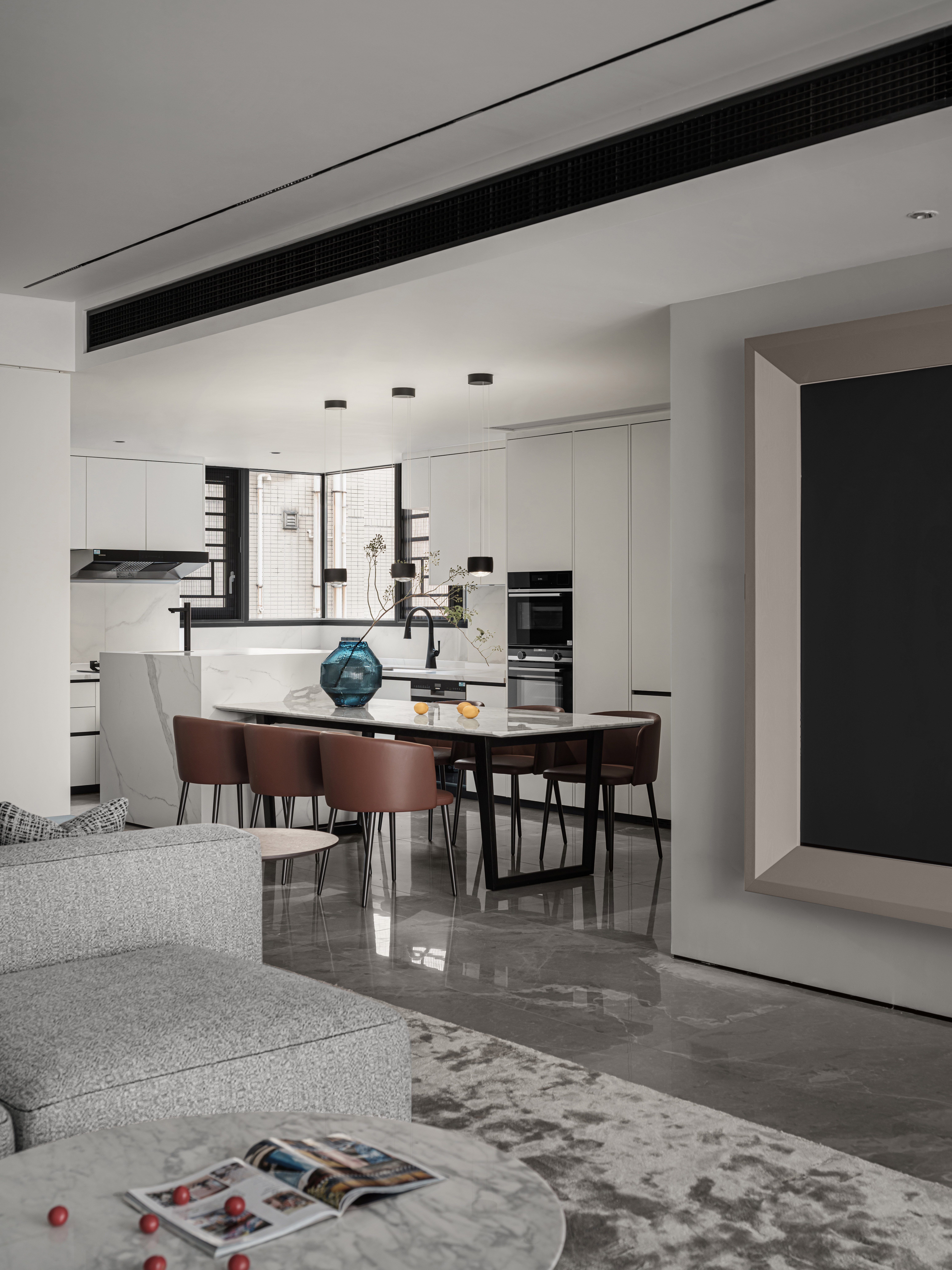 开门见山,设计师舍弃原本“豆腐块”厨房格局,随之而来的课题是敞开式的厨房与餐厅的互动关系,把传统玄关概念弱化,设计师着重考虑家庭成员多方位沟通交流的表达,环绕式动线释放了厨房封闭空间的压力,又解决了无光的餐厅形式。同时过道空间纳入厨餐区域,墙面L型吊柜的转折,将人视线带到开放的空间。客厅、品茶区和学习区构成一个完整的区域,既形成功能区域上的划分,同时构成一种空间的连续感,有效地将整个公共空间囊括进一个更大的尺度范围内。