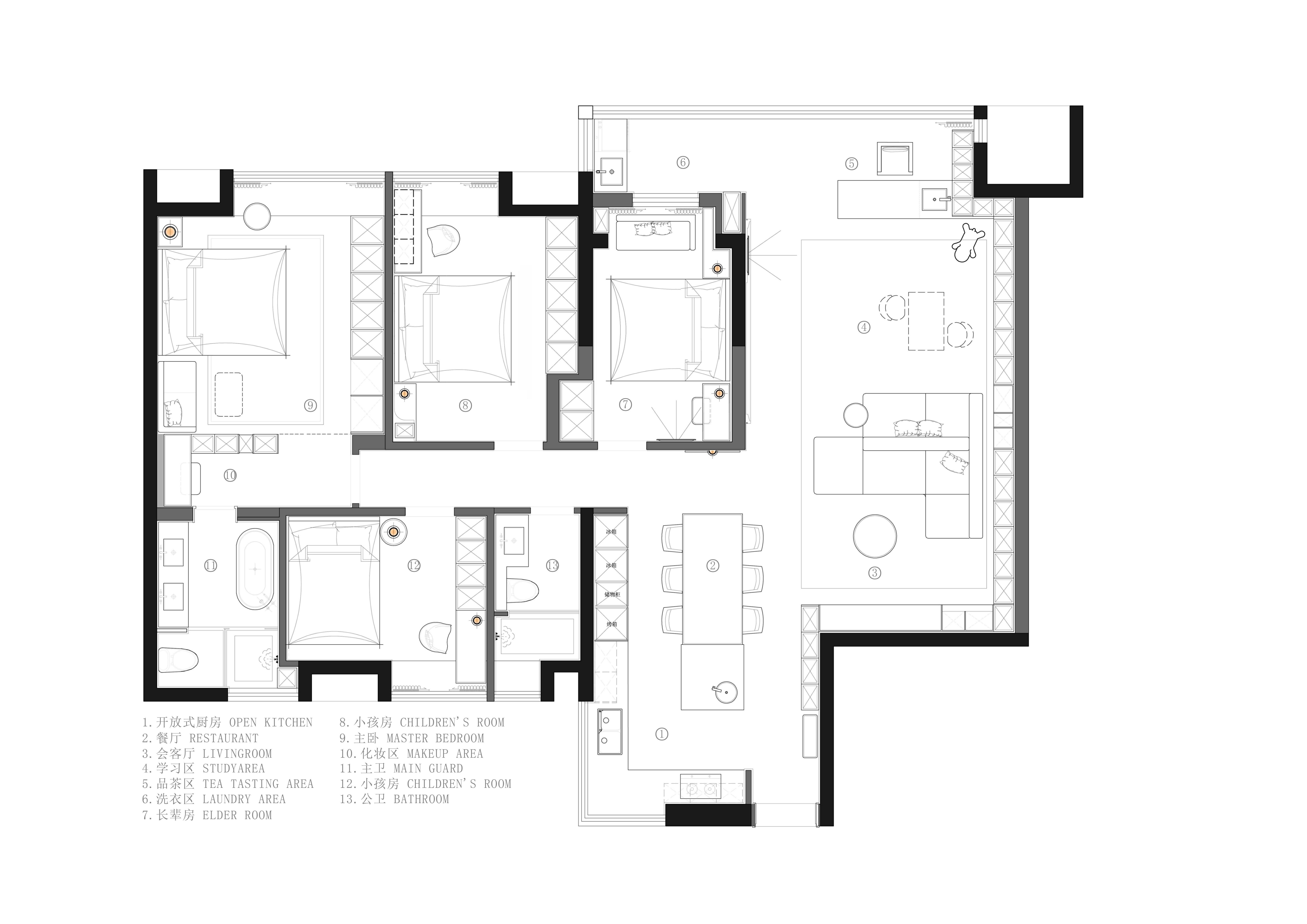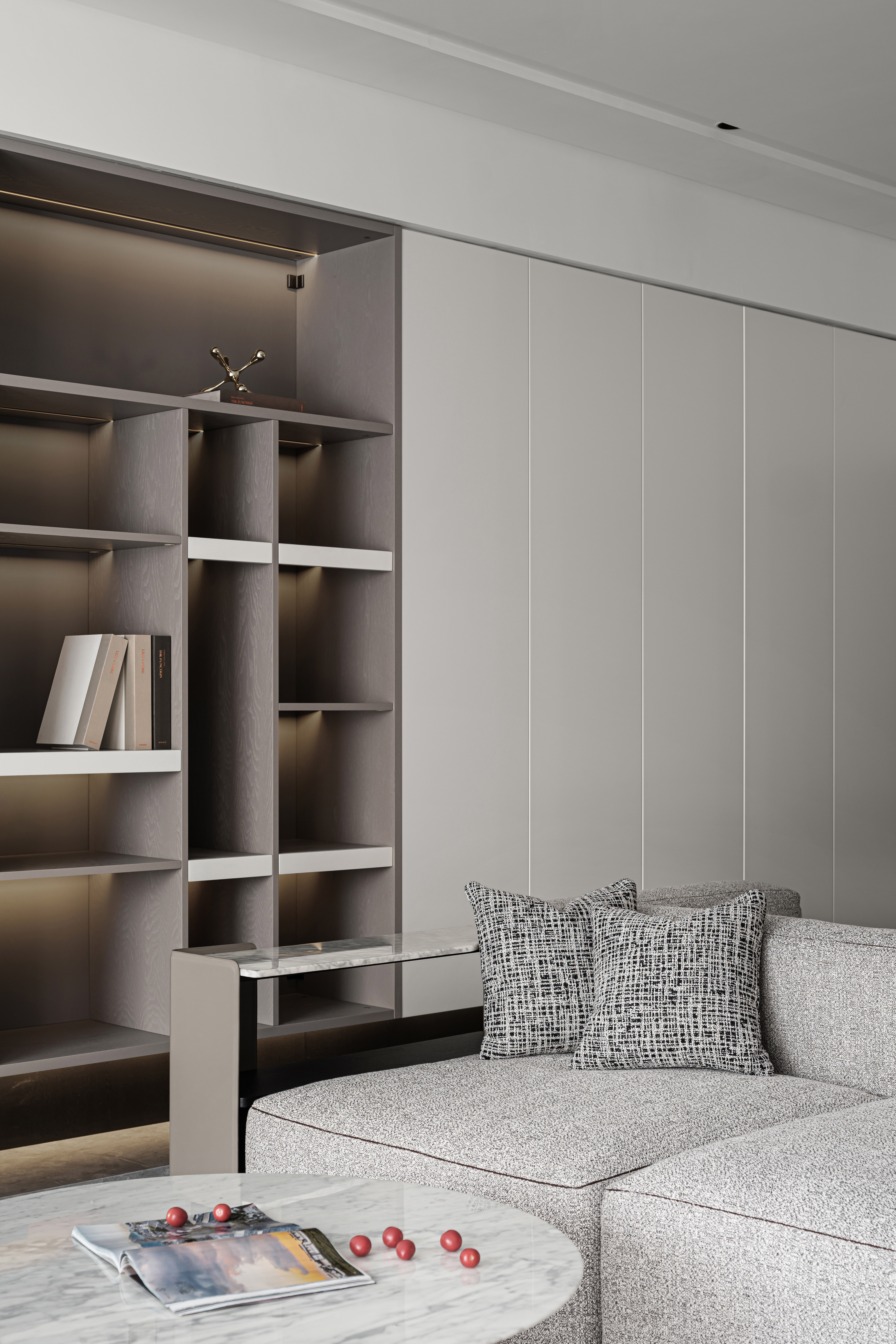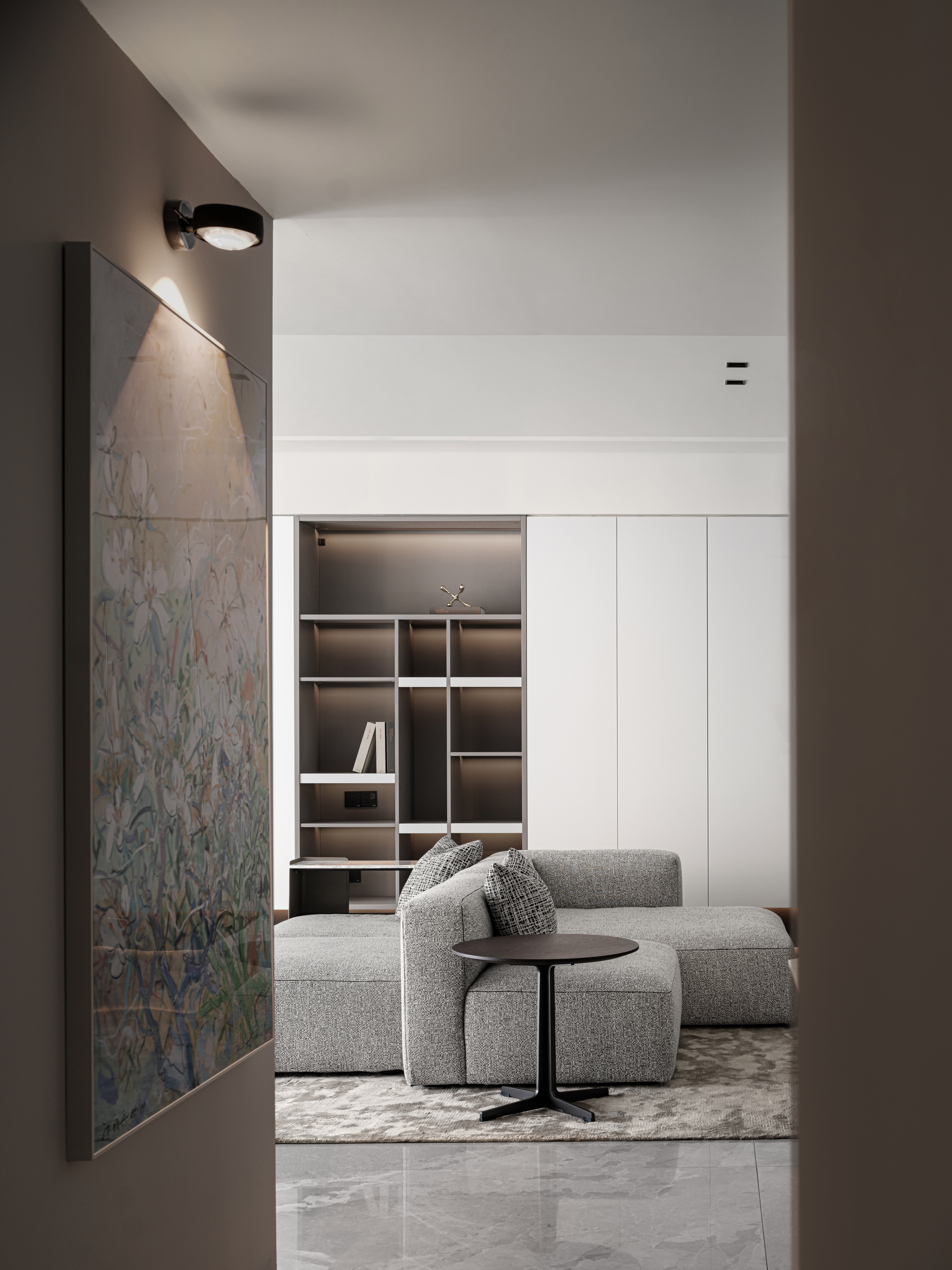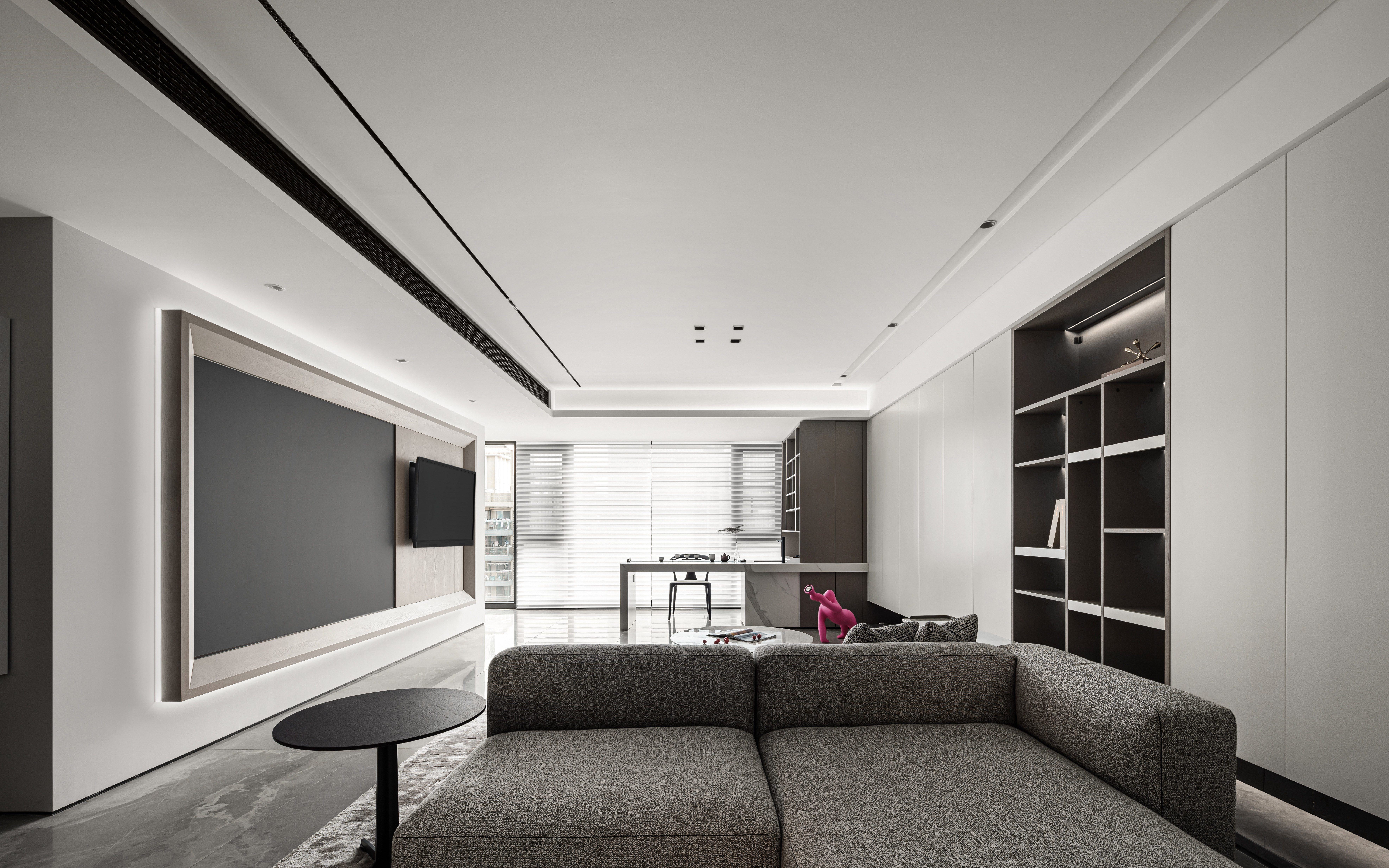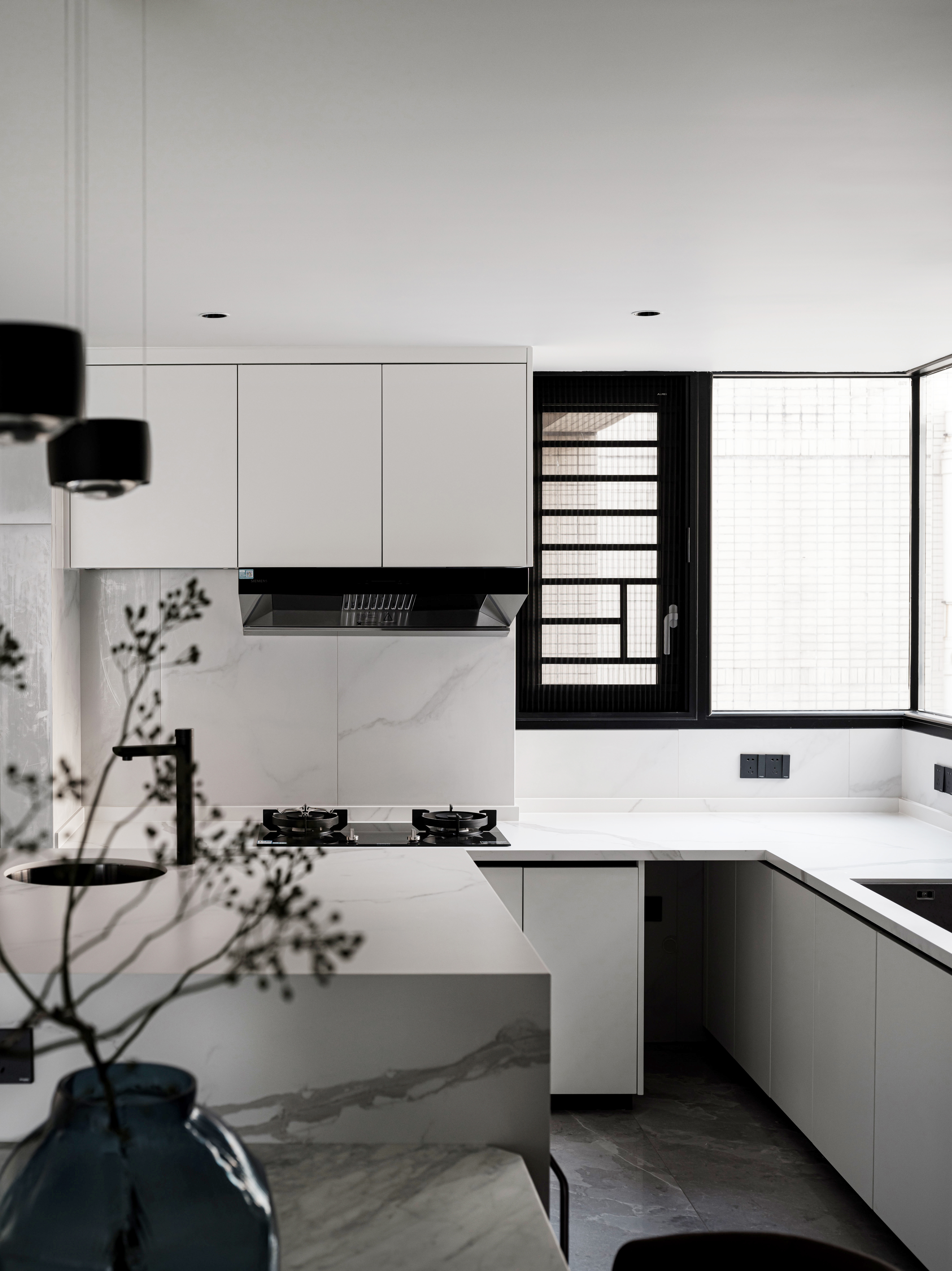 开门见山,设计师舍弃原本“豆腐块”厨房格局,随之而来的课题是敞开式的厨房与餐厅的互动关系,把传统玄关概念弱化,设计师着重考虑家庭成员多方位沟通交流的表达,环绕式动线释放了厨房封闭空间的压力,又解决了无光的餐厅形式。同时过道空间纳入厨餐区域,墙面L型吊柜的转折,将人视线带到开放的空间。客厅、品茶区和学习区构成一个完整的区域,既形成功能区域上的划分,同时构成一种空间的连续感,有效地将整个公共空间囊括进一个更大的尺度范围内。