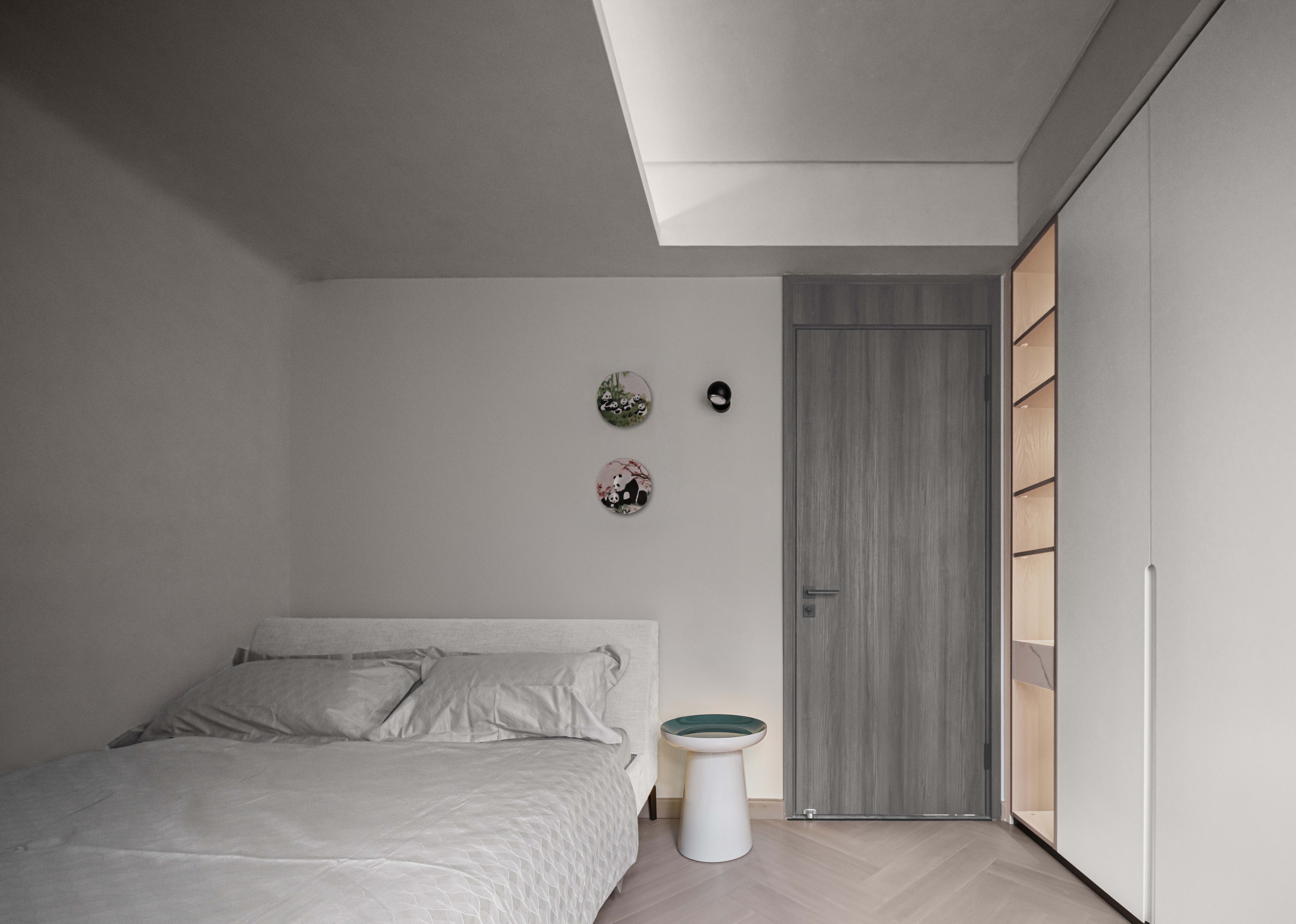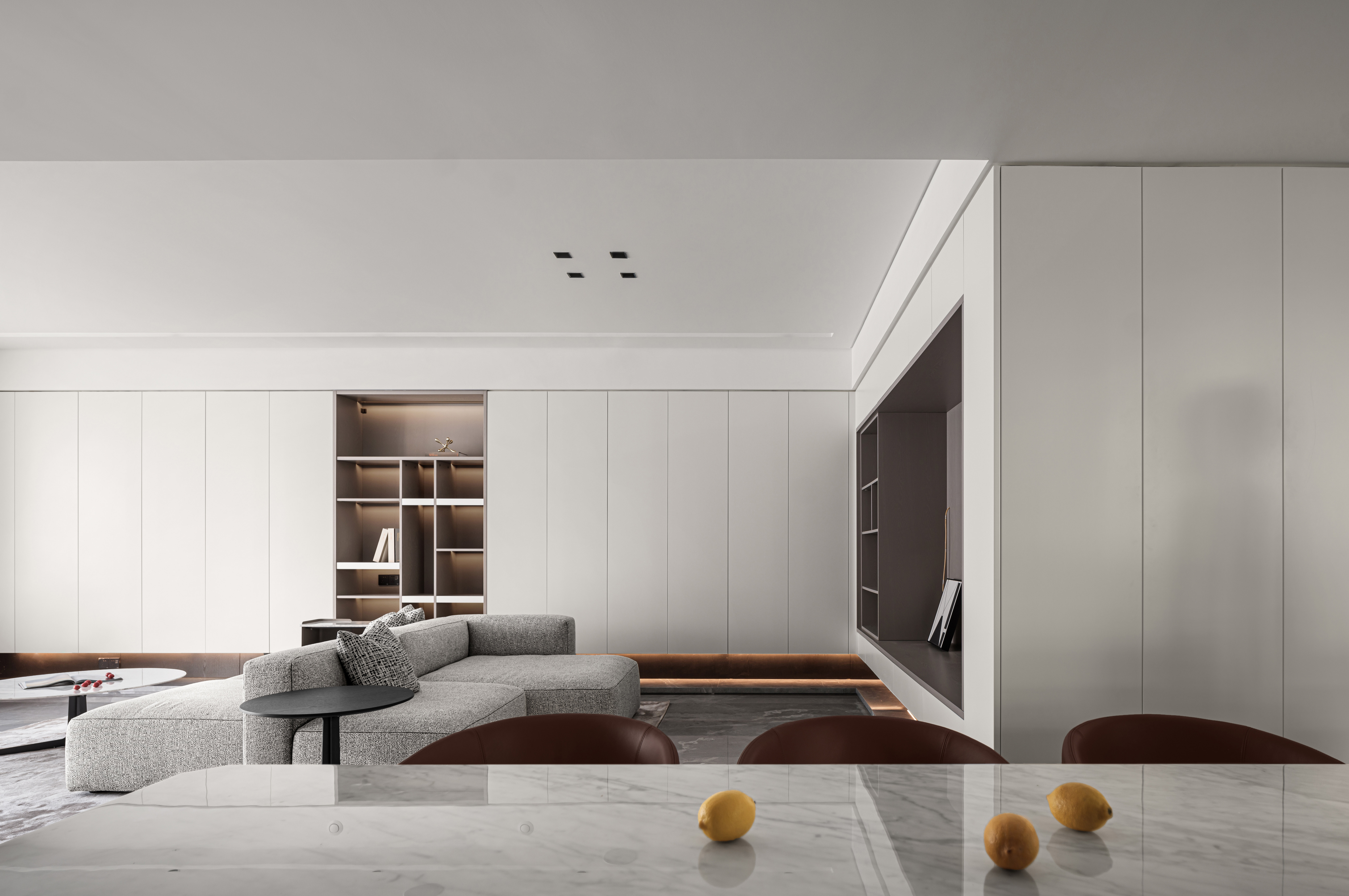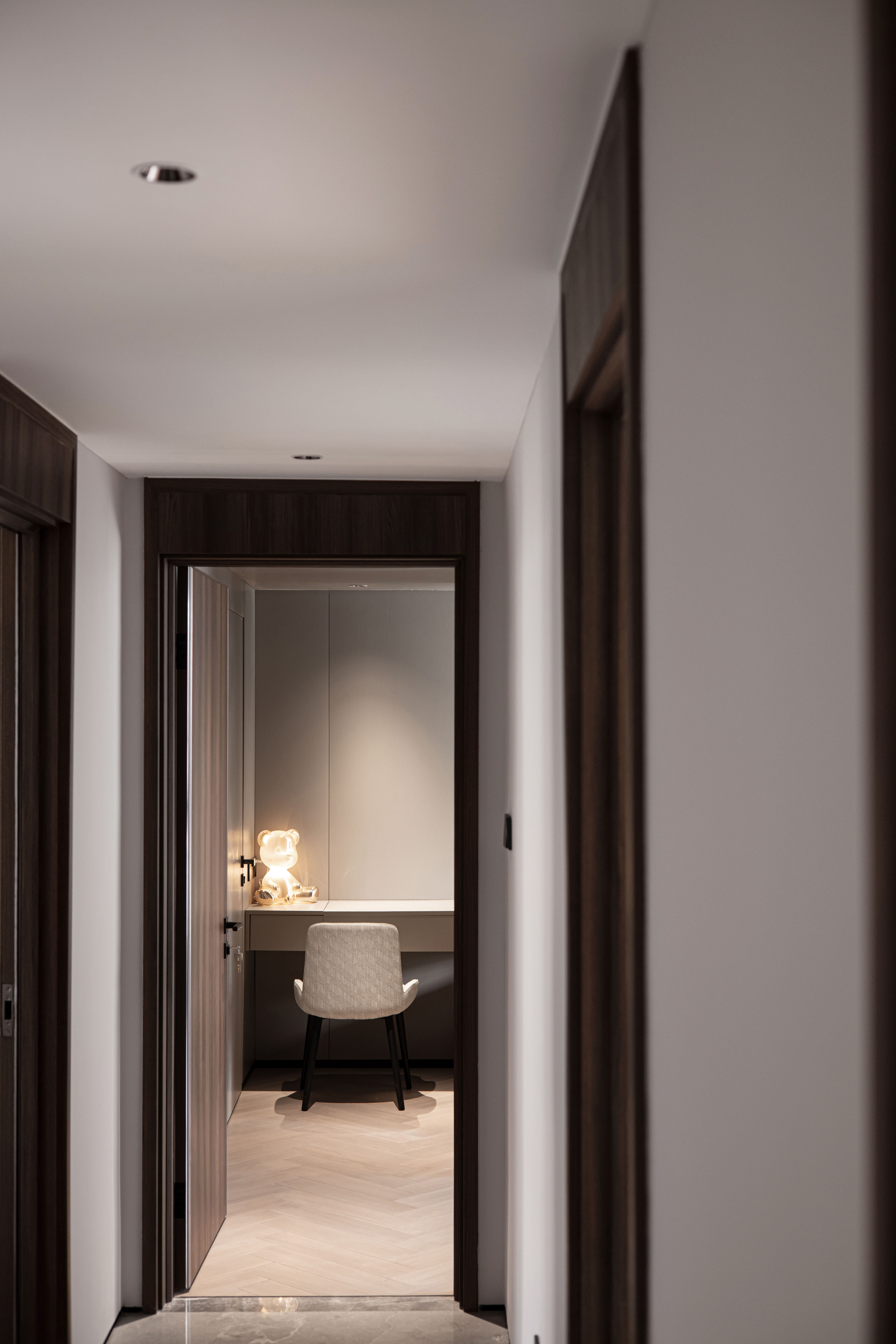 白色烤漆木饰面从门口一直延伸到茶台,把原本采光较弱的整体空间进行一个提亮,地面通铺灰色地砖做为整个空间基底,白色烤漆和咖色染色木皮贯穿整个空间。为居者量身定制的合适的基调,在平凡空间里,过平凡温暖的日子,才是最美的。