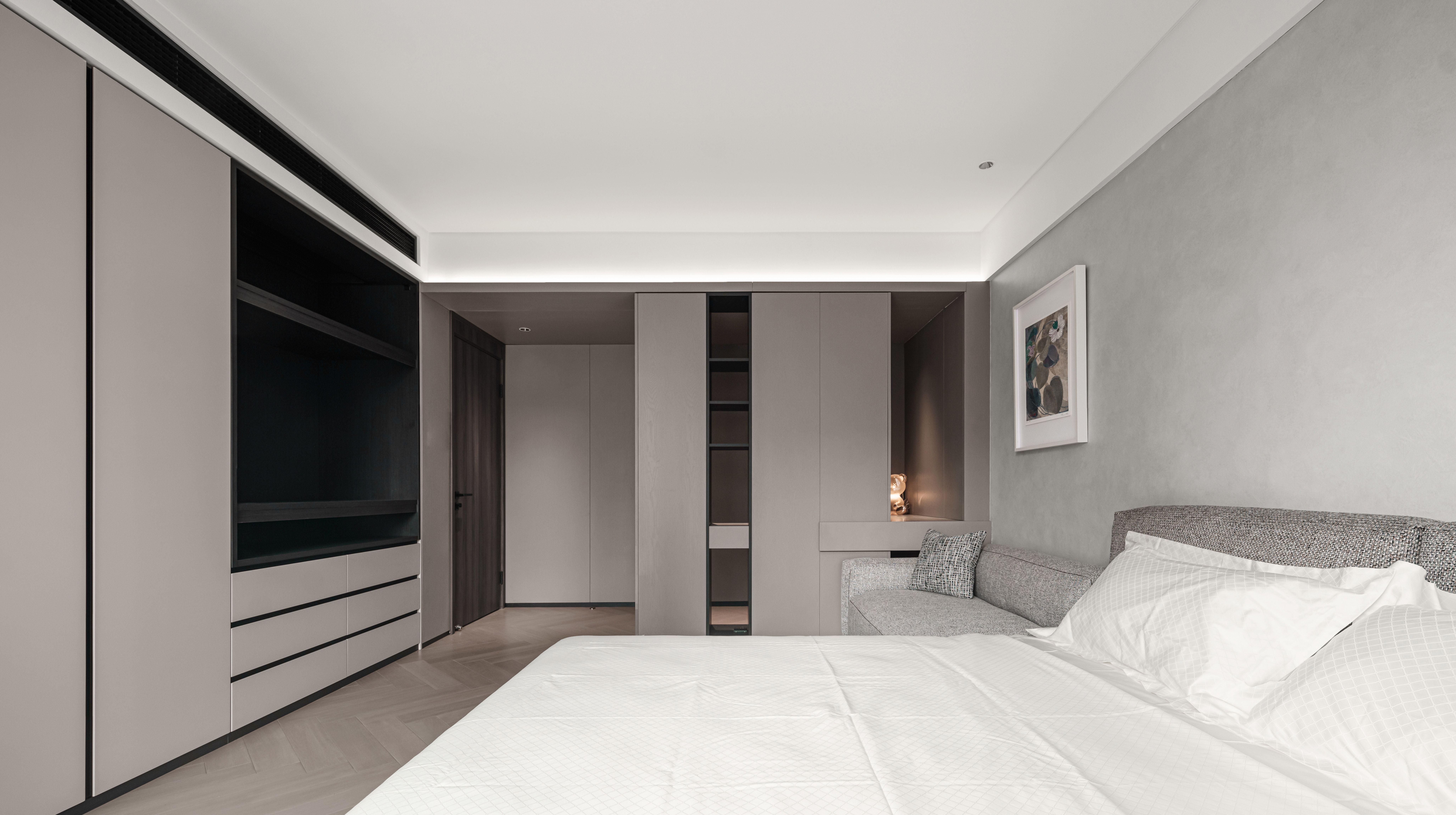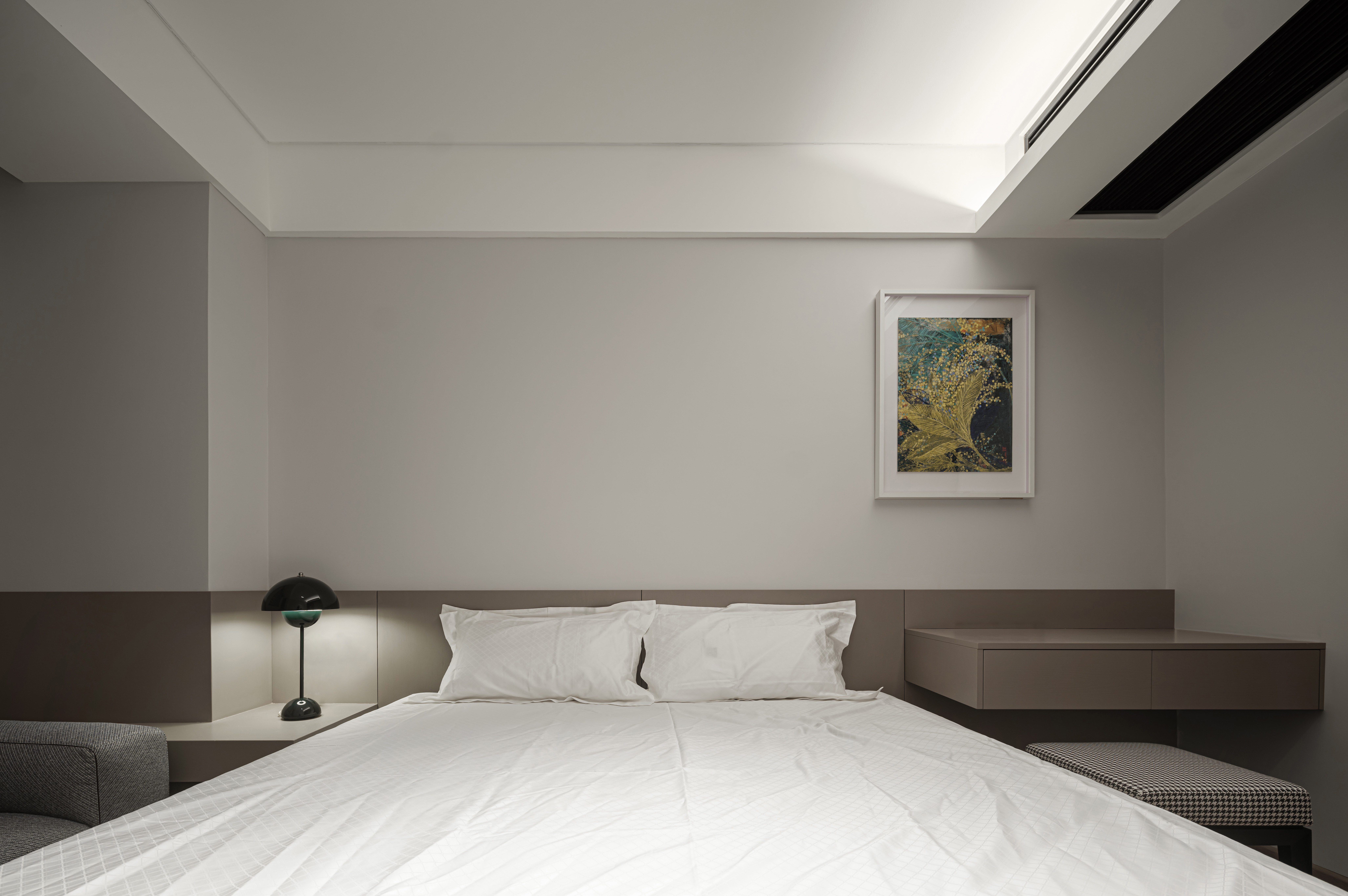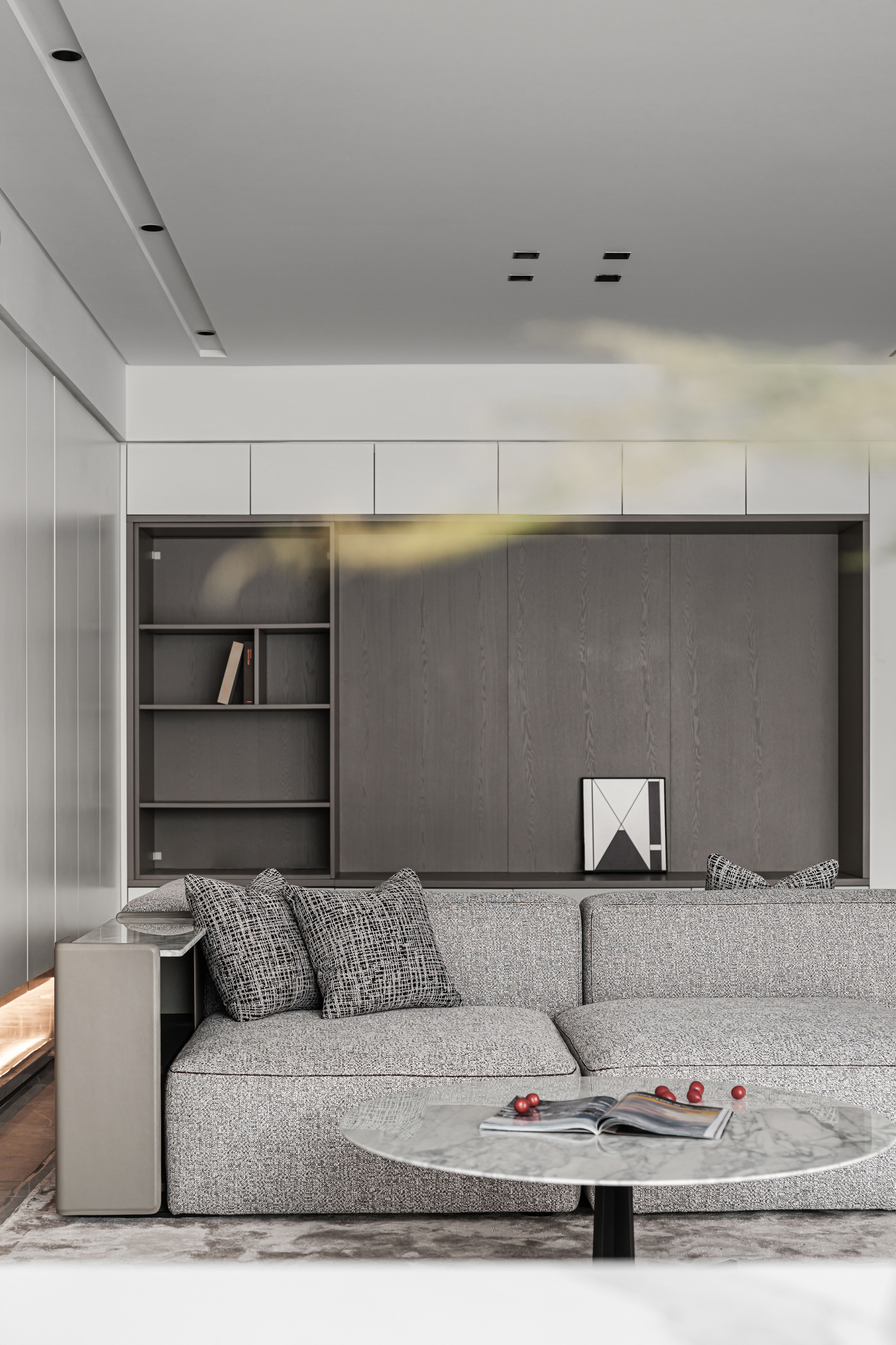 白色烤漆木饰面从门口一直延伸到茶台,把原本采光较弱的整体空间进行一个提亮,地面通铺灰色地砖做为整个空间基底,白色烤漆和咖色染色木皮贯穿整个空间。为居者量身定制的合适的基调,在平凡空间里,过平凡温暖的日子,才是最美的。