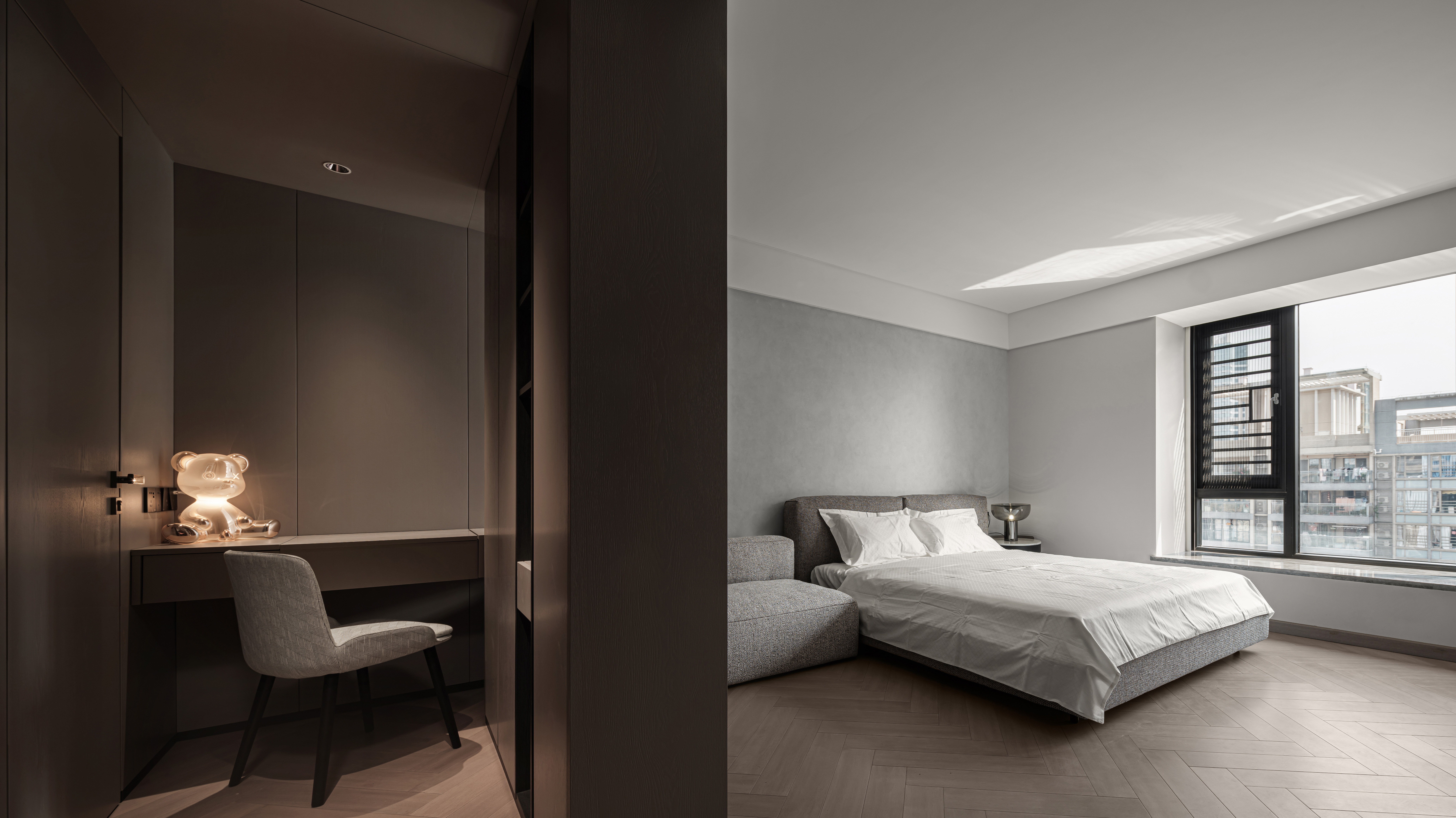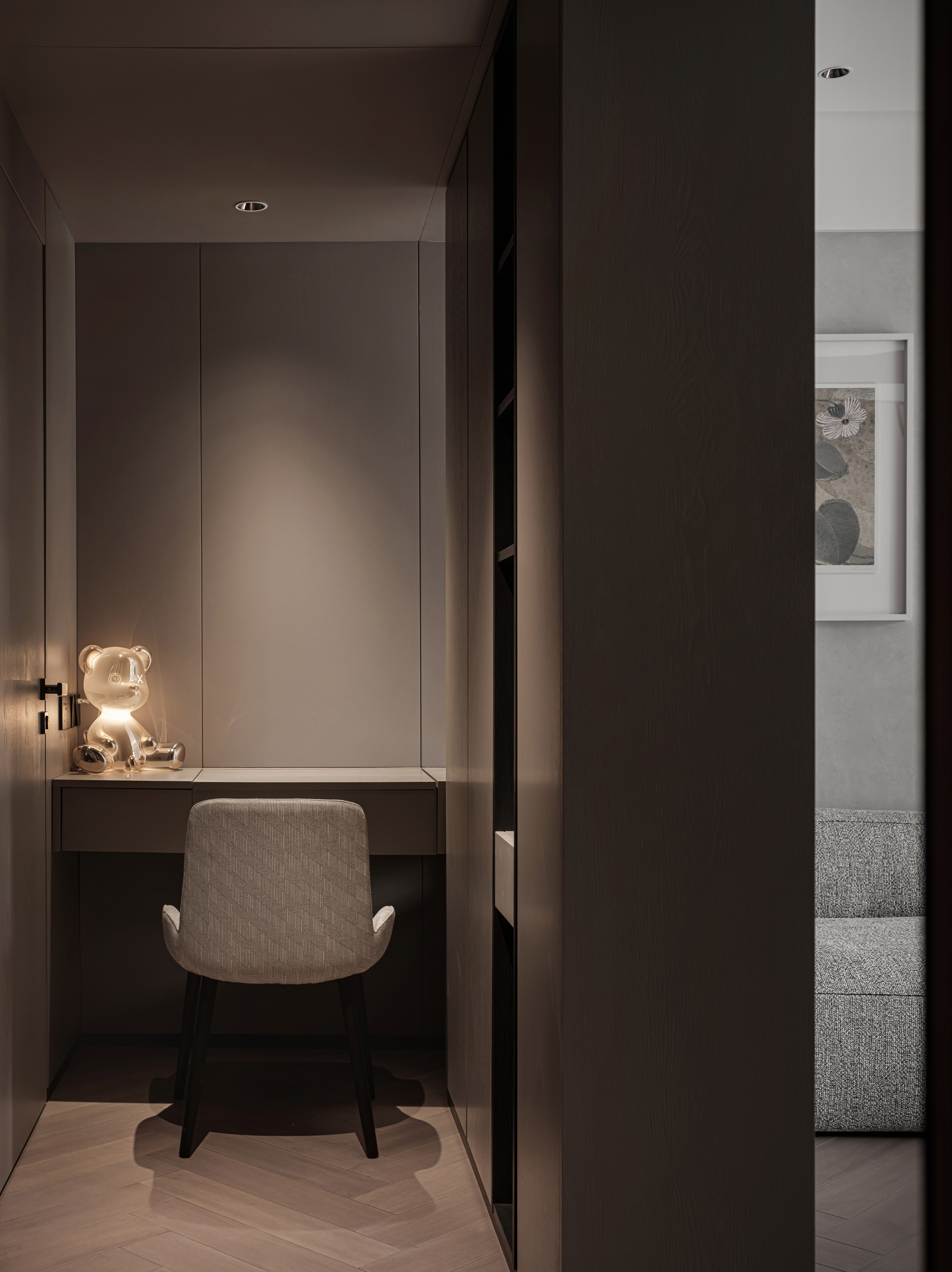 不被定义的功能分区,是远离热闹城市的一处安静空间,是温暖的、美好且愉悦的。设计师在本案中尽可能克制得以平凡之物呈现“家”的日常本质,在优雅的基调中体现出温暖的人性关怀,亲子陪伴”是孩童家庭教育中最重要的环节。因此,业主希望在这里为孩子营造尽可能高质量的学习、陪伴和居住的场所。