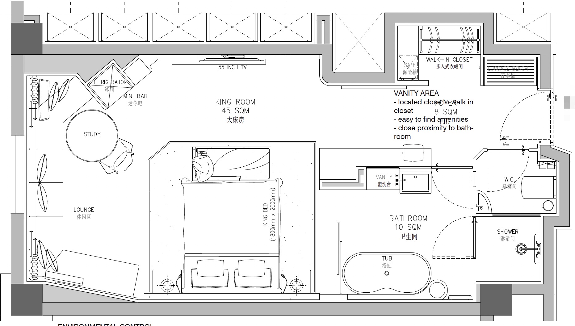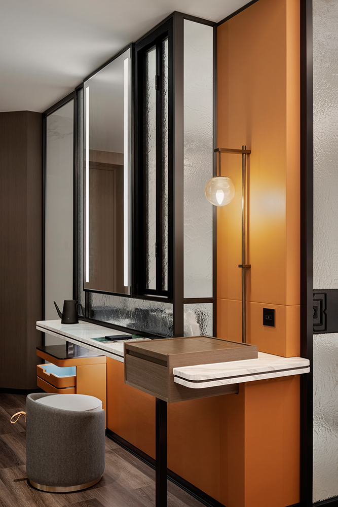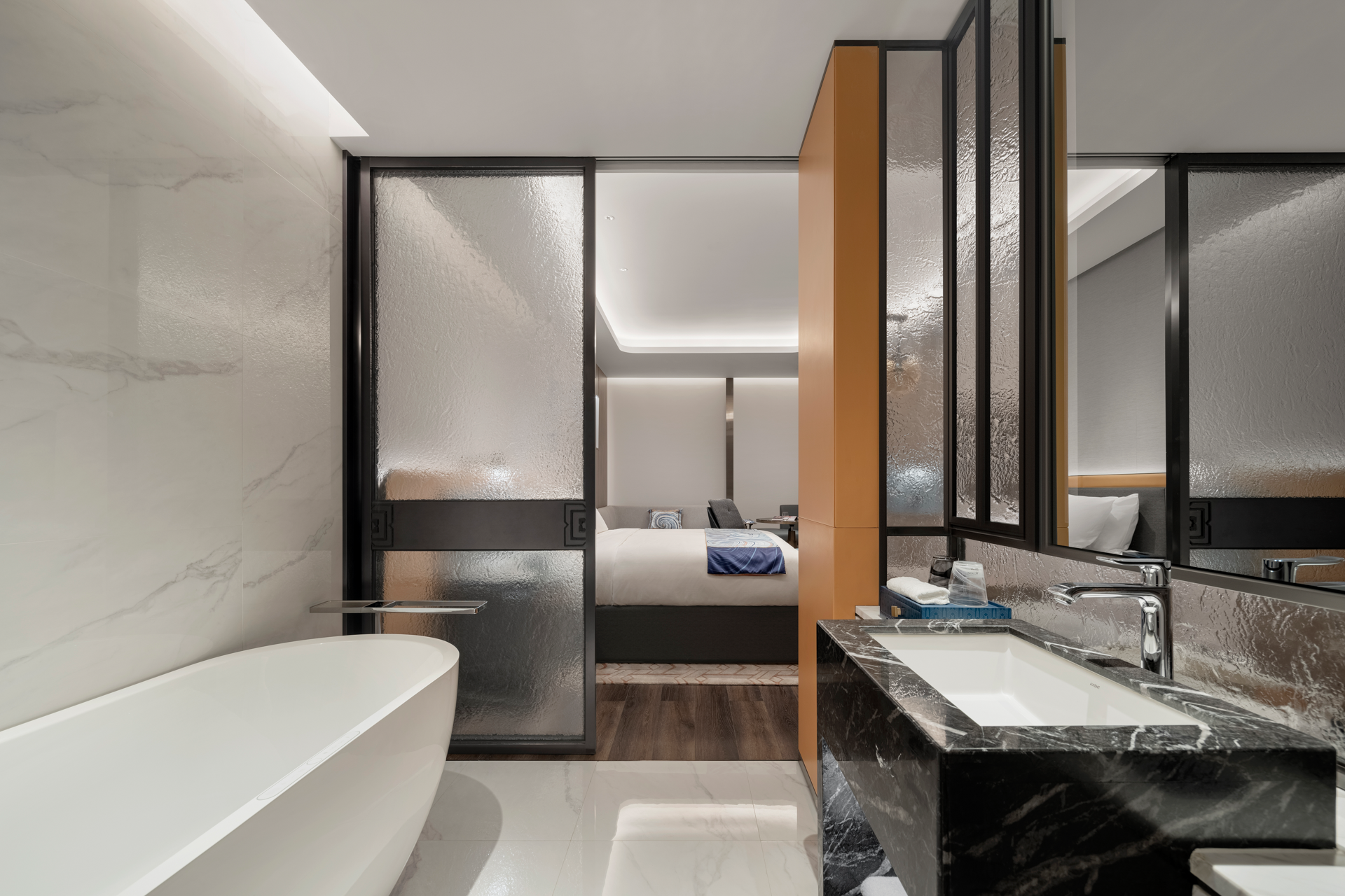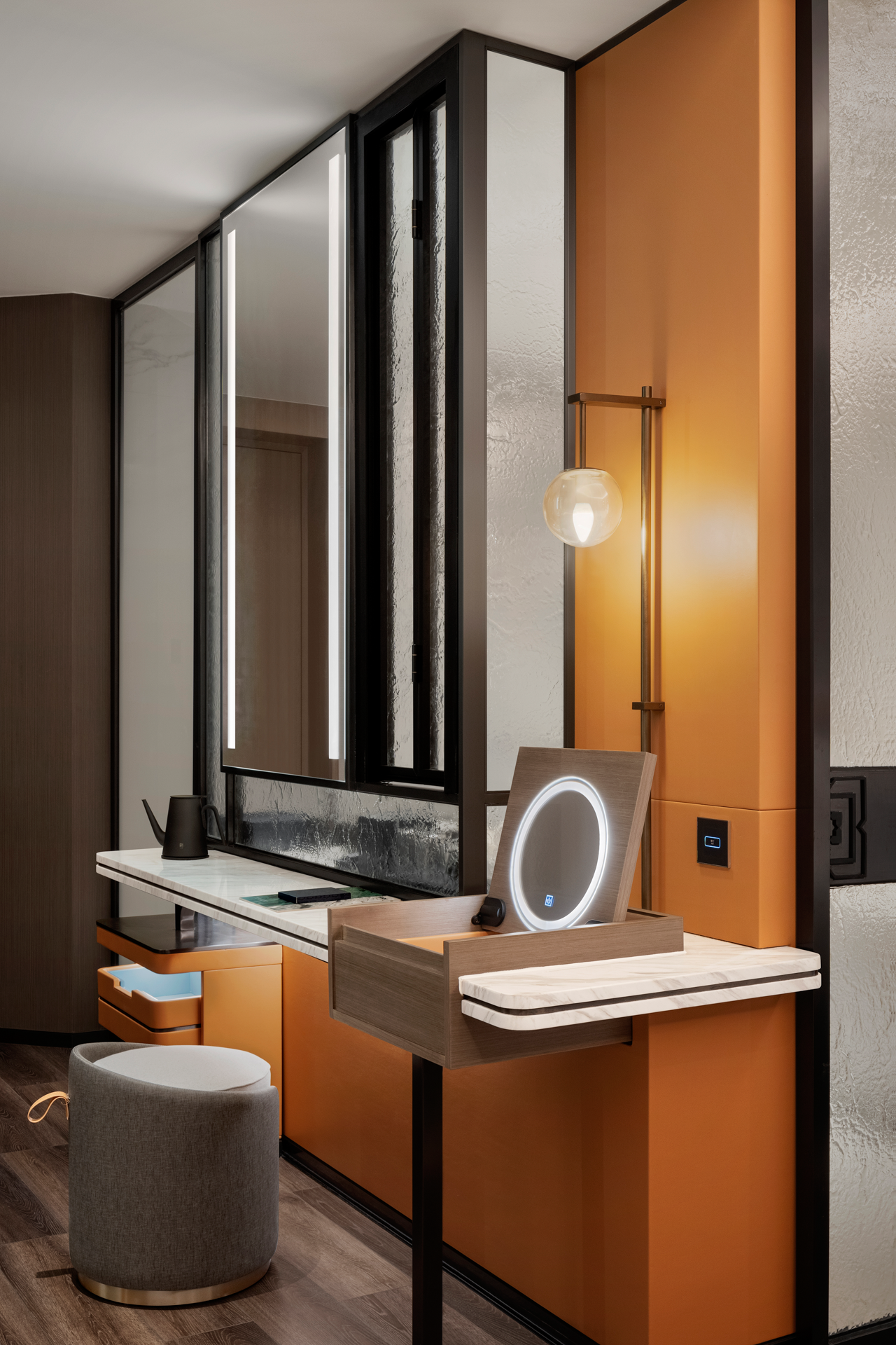 设计选材:客房区域使用符合商务格调大气内敛的基础色配上些许调色打造。客房内部主要分为三个空间,靠近大门的是第一空间,由衣帽间、走道空间和卫生间组成,配有为金茂专门打造的能反映健康数据的“魔镜”、私密又宽敞的盥洗空间,它旨在让刚经历疲惫旅途的客人得到放松身心的效果,给他们补充能量,帮助他们焕然一新。第二空间是睡眠休息空间,科技的辅助使得休息变得更加灵活与享受。靠窗的第三空间是个灵活的空间,客人们可以在此工作、娱乐或是与世界交流,同时迷你吧的设置保证了零食和饮料的配备齐全。