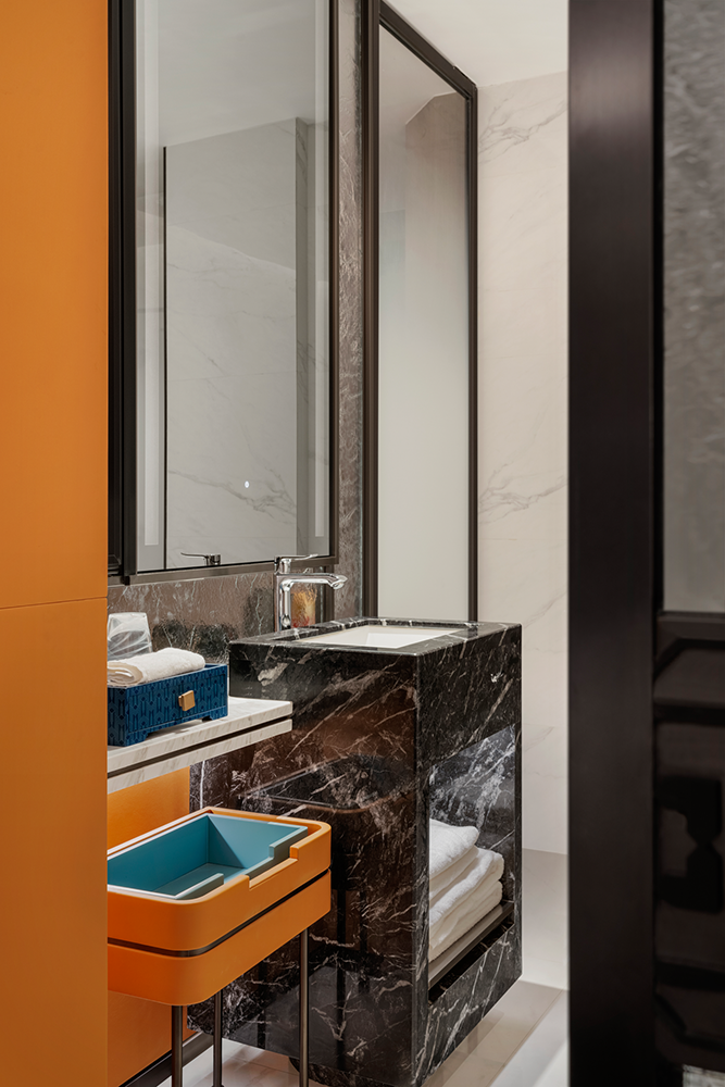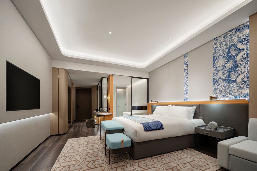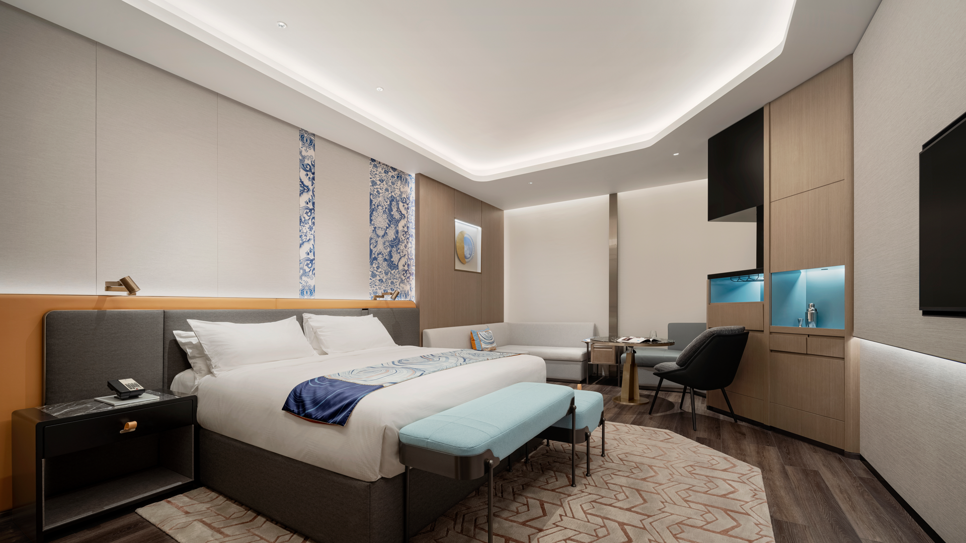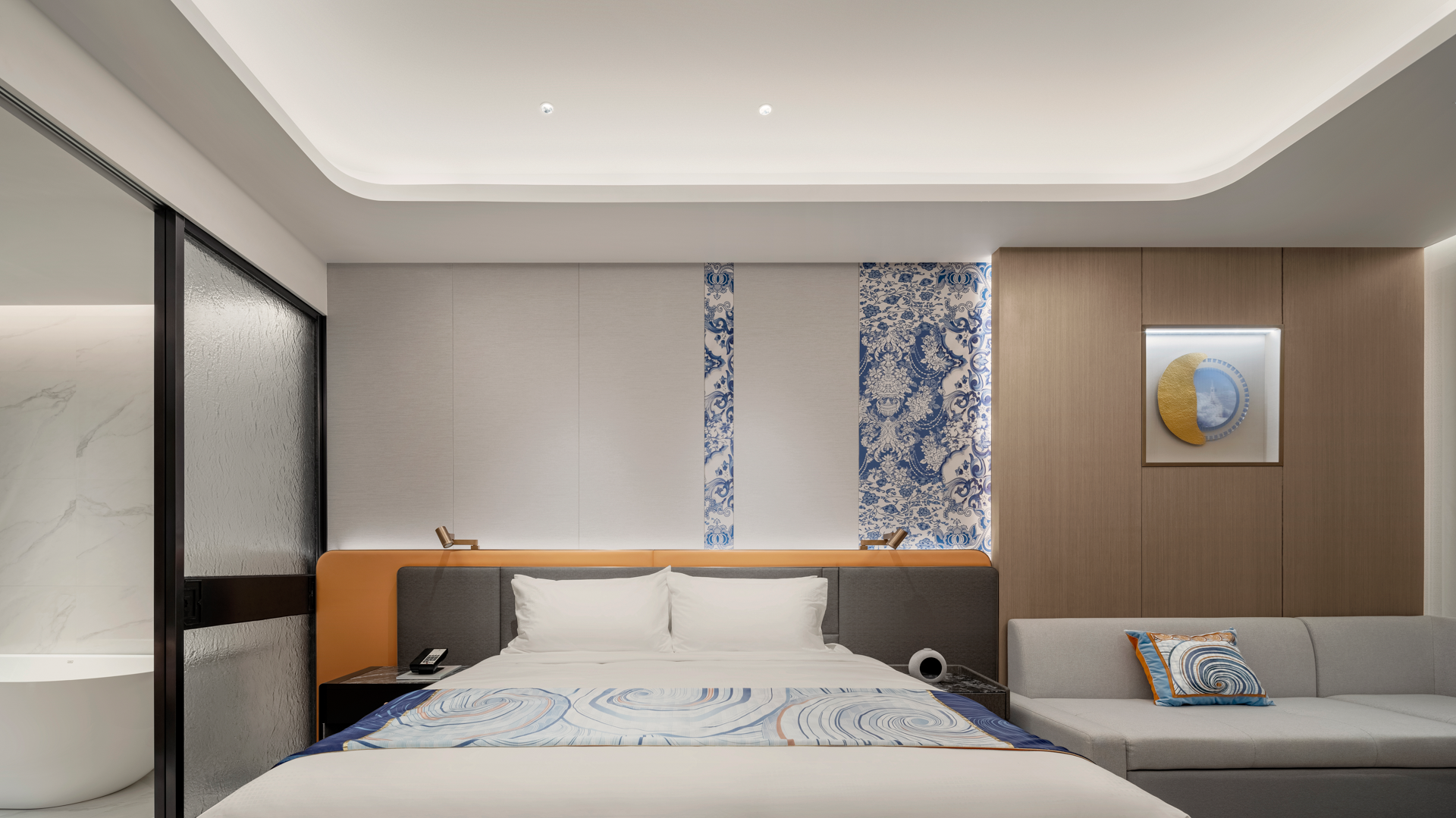 设计选材:客房区域使用符合商务格调大气内敛的基础色配上些许调色打造。客房内部主要分为三个空间,靠近大门的是第一空间,由衣帽间、走道空间和卫生间组成,配有为金茂专门打造的能反映健康数据的“魔镜”、私密又宽敞的盥洗空间,它旨在让刚经历疲惫旅途的客人得到放松身心的效果,给他们补充能量,帮助他们焕然一新。第二空间是睡眠休息空间,科技的辅助使得休息变得更加灵活与享受。靠窗的第三空间是个灵活的空间,客人们可以在此工作、娱乐或是与世界交流,同时迷你吧的设置保证了零食和饮料的配备齐全。