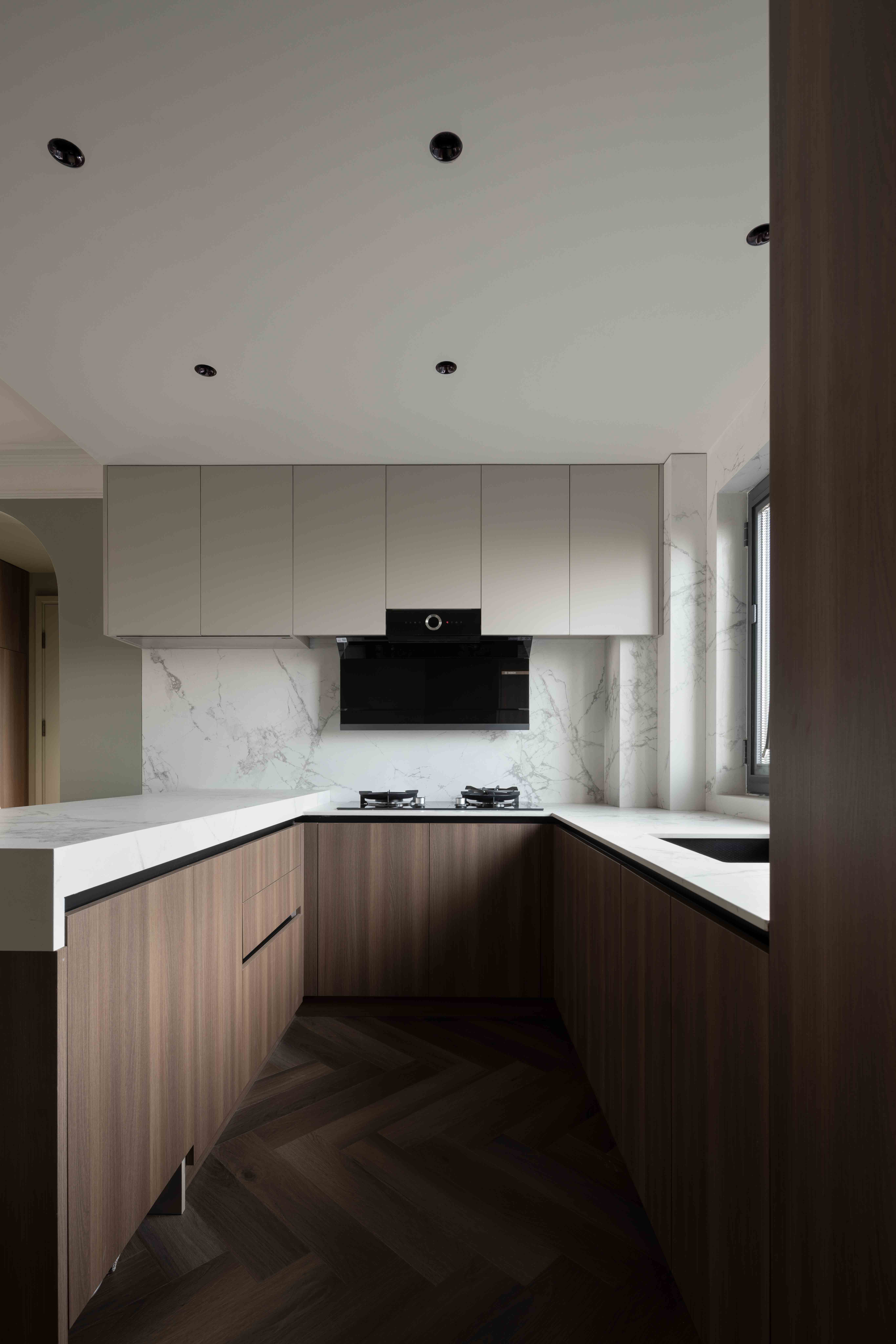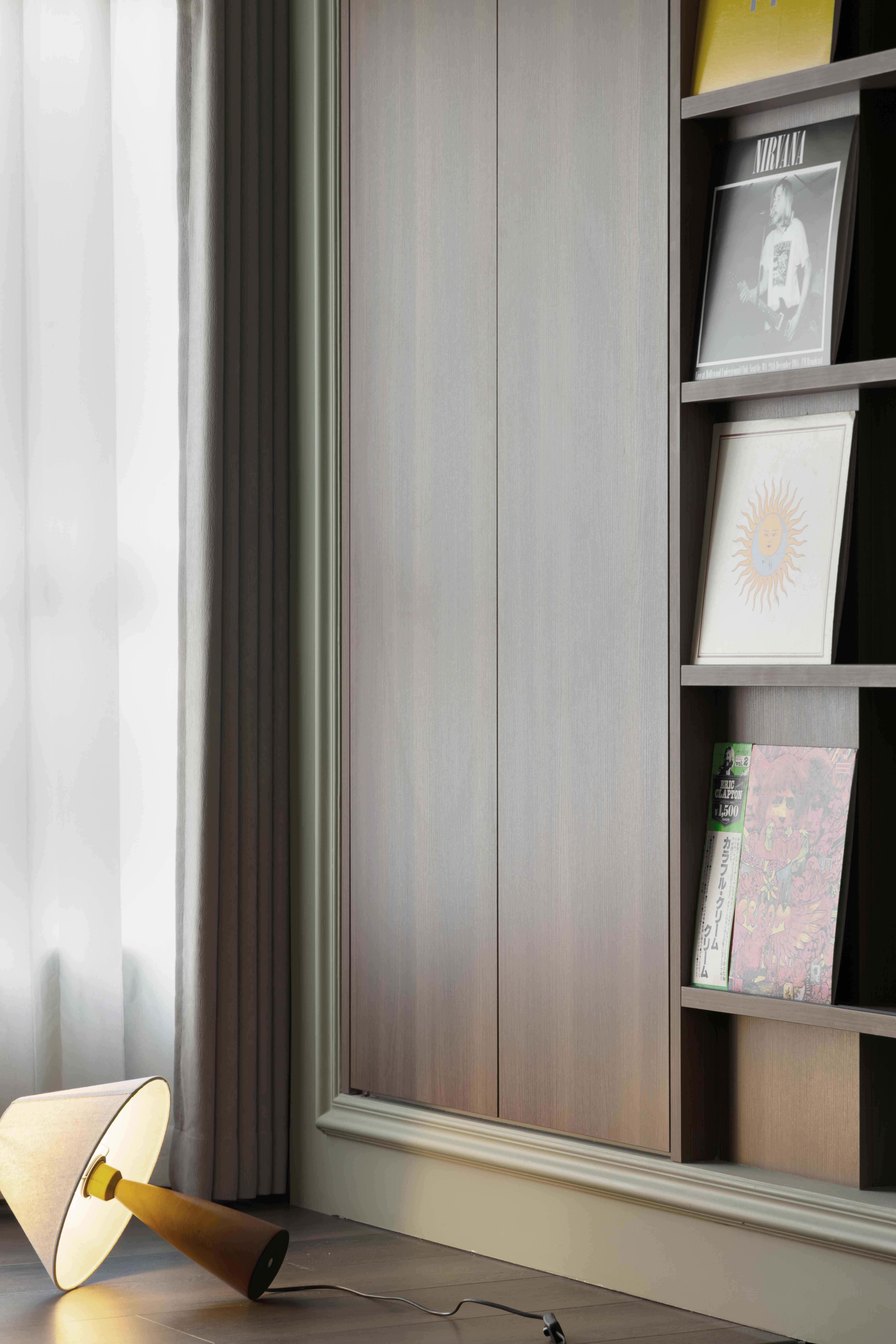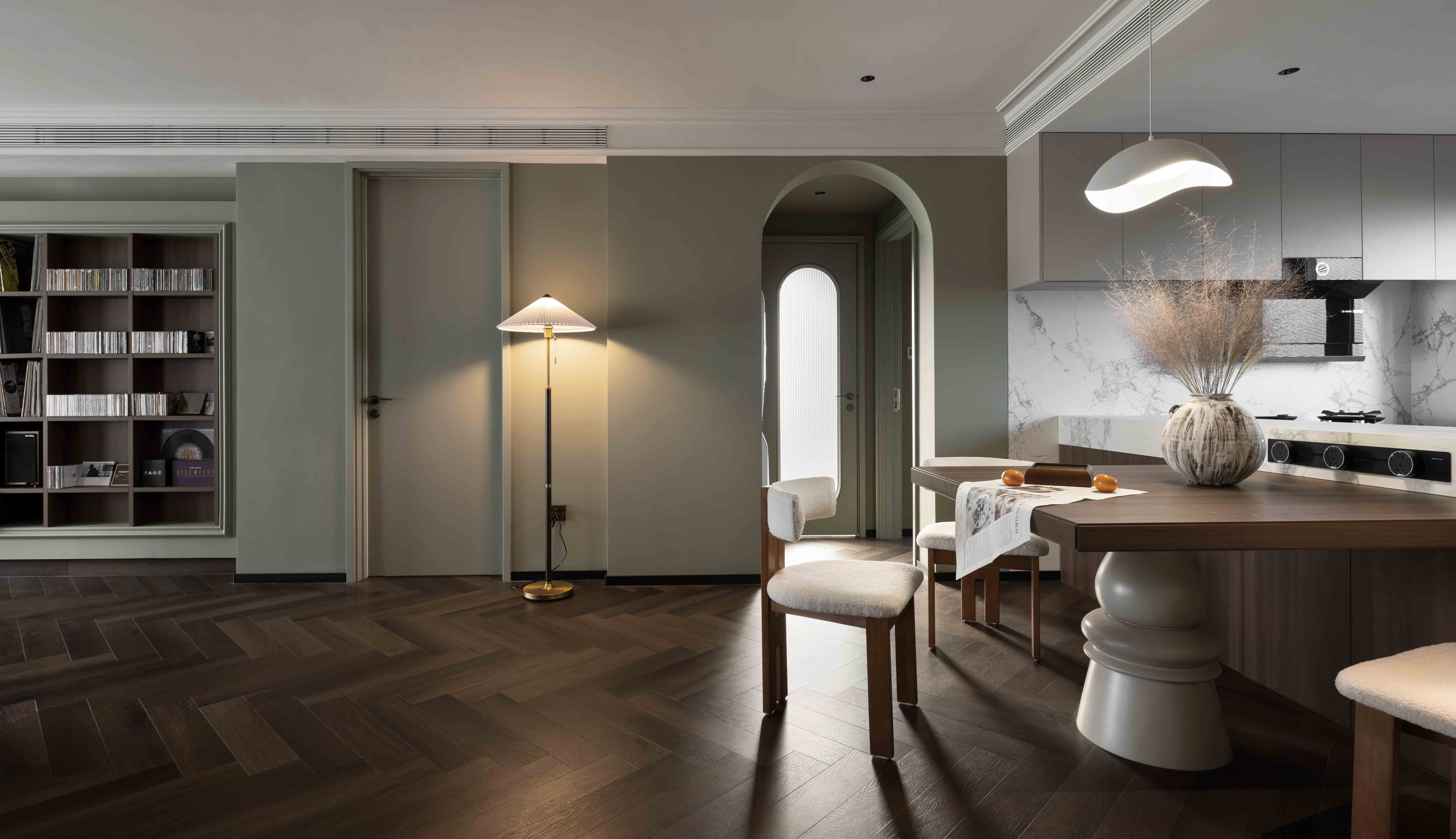 为节省全屋定制的造假,全部采用双饰面板做柜体,同时保留复古的基调。