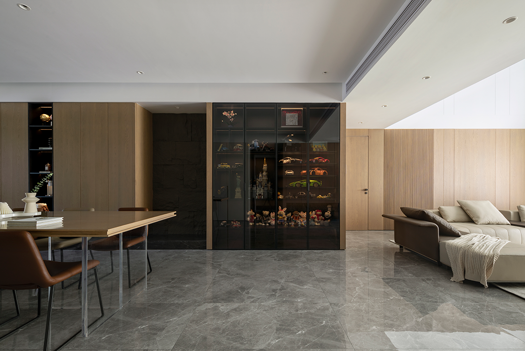 设计选材:石皮、木饰面等不同材质的填充,赋予空间动态多元,多元的材质、细腻的表达,质感与氛围十足。暖色木材的映衬,让空间柔和宁静,传递平实单纯的温暖质感。点、线、面的穿插,让空间层次有度;空间软装的留白,让空间的使用自由度大幅提升。